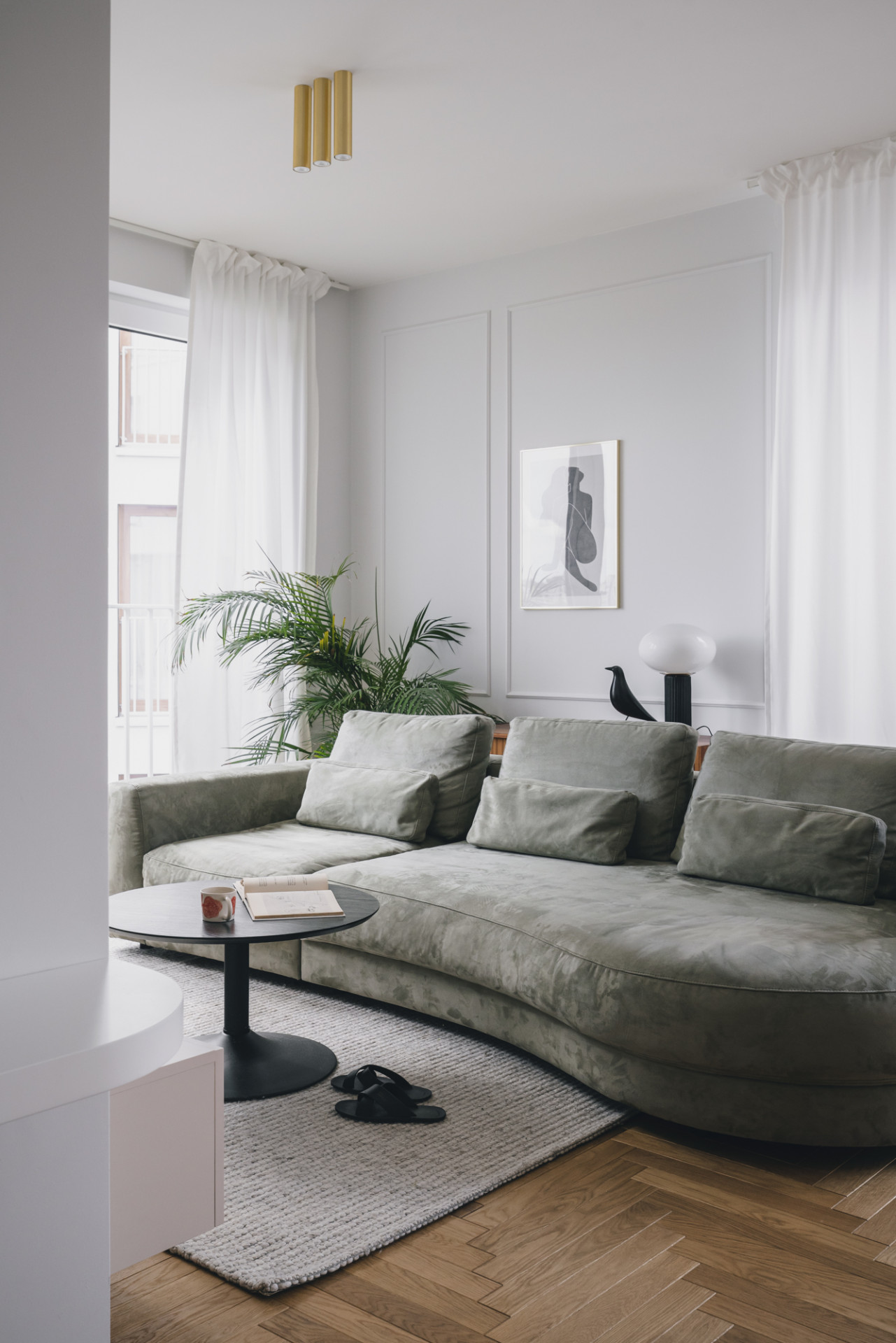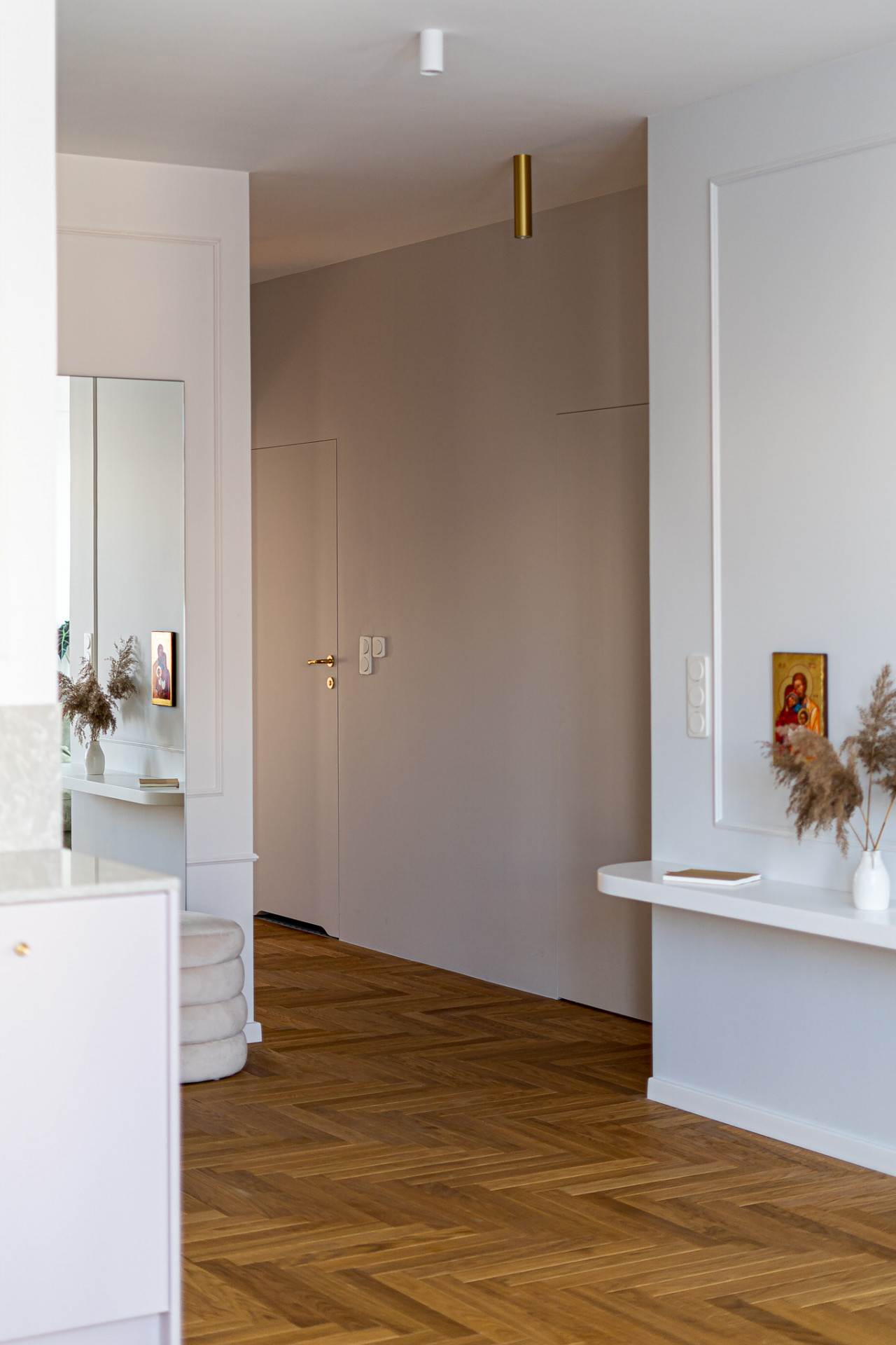 Pro práci Natalii Mielczarek-Prym je charakteristický hravý přístup a otevřenost vůči neobvyklým barevným kombinacím. Ve varšavském bytě proto převažují pastelové barvy, které doplňují masivní dřevěné kousky vintage nábytku a zlaté detaily.