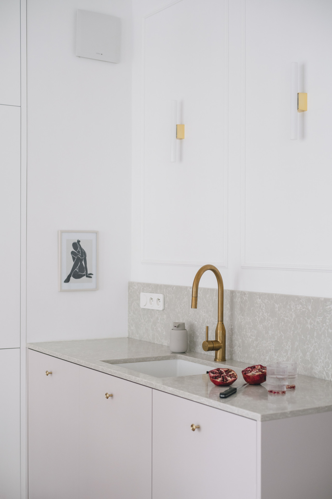 Růžová kuchyně jako šperk. V bytě od polské designérky převažují pastelové barvy