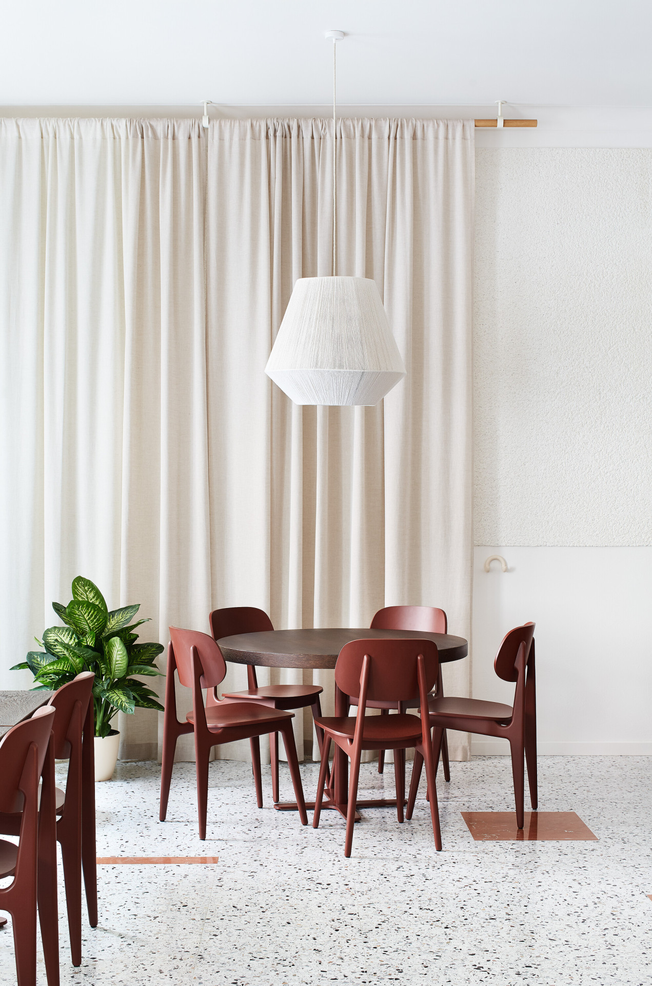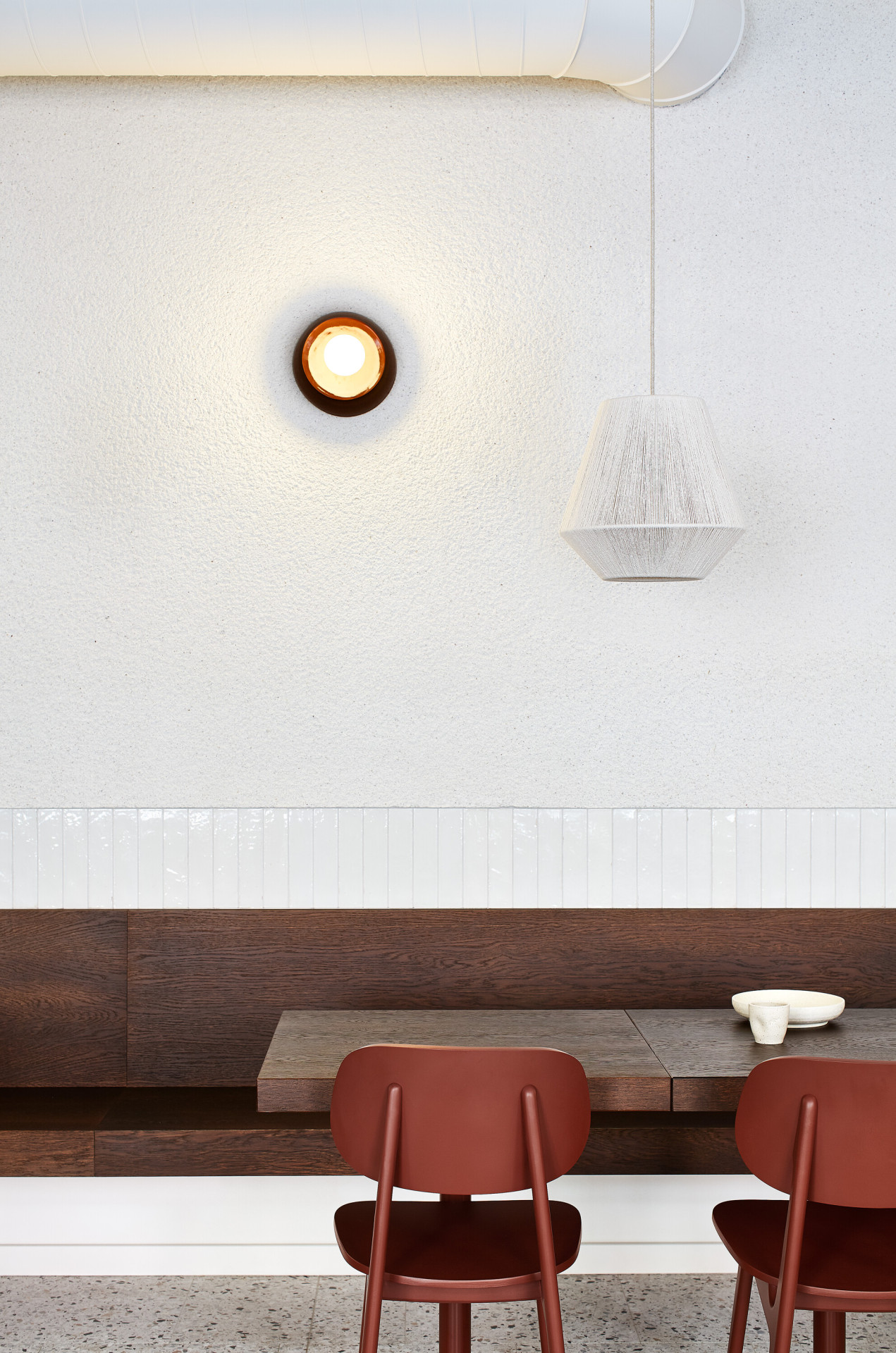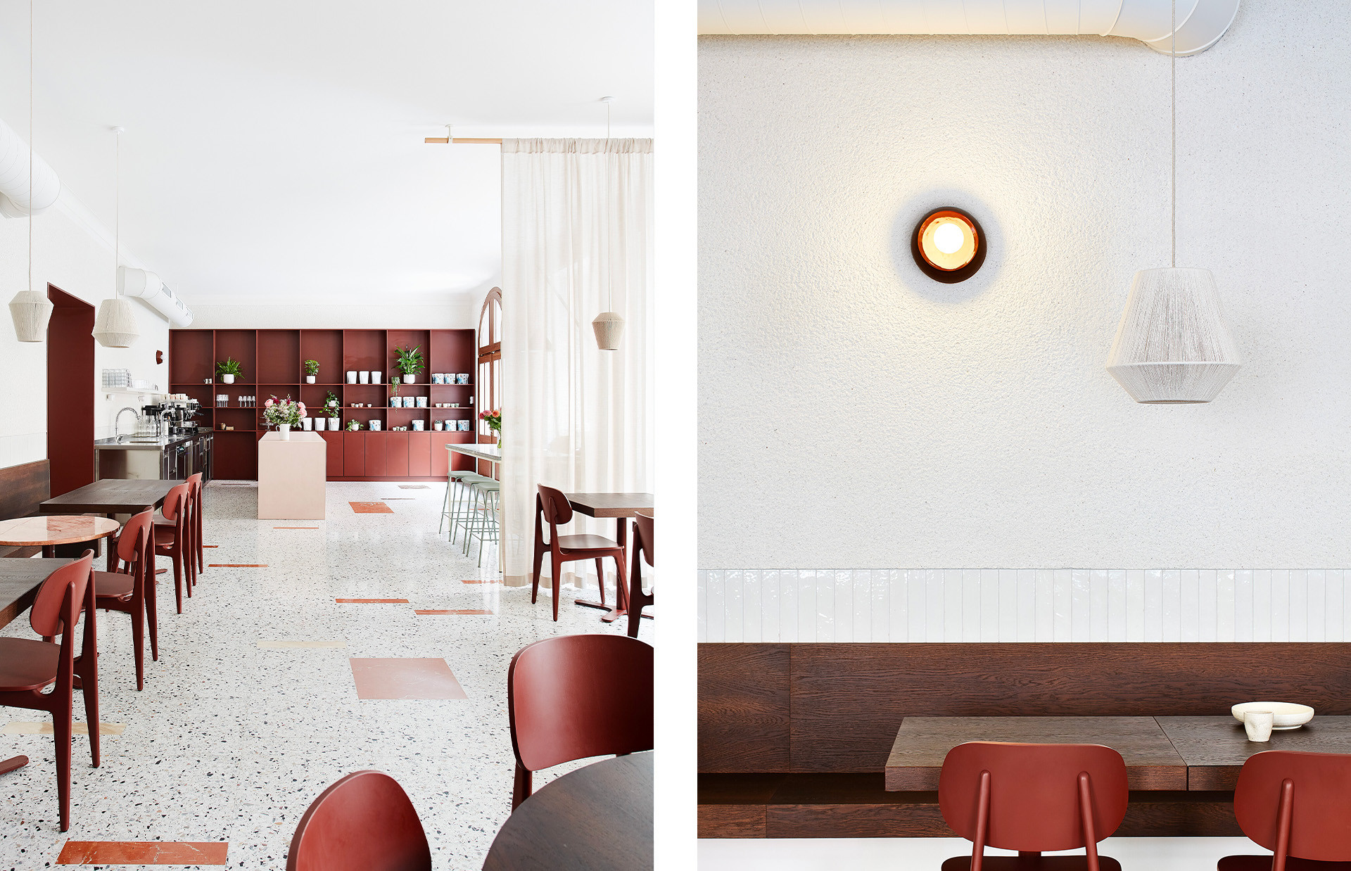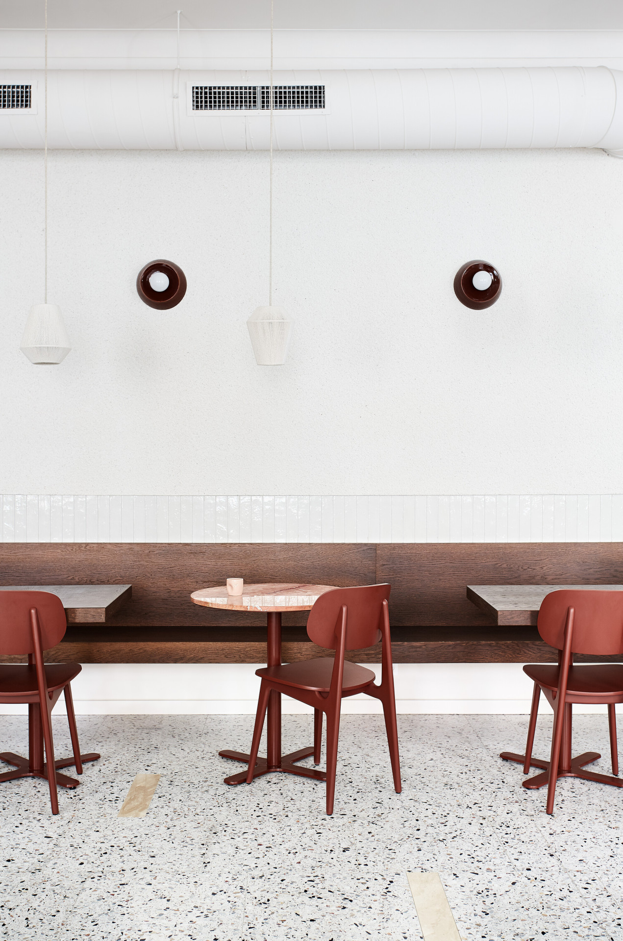 Sjednocujícím prvkem celého interiéru je červenohnědý odstín. Dýchá na vás odevšad, z mramoru na podlaze, z velké nábytkové stěny hned vedle vstupu, při výhledu ven barva rámuje okna. Tento tón pokračuje na židlích, na stěně v zadní místnosti a také na zdech na toaletách.