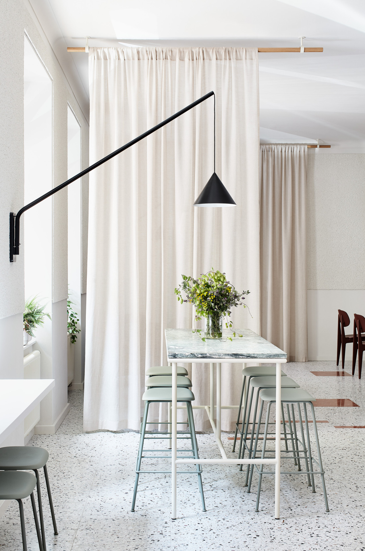 Vnitřní prostor je navržen tak, aby vyhovoval různým potřebám i preferencím návštěvníků, což se odráží nejen v odlišné atmosféře místností, ale i v rozmanité nabídce typů sezení. Autorka navrhuje barové židle u vysokého stolu, kde jste v neustálém kontaktu s kavárenským ruchem. Podél zadní zdi je navržena tzv. „lounge zóna“ s dřevěnými křesly a nízkým stolkem. Klidné místo, kde si můžete vychutnat svou kávu a zároveň mít celý prostor přehledně na očích. Pro návštěvníky, kteří dávají přednost tradičnějšímu posezení, jsou připravena klasická místa u stolů umístěných v prostoru u okna.