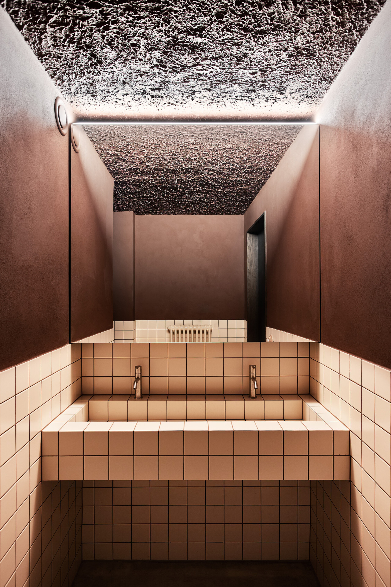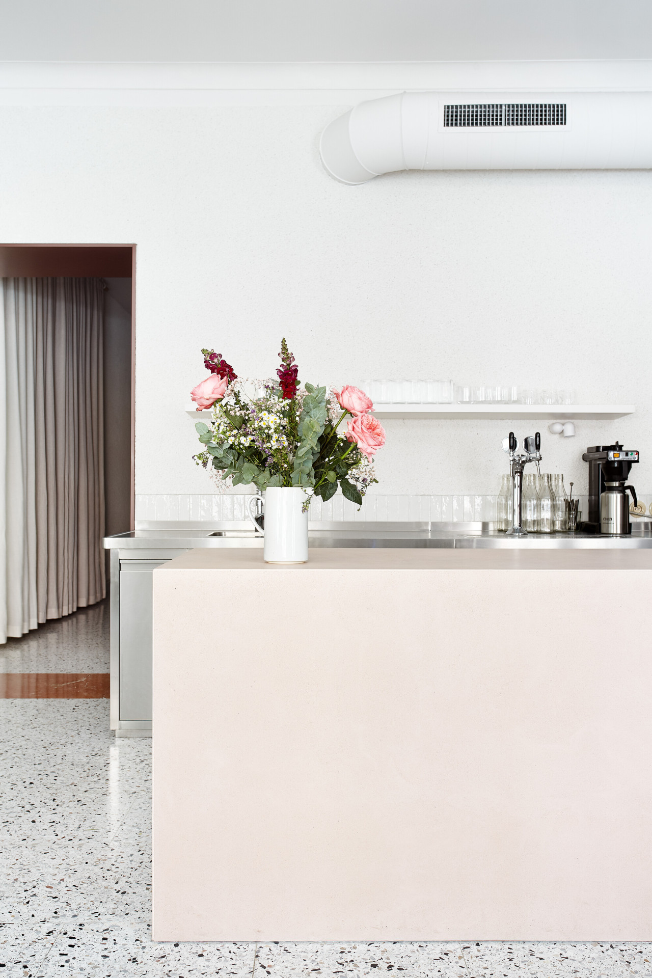 Tmavší odstíny v interiéru doplňuje barový ostrůvek z růžového betonu. „Jeho design jsme vytvořily s cílem vnést do prostoru nádech ženskosti, avšak díky ostrým hranám působí pevně a nepoddajně,“ říkají autorky návrhu. Z hlediska materiálového pojetí byl ostrůvek navržen jako protiklad k teracové podlaze, čímž vzniká zajímavý dialog.