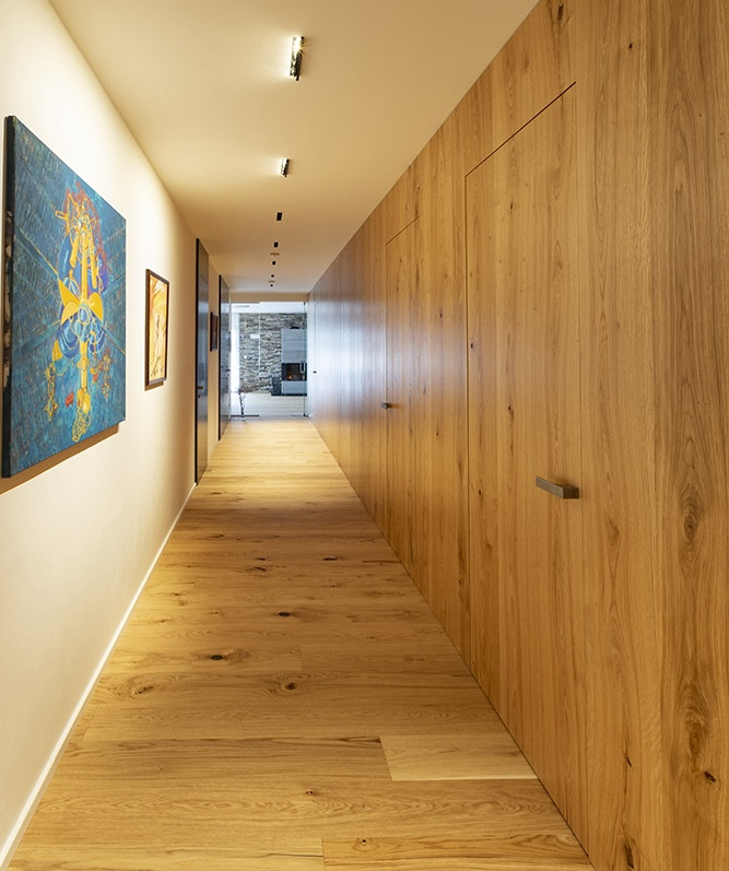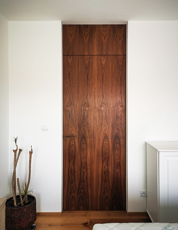 Druhým atraktivním trendem je používání dřevěné dýhy, která je shodná s dýhou na okolním nábytku, soulad v interiéru je pak opravdu dokonalý. Často proto instalujeme dveřní křídla s přírodním nebo sukatým dubem v matném laku nebo oleji.