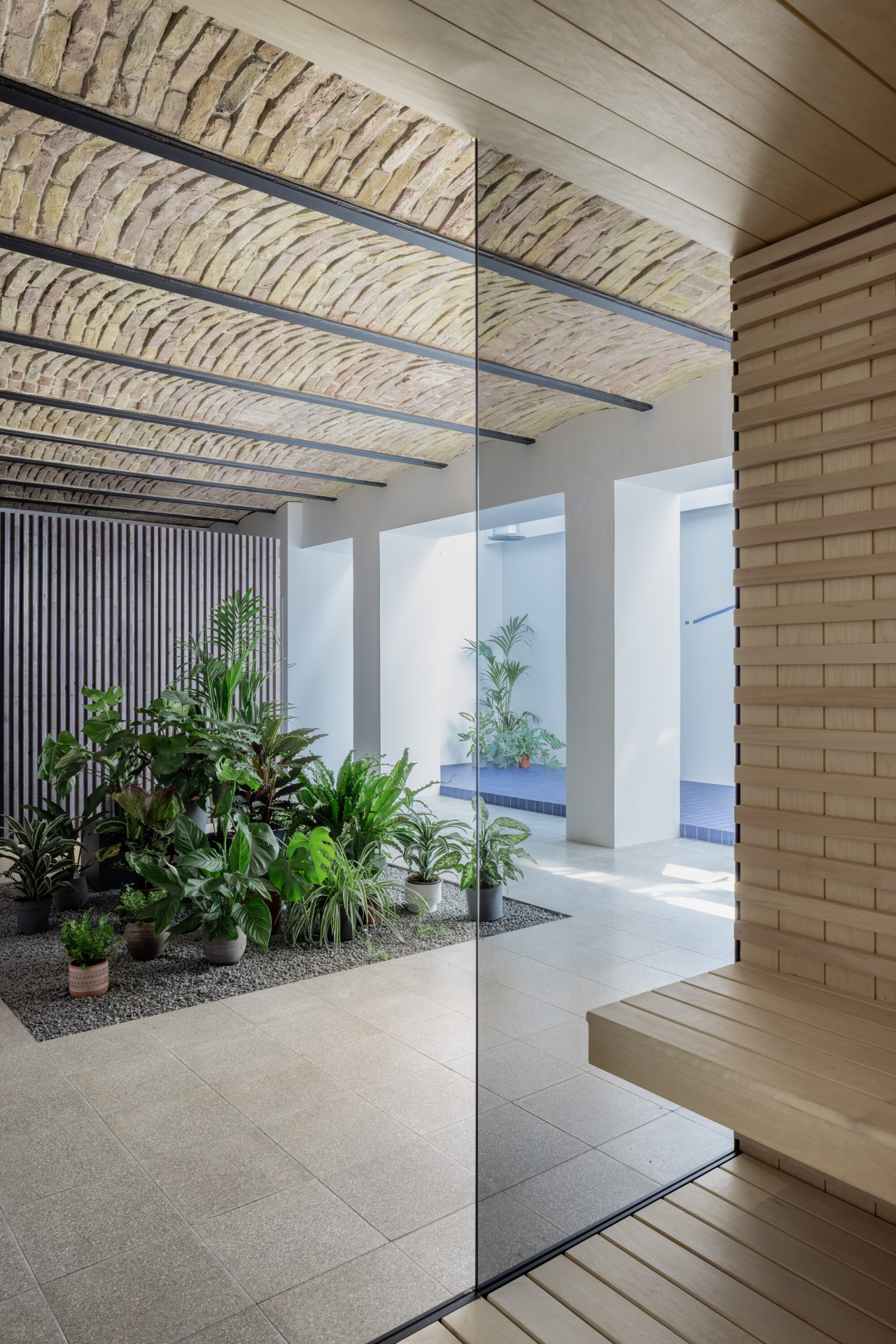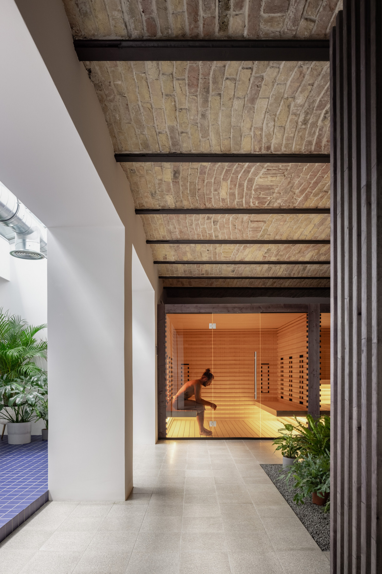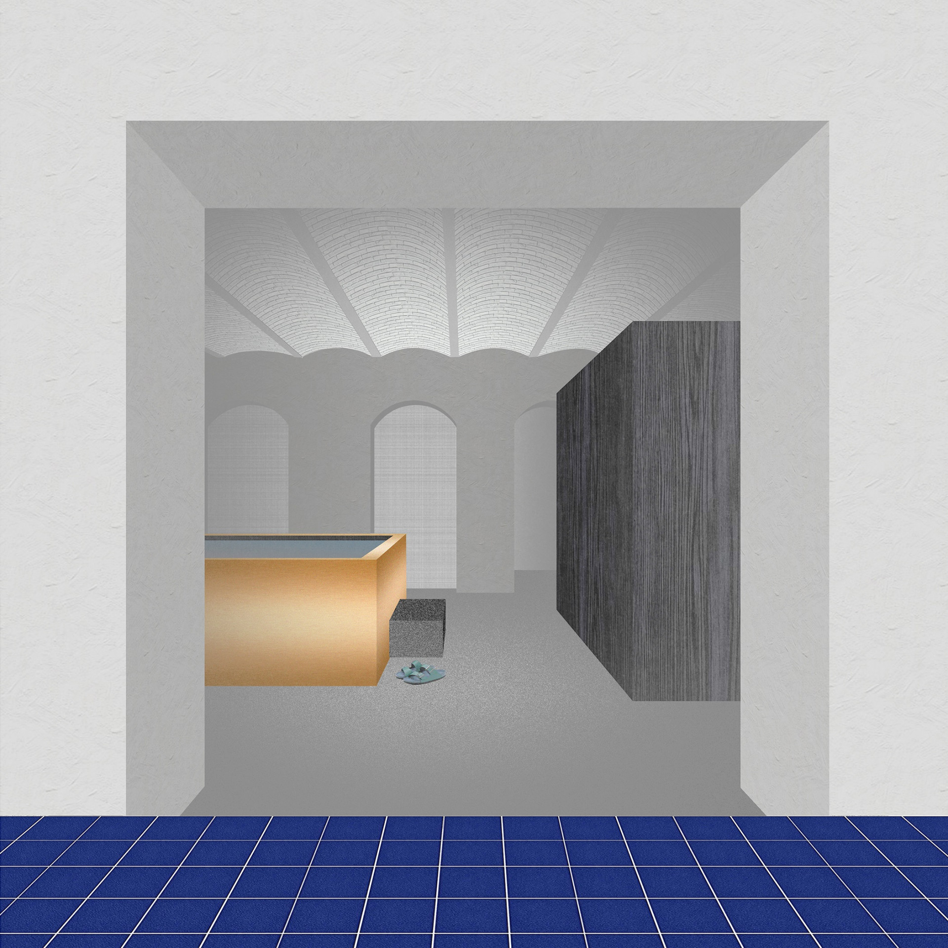 Když návštěvník sejde po masivním betonovém schodišti do suterénu domu v Grösslingové ulici, ocitne se v minimalisticky zařízeném prostoru s posezením, volně stojícím pultem a nenápadným barem pro přípravu občerstvení. Kobaltové obklady s bílými spárami, dřevěné vybavení nebo terazzové podlahy dále prochází i zbytkem interiéru lázní. Výraznější dominantou jsou pak cihlové valené klenby, které zůstaly odhalené a svou hrubostí tak kontrastují s novými hladkými povrchy.