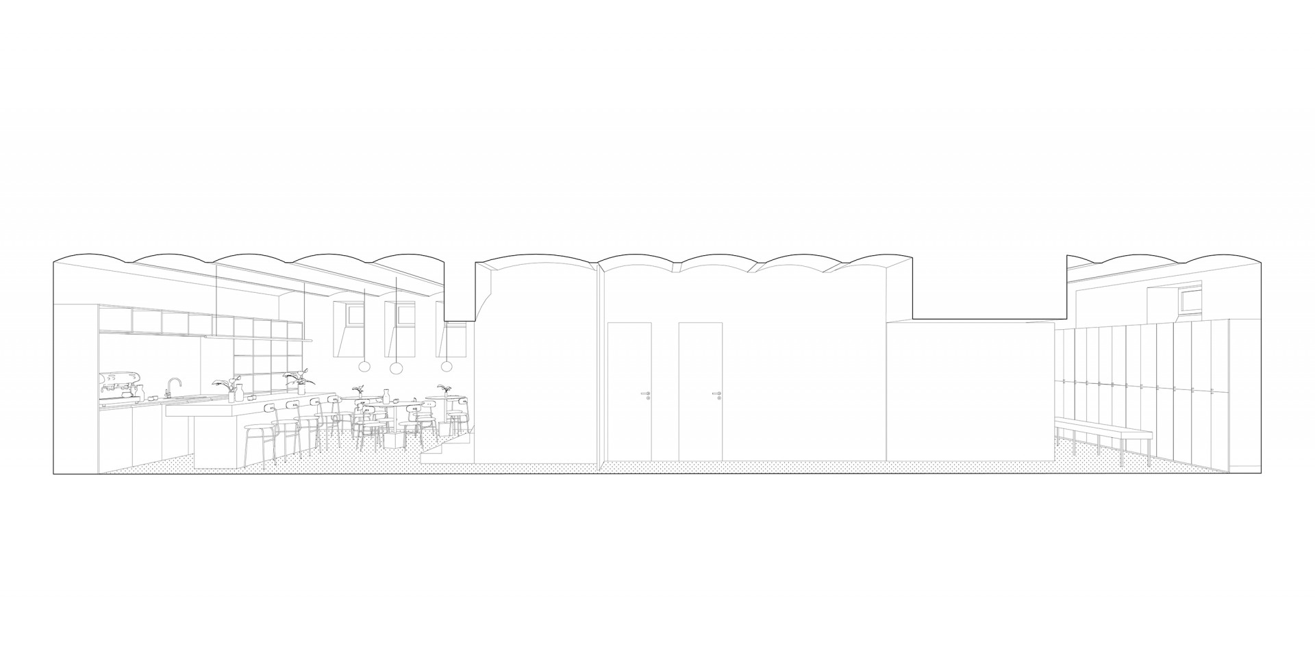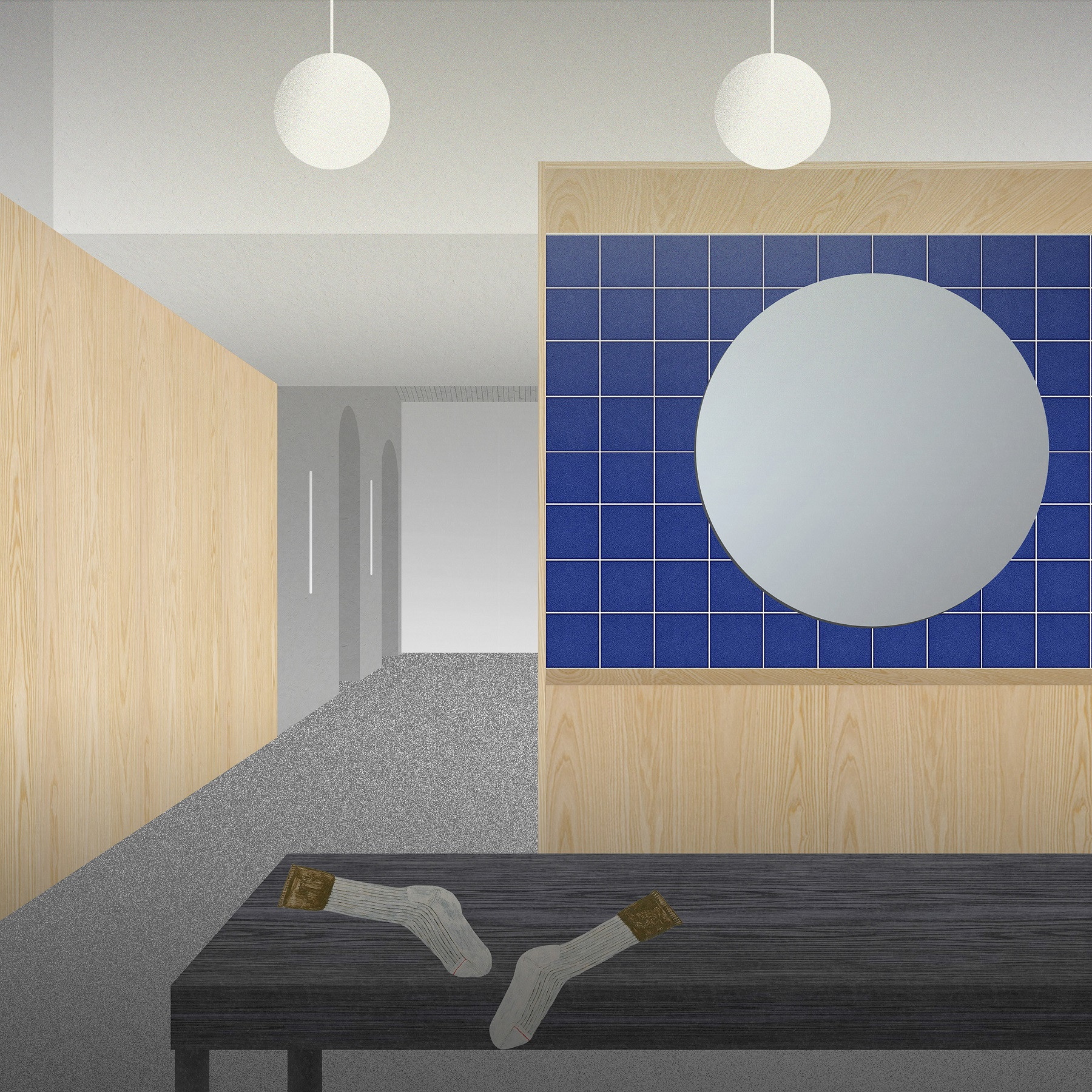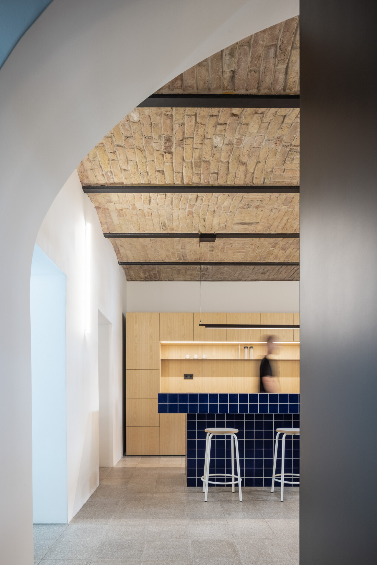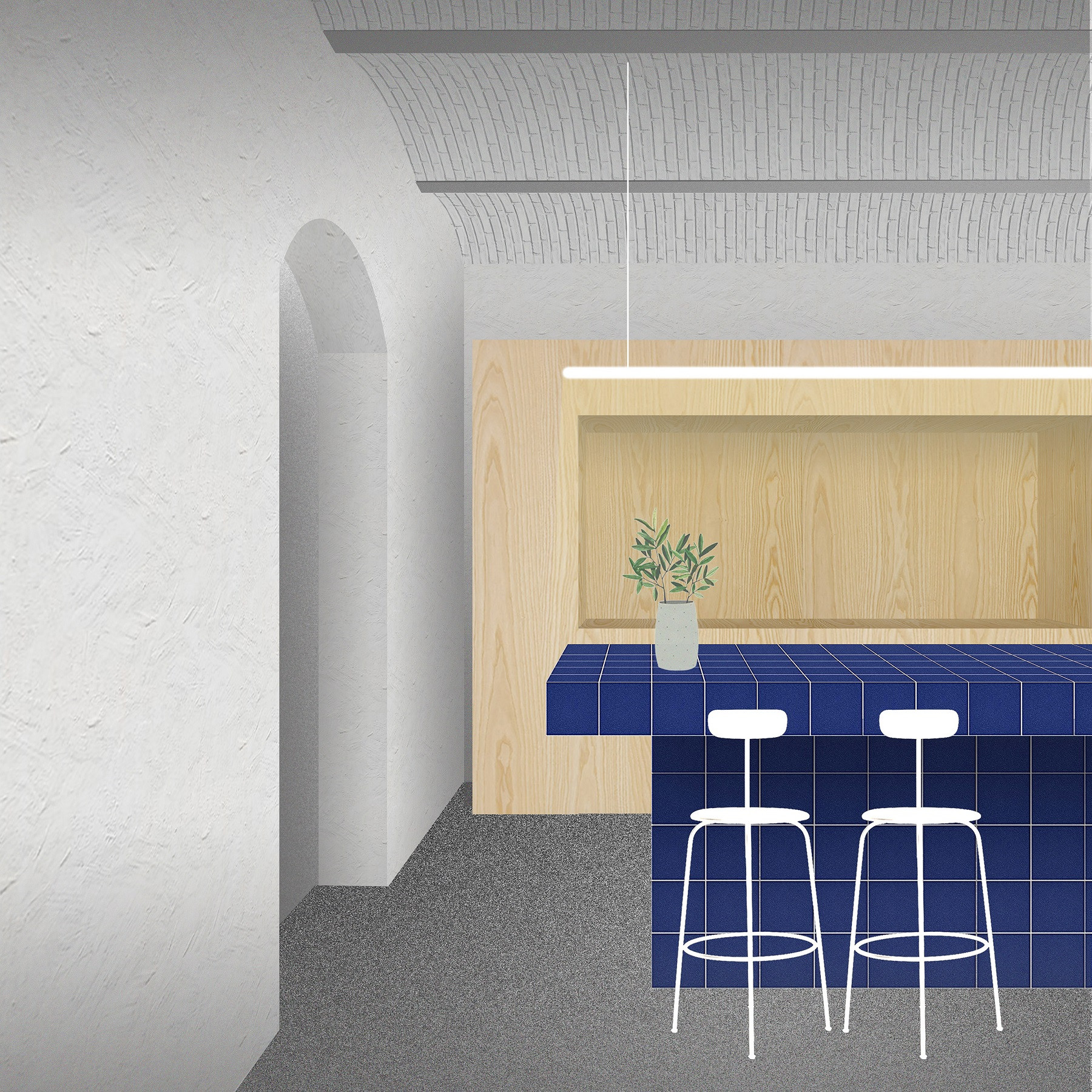 Když návštěvník sejde po masivním betonovém schodišti do suterénu domu v Grösslingové ulici, ocitne se v minimalisticky zařízeném prostoru s posezením, volně stojícím pultem a nenápadným barem pro přípravu občerstvení. Kobaltové obklady s bílými spárami, dřevěné vybavení nebo terazzové podlahy dále prochází i zbytkem interiéru lázní. Výraznější dominantou jsou pak cihlové valené klenby, které zůstaly odhalené a svou hrubostí tak kontrastují s novými hladkými povrchy.