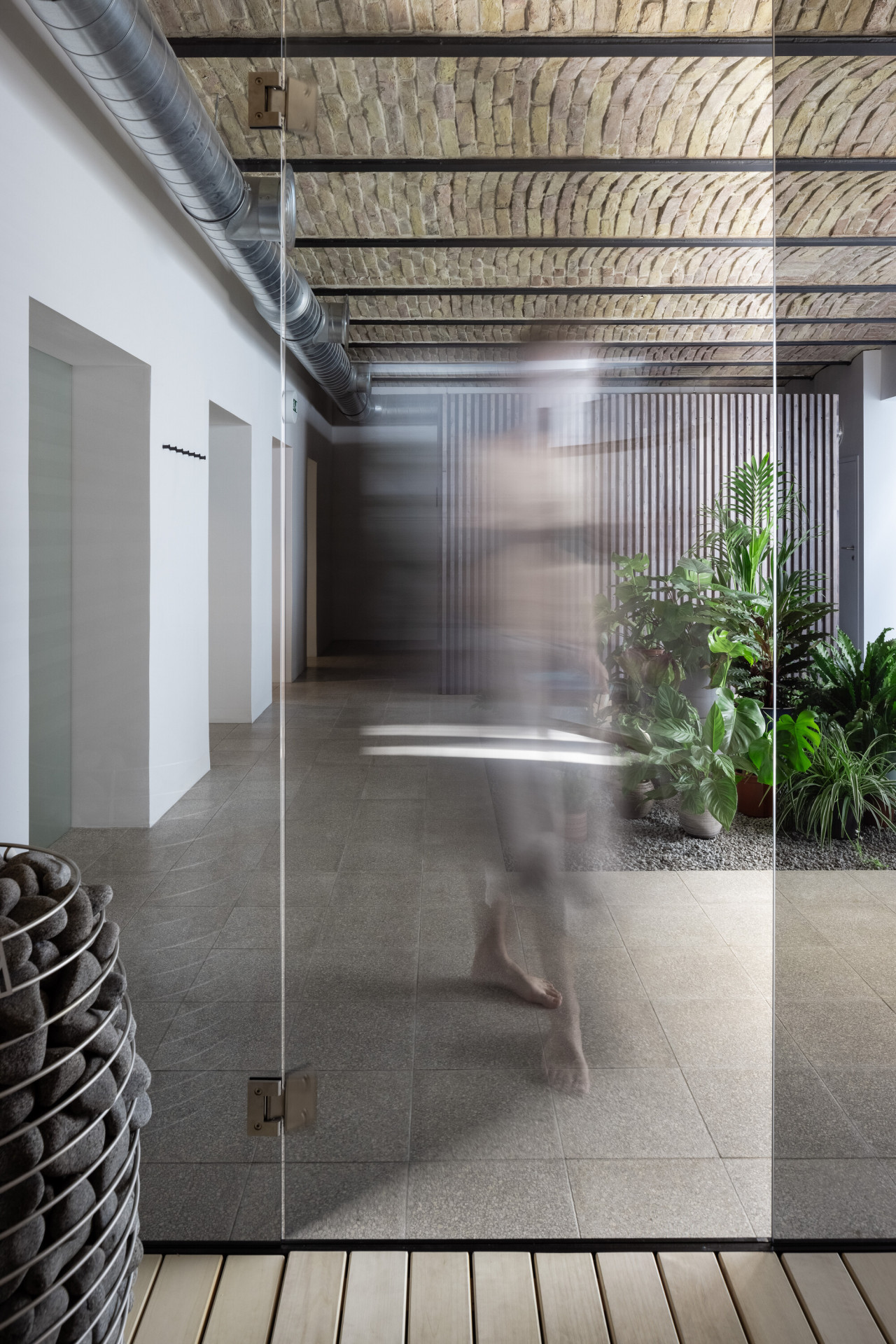 Meditační atmosféru do lázní přináší také rafinovaná práce se světlem. Ačkoliv se prostory nachází v suterénu, působí díky velkým světlíkům velmi prosvětleně. Sluneční paprsky v průběhu dne navíc atmosféru v interiéru dynamicky mění. „Zážitek je tak v každé době a období unikátní,“ dodávají architekti.