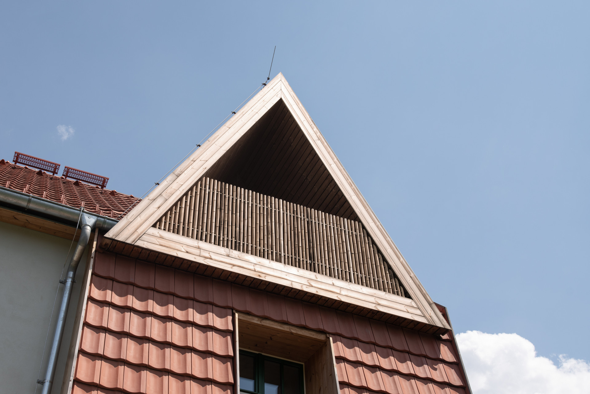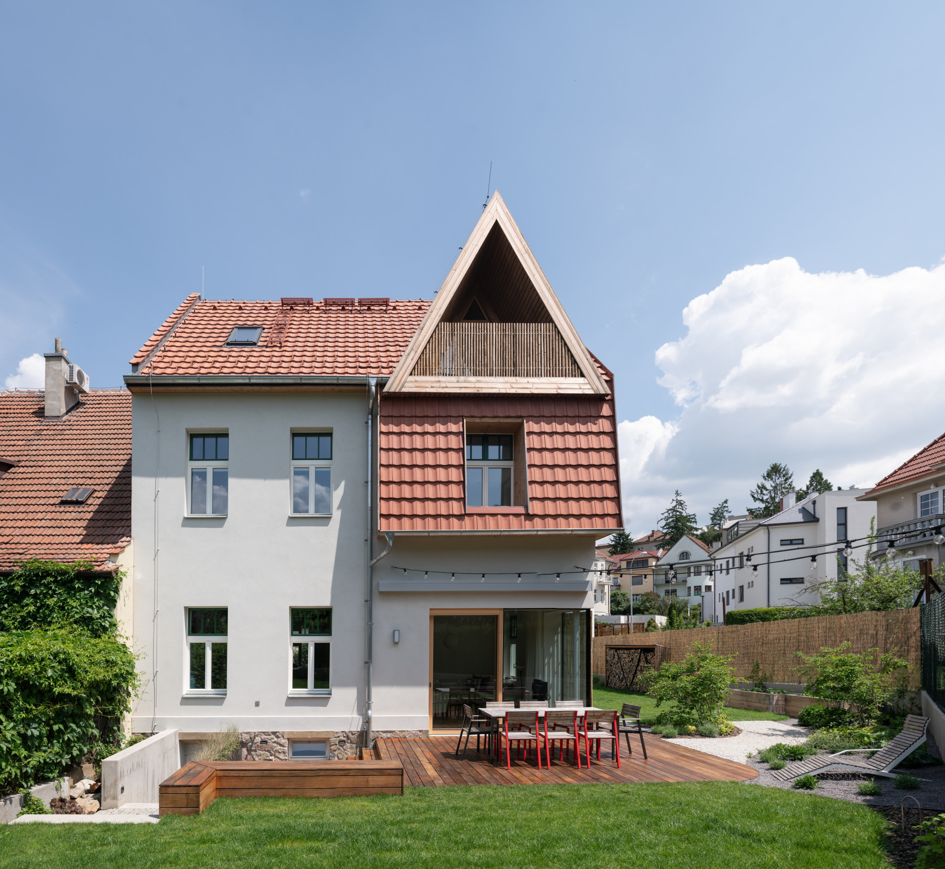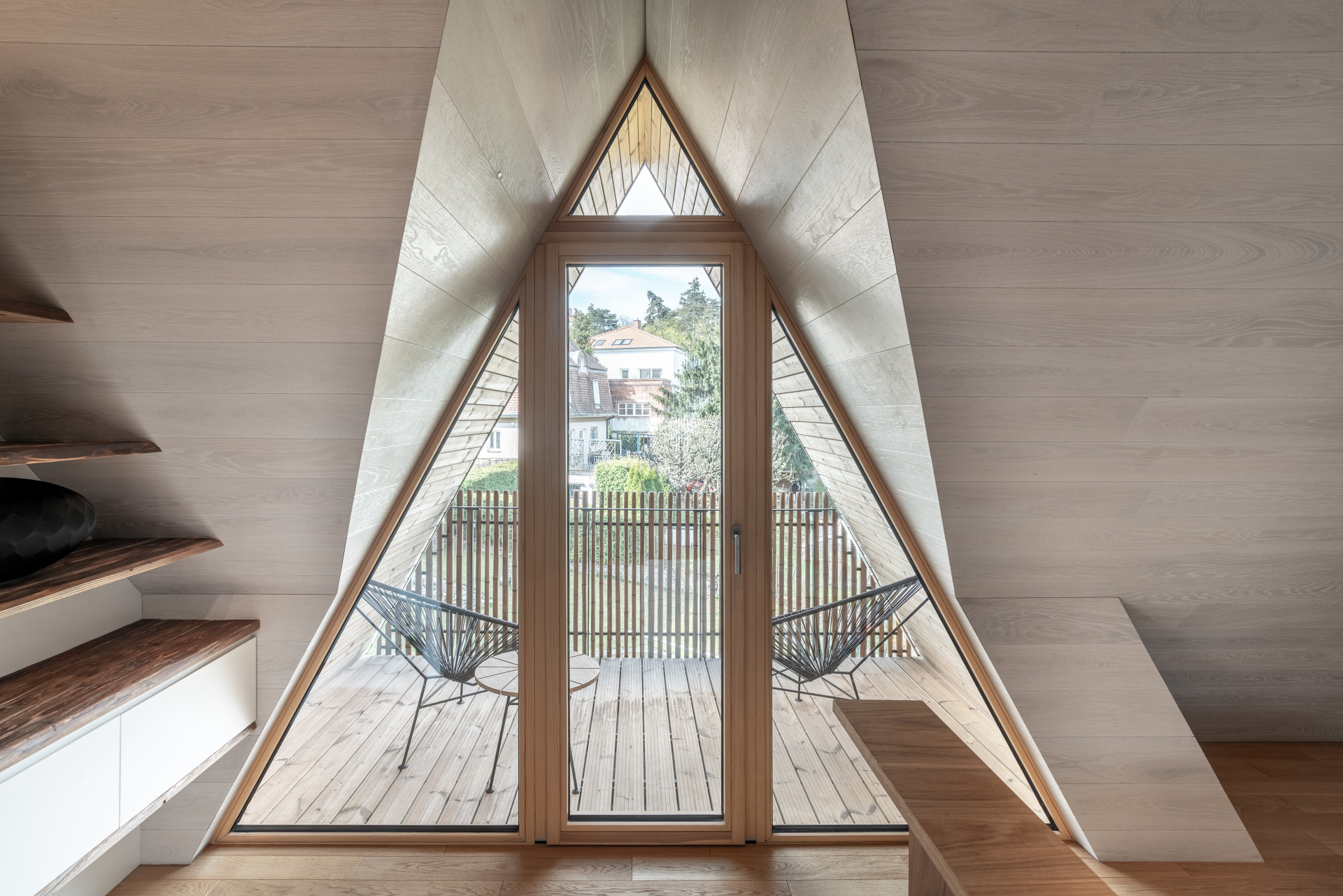 Směrem do zahrady vznikl zcela nový vikýř navazující na původní mansardovou střechu. Kromě nového prostoru pro venkovní posezení, poukazuje jeho tvar také na ústřední motiv celého architektonického konceptu přestavby – rovnostranný trojúhelník.