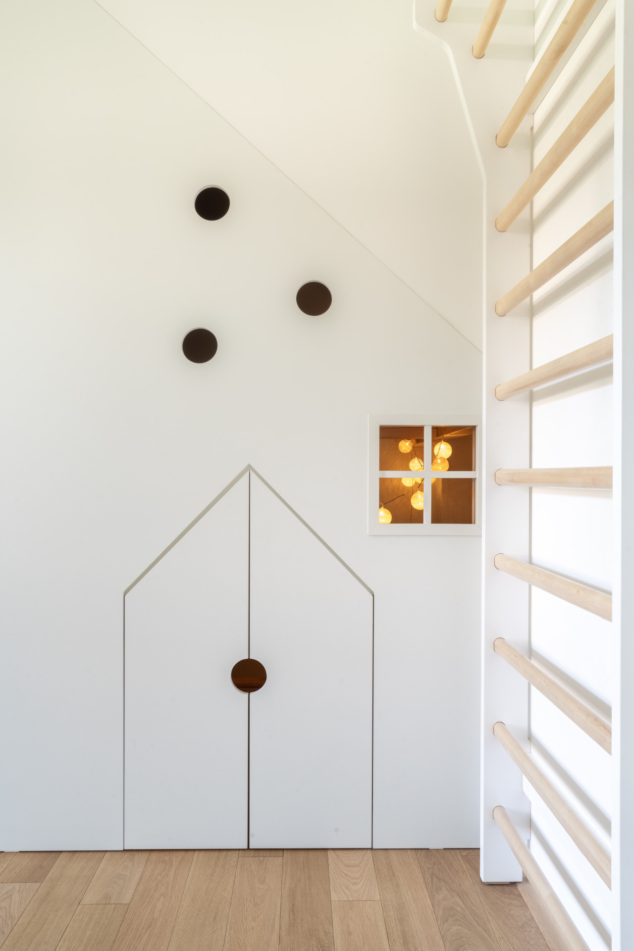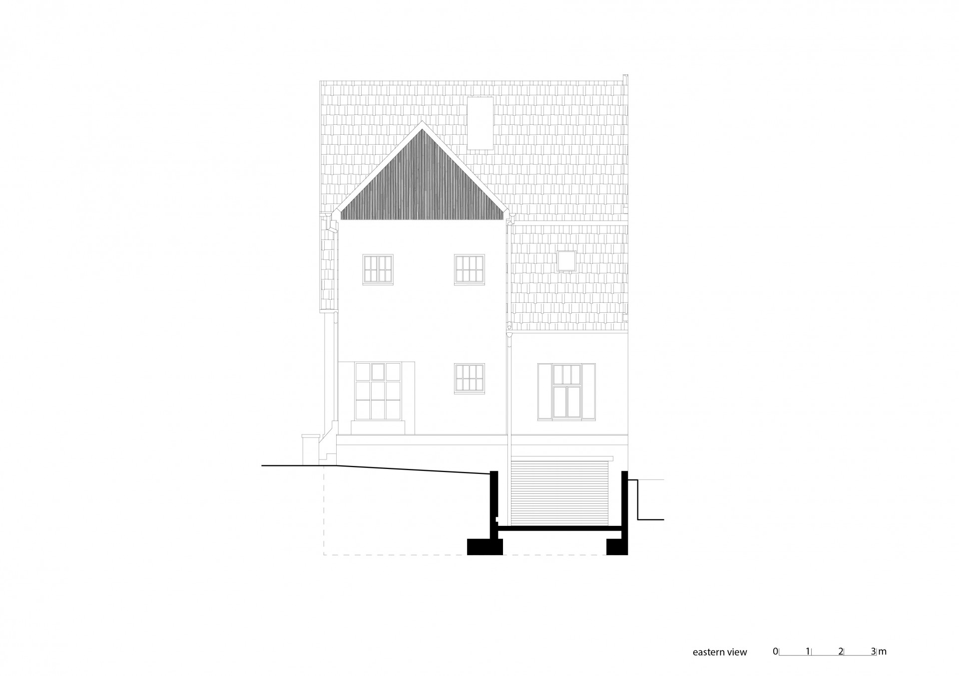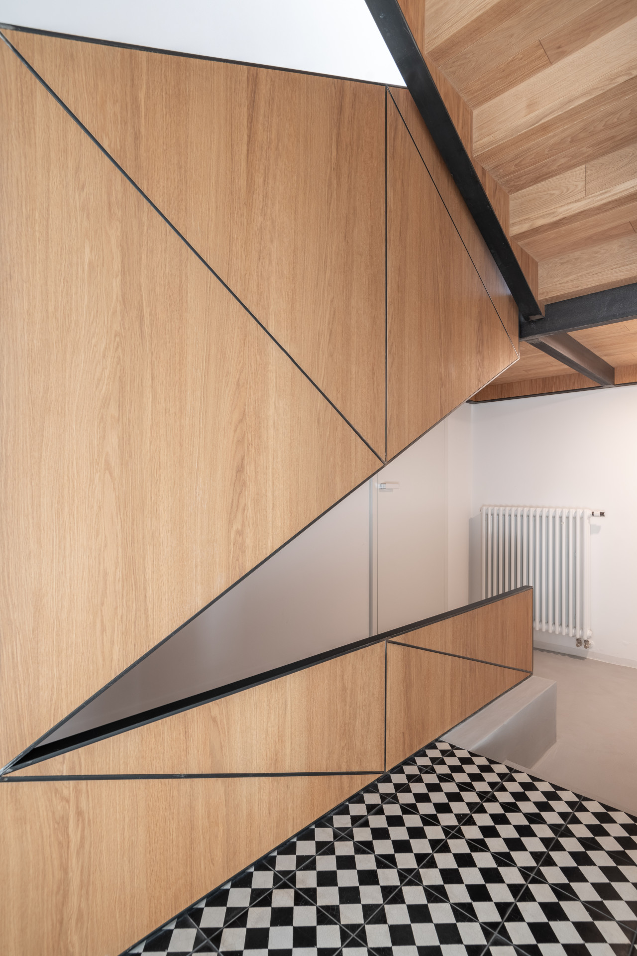 Směrem do zahrady vznikl zcela nový vikýř navazující na původní mansardovou střechu. Kromě nového prostoru pro venkovní posezení, poukazuje jeho tvar také na ústřední motiv celého architektonického konceptu přestavby – rovnostranný trojúhelník.