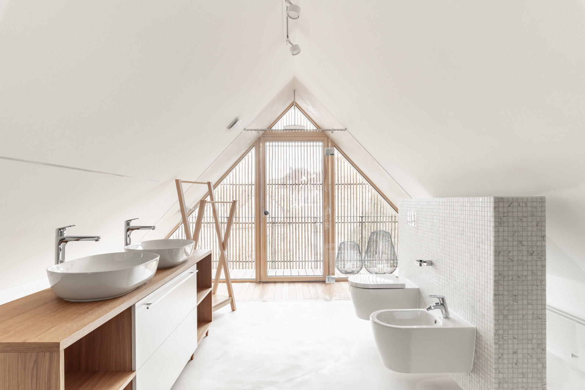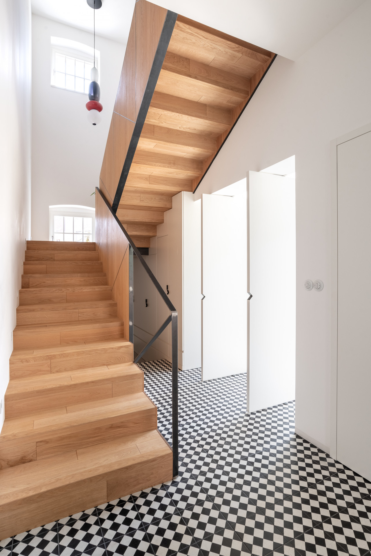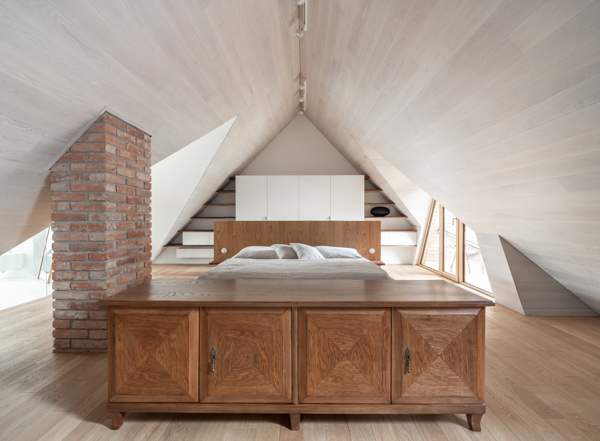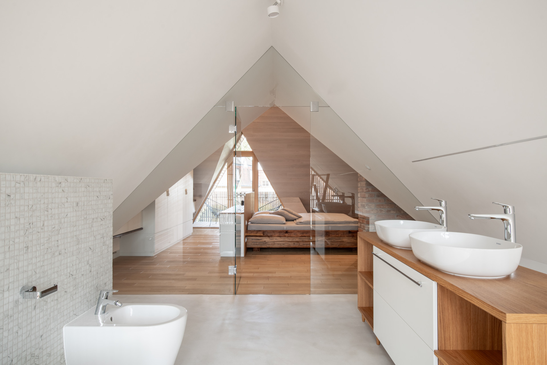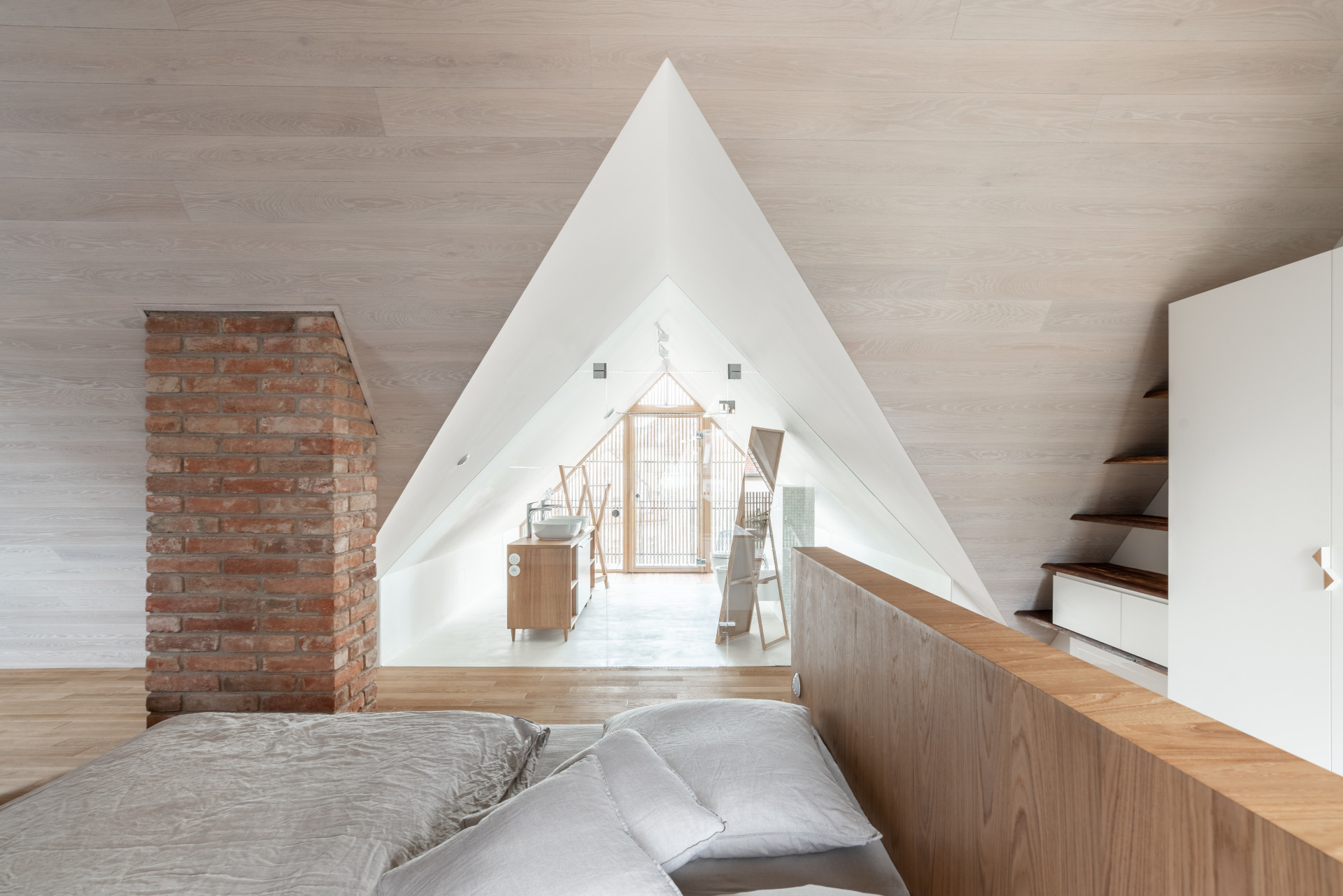 Ten nejzajímavější prostor se však skrývá až v podkroví. Architekti se rozhodli využít jeho potenciálu a vložit do něj hlavní ložnici s koupenou. „Díky výměně původních prvků krovu za ocelové krokve a táhla v podlaze se nevyužitá půda stává velkým otevřeným prostorem. Dochází zde k propojení hlavního a vedlejšího traktu, v jehož křížení je ložnice,“ popisují architekti svůj záměr.
