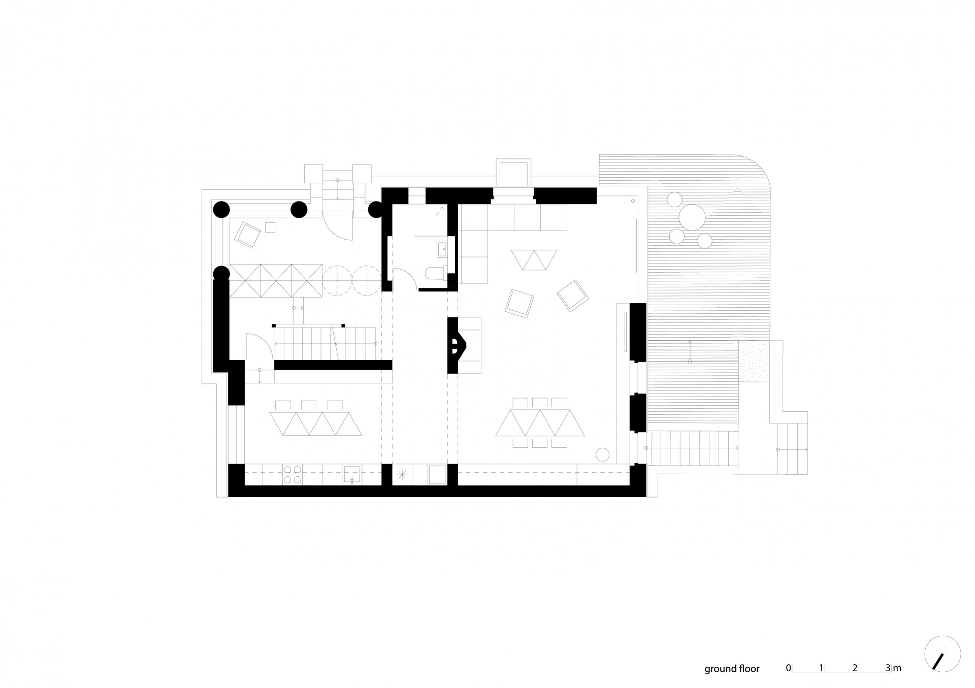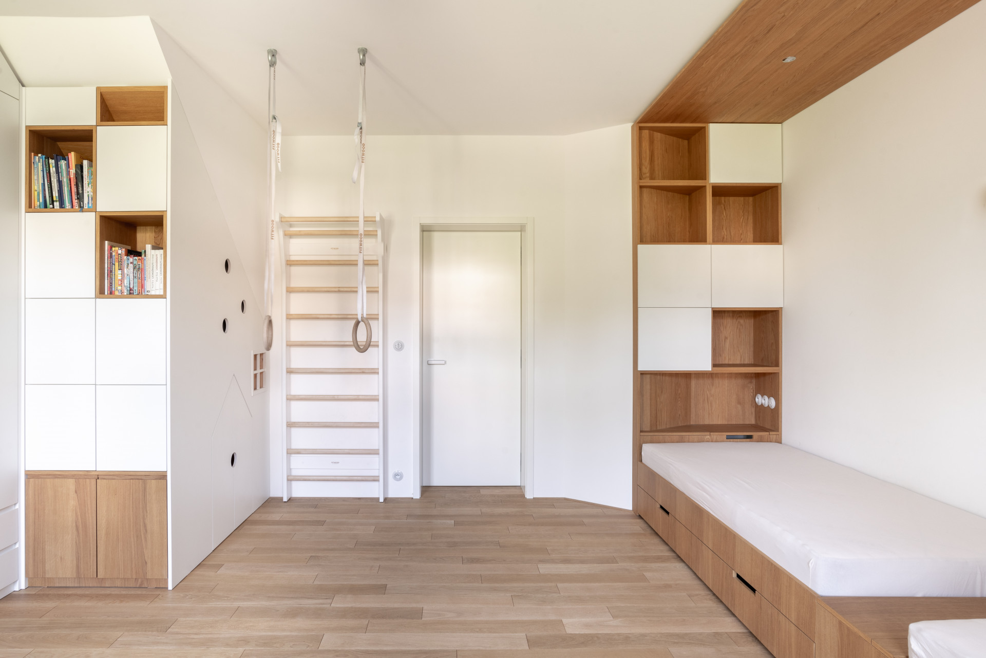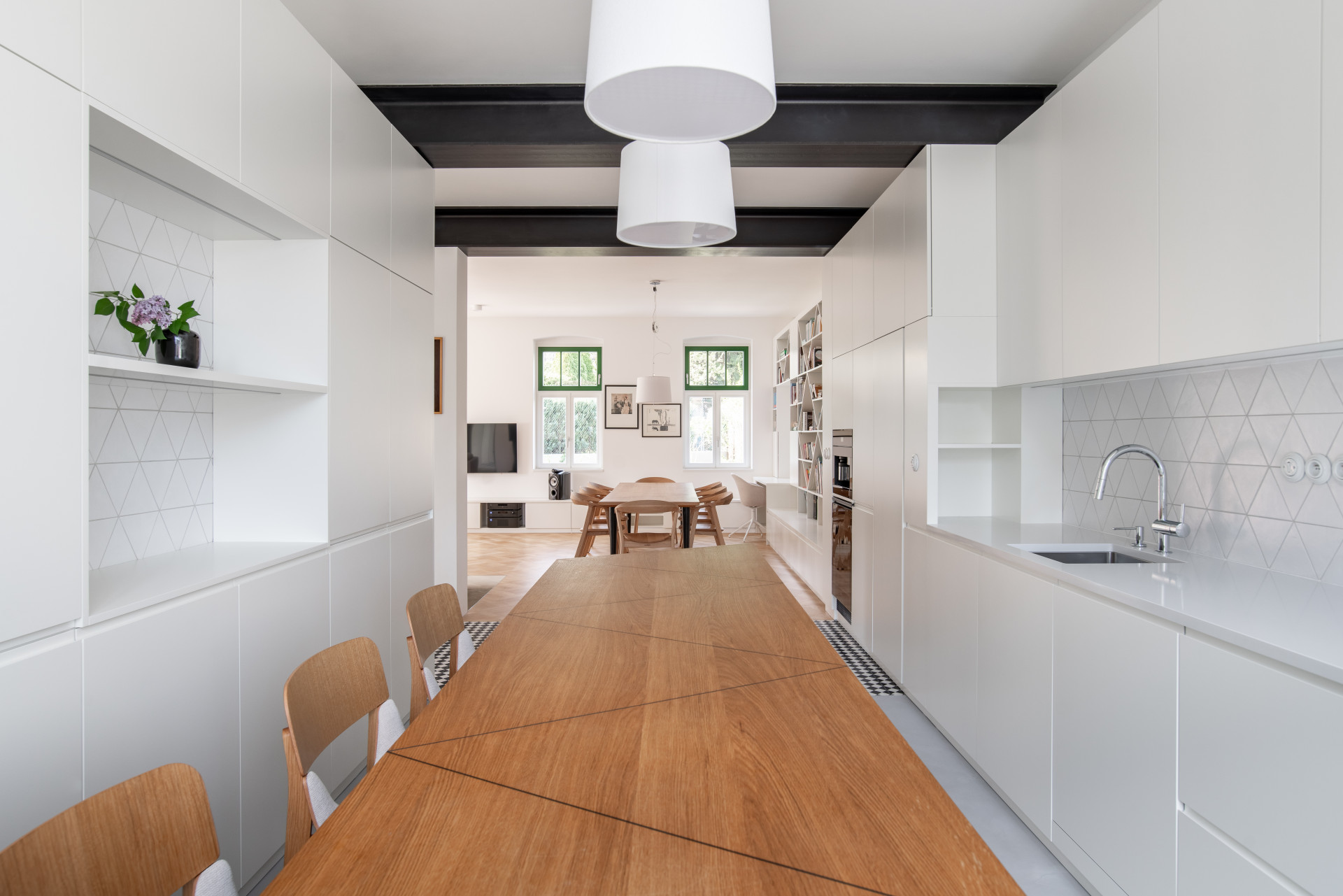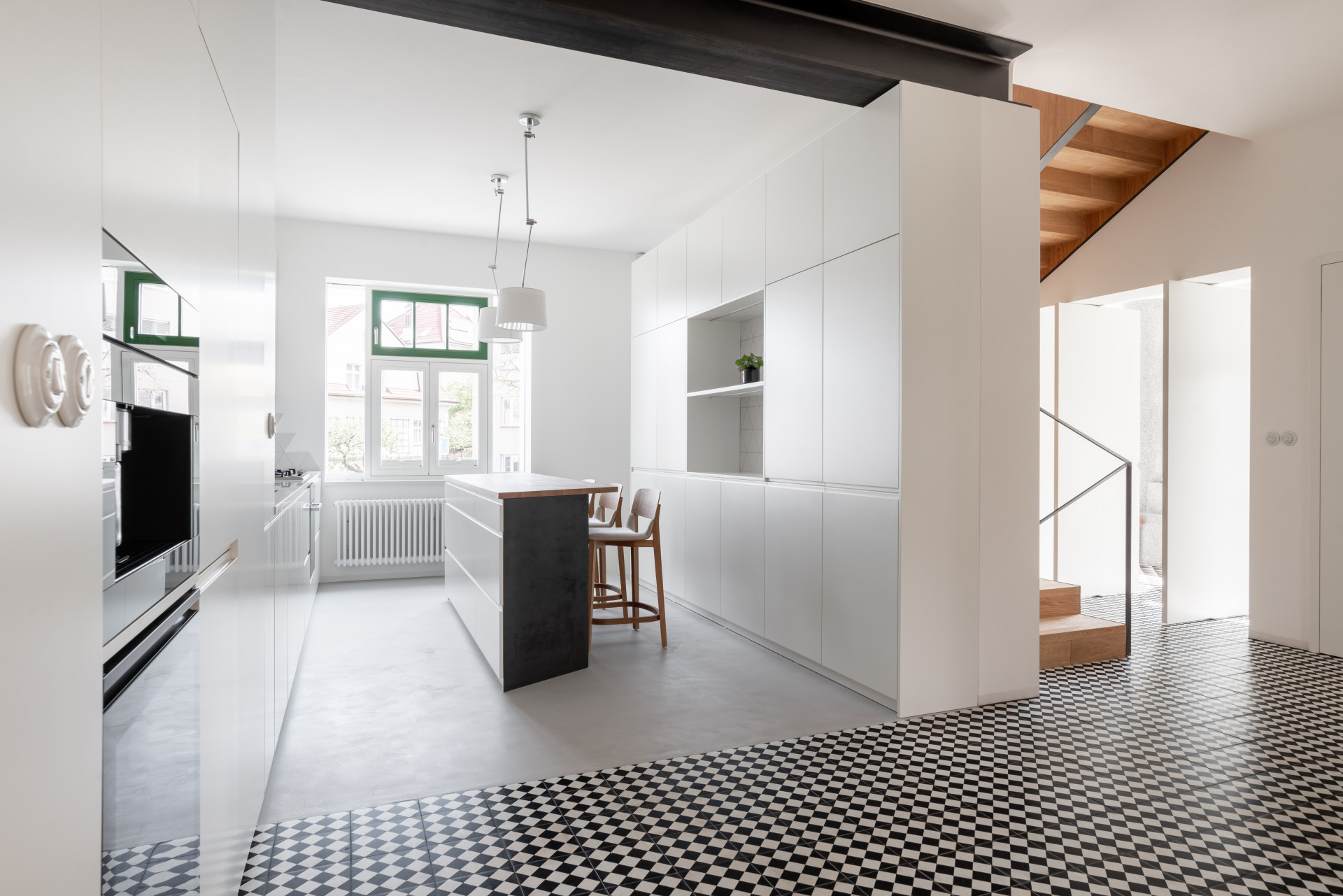 Dvoupodlažní podsklepená vila s neobyvatelným podkrovím dispozičně nevyhovovala současným nárokům na bydlení a architekti proto razantně zasáhli do dispozic jednotlivých pater. Největší proměnou v tomto ohledu prošlo přízemí, kde probouráním nosných zdí vznikl otevřený a vzdušný prostor obývacího pokoje s kuchyní a jídelnou. V patře pak najdeme dětské a hostinské pokoje s koupelnami.