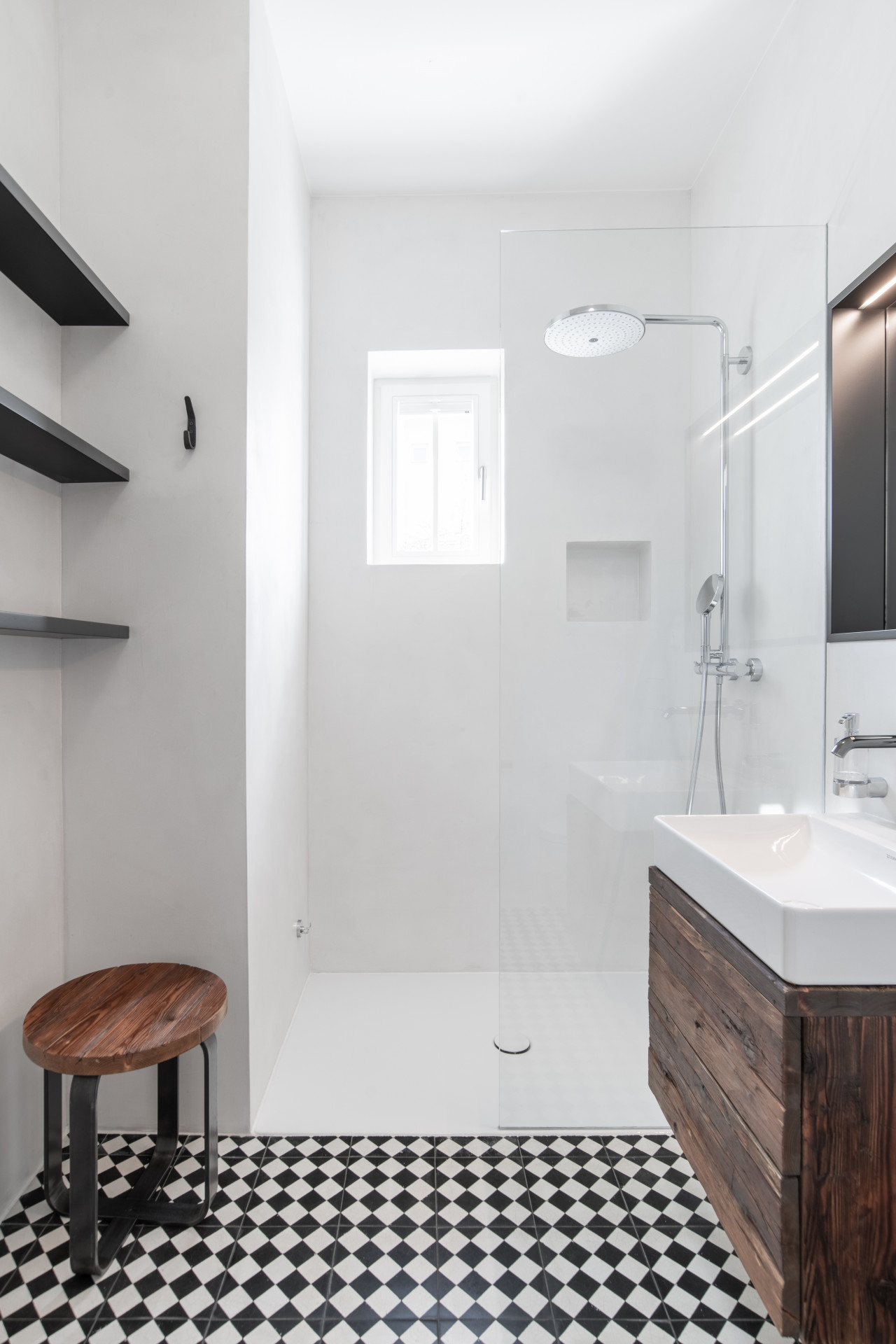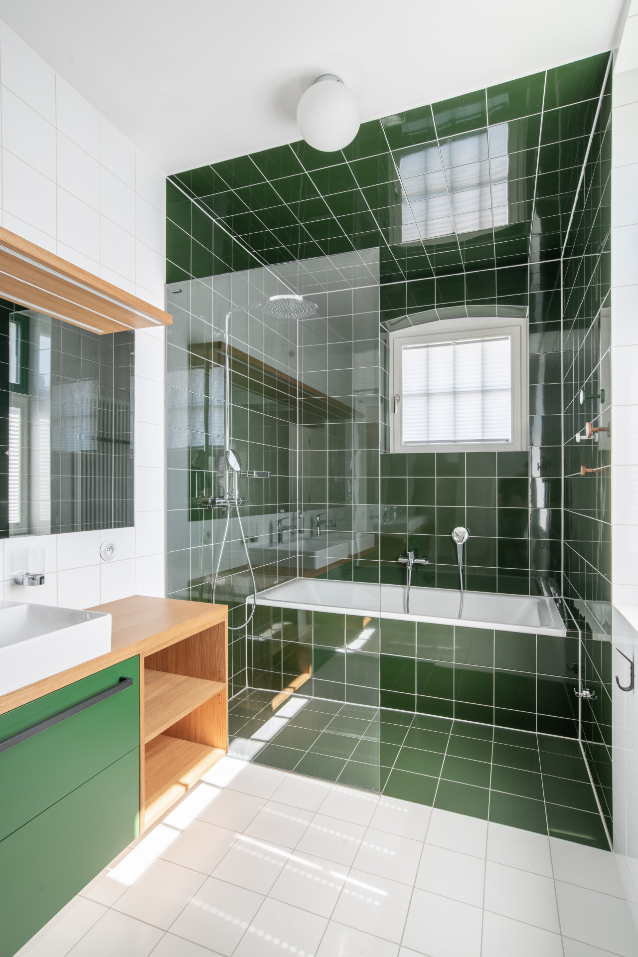Že podkroví prvorepublikové vily ožilo, je jasně patrné už z exteriéru. Původně zděný uliční štít nahradila prosklená plocha, za níž se nyní nachází koupelna. Soukromí zajišťuje bambusový slunolam, který zároveň razantní vstup do hmoty stavby zjemňuje.