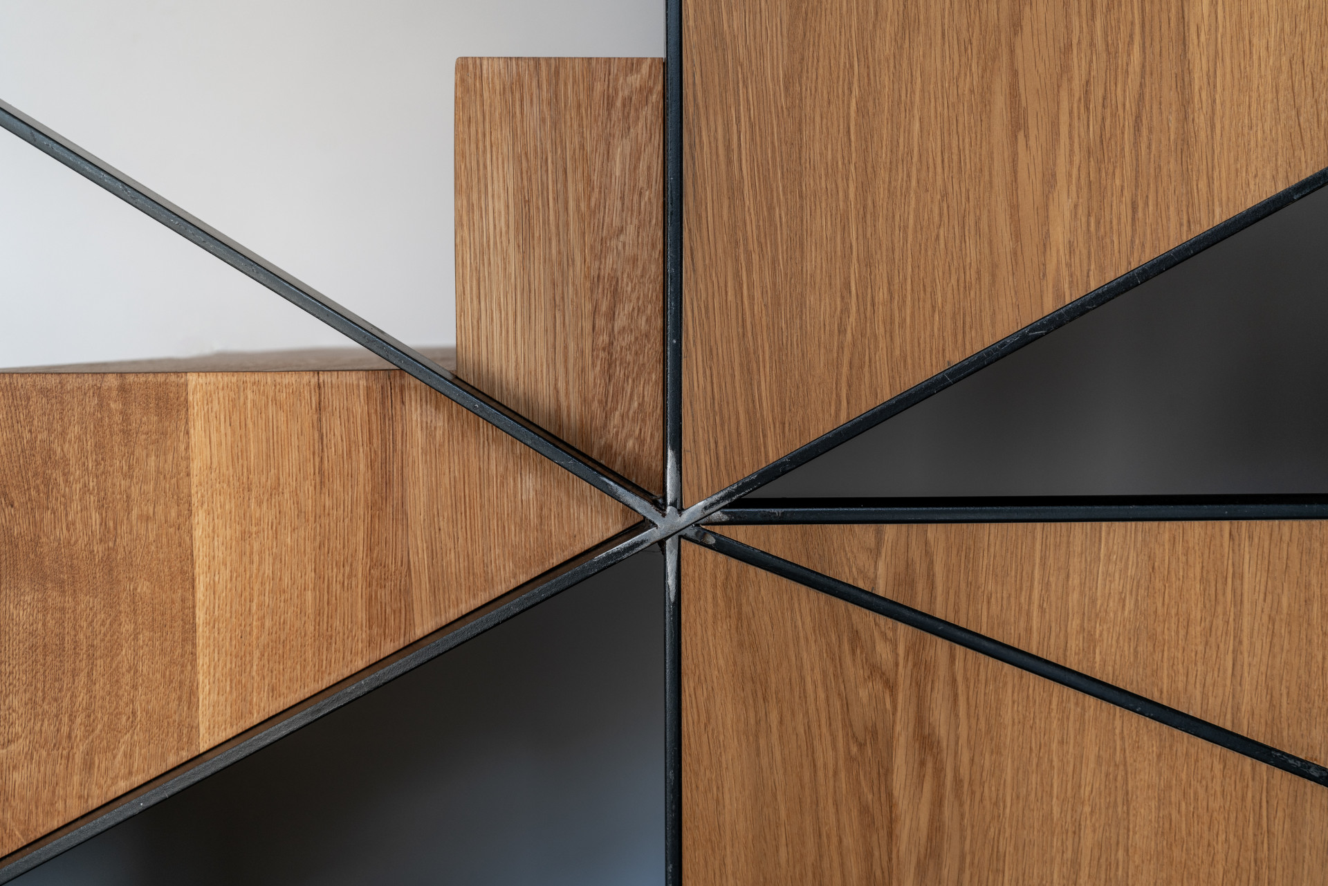 Motiv trojúhelníku objevíme v každé místnosti vily. V přízemí je skryt v inkrustaci jídelního stolu nebo ocelovém schodišti s dřevěným obložením vedoucím do prvního patra. Ve zbytku stavby je viditelný v detailech nábytku, rastru podlahy nebo keramických obkladech.