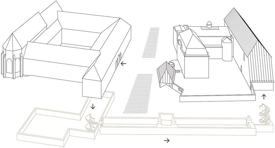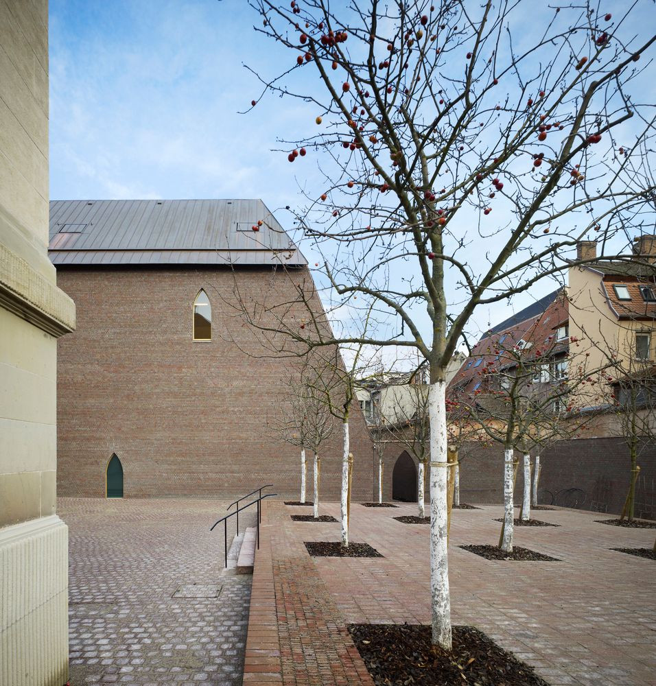 Nové budovy Ackerhofu a mlýnice používají tradiční materiály. Nepravidelné, ruční cihly z bouračky vstupují do dialogu s klášterní fasádou z kamene a sádry, mnohokrát v průběhu staletí přestavovanou; a ve zdi je několik oken s lomeným obloukem. Strmě šikmým střechám obou budov poskytuje měď s ostrými lomy nadčasovou kvalitu.
