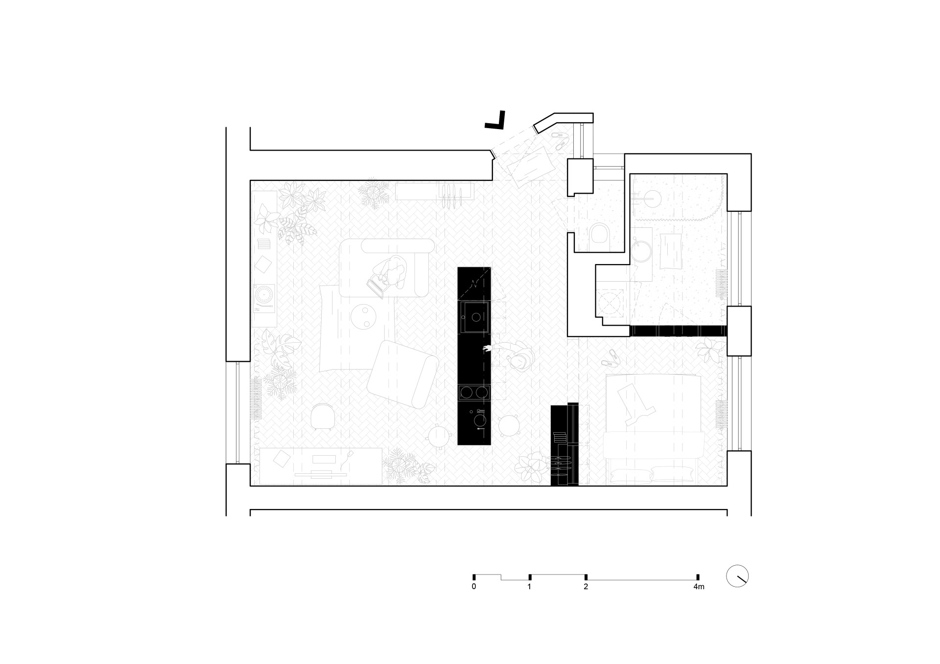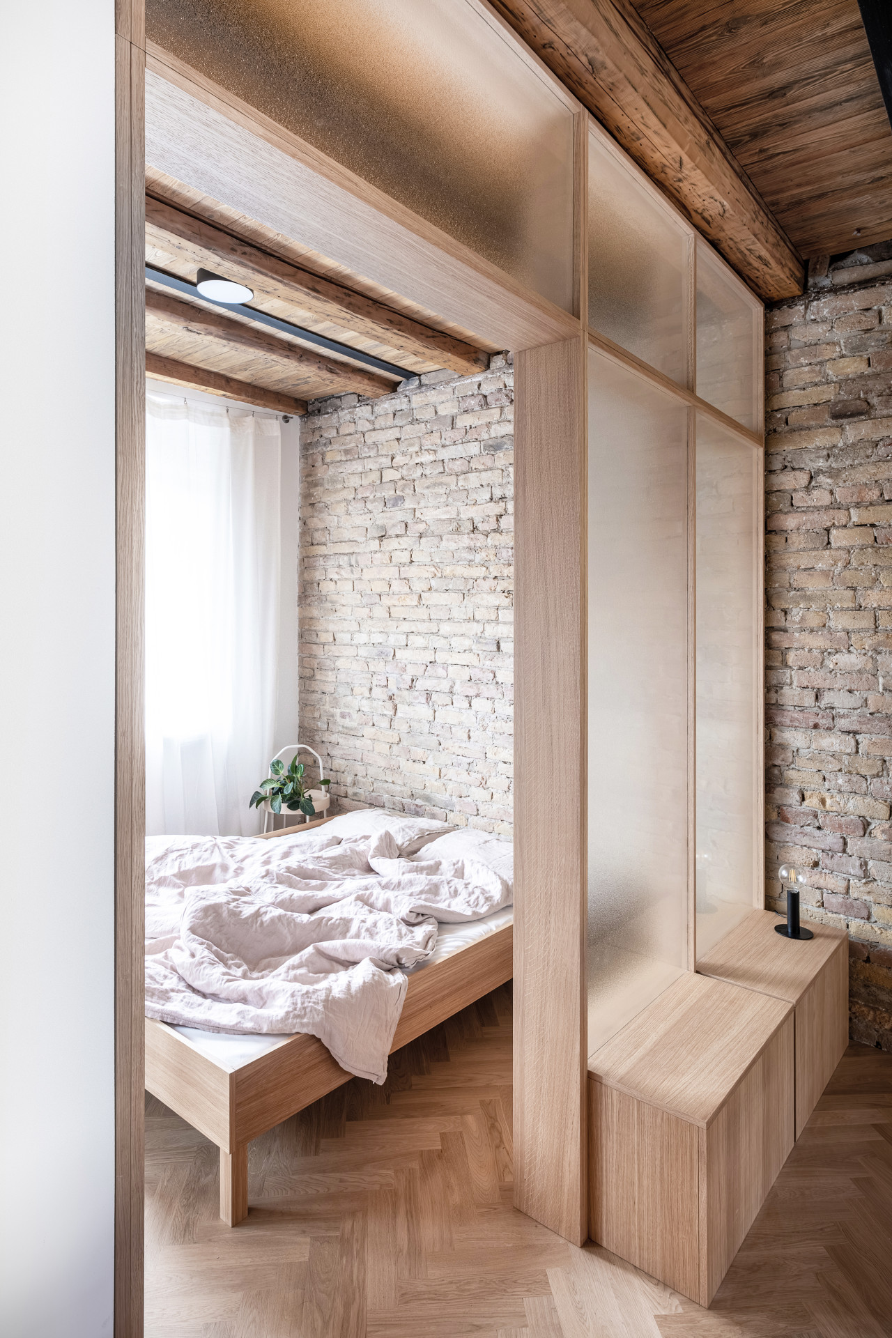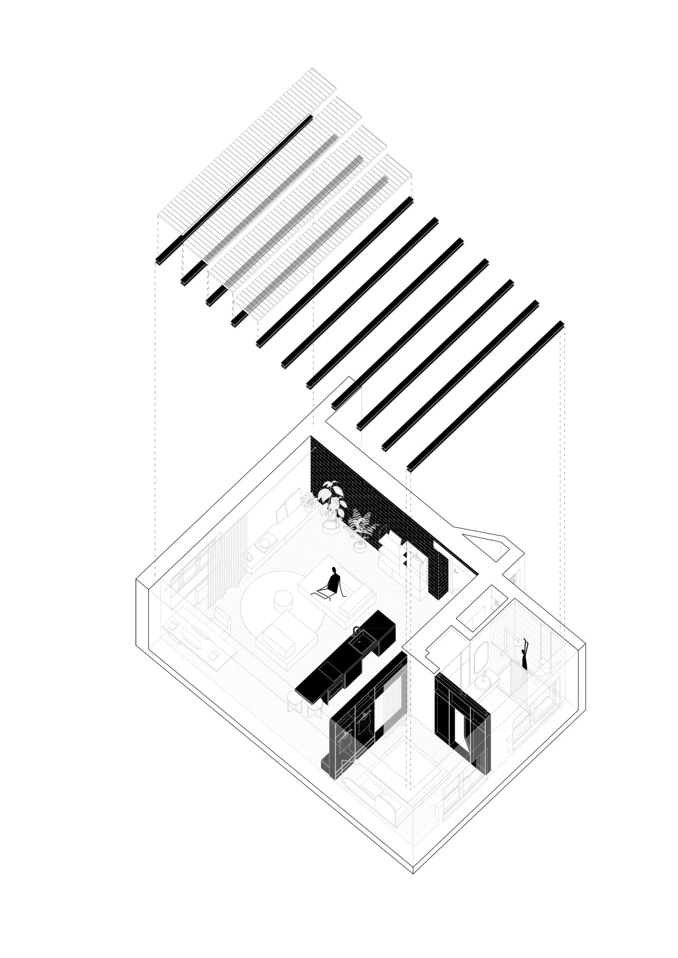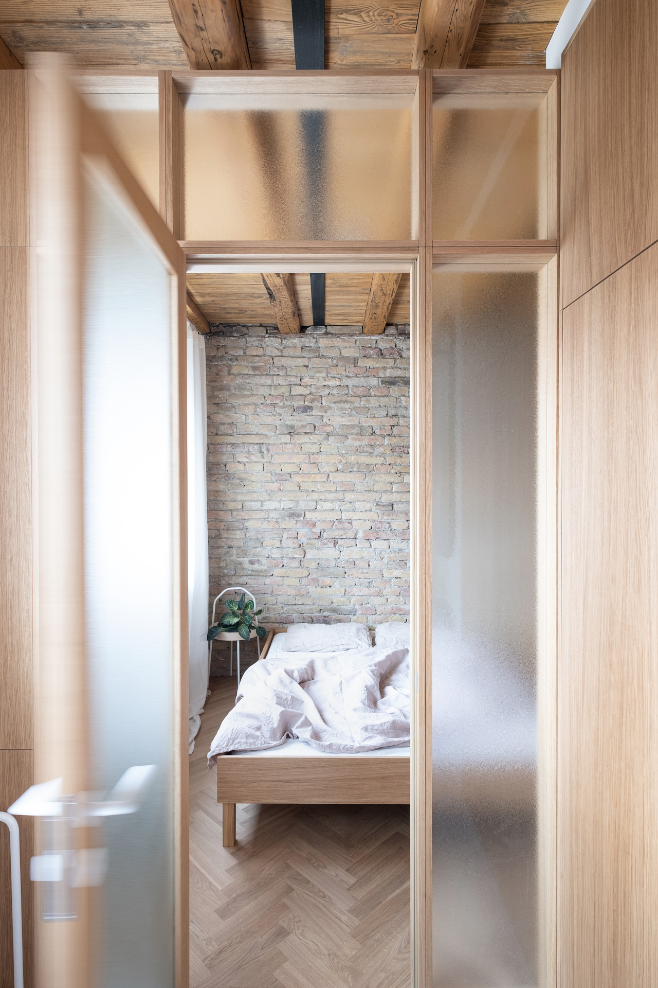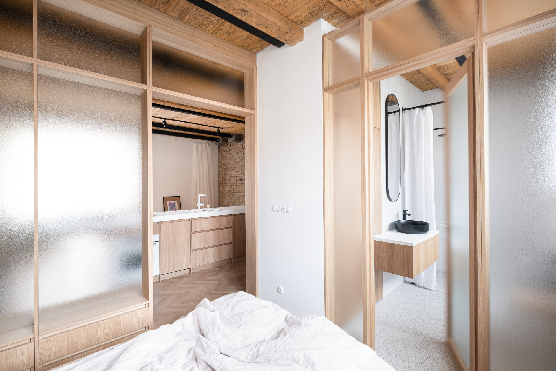 V tomto bytě se nebydlí, hlavně se v něm pracuje. Je to spíš ateliér, ve kterém se dá přespat. Vybaven je jen tím nejdůležitějším nábytkem a obohacen denním světlem. Toho bylo do prostoru potřeba dostat co nejvíce, a proto místnosti dělí průsvitné prvky.