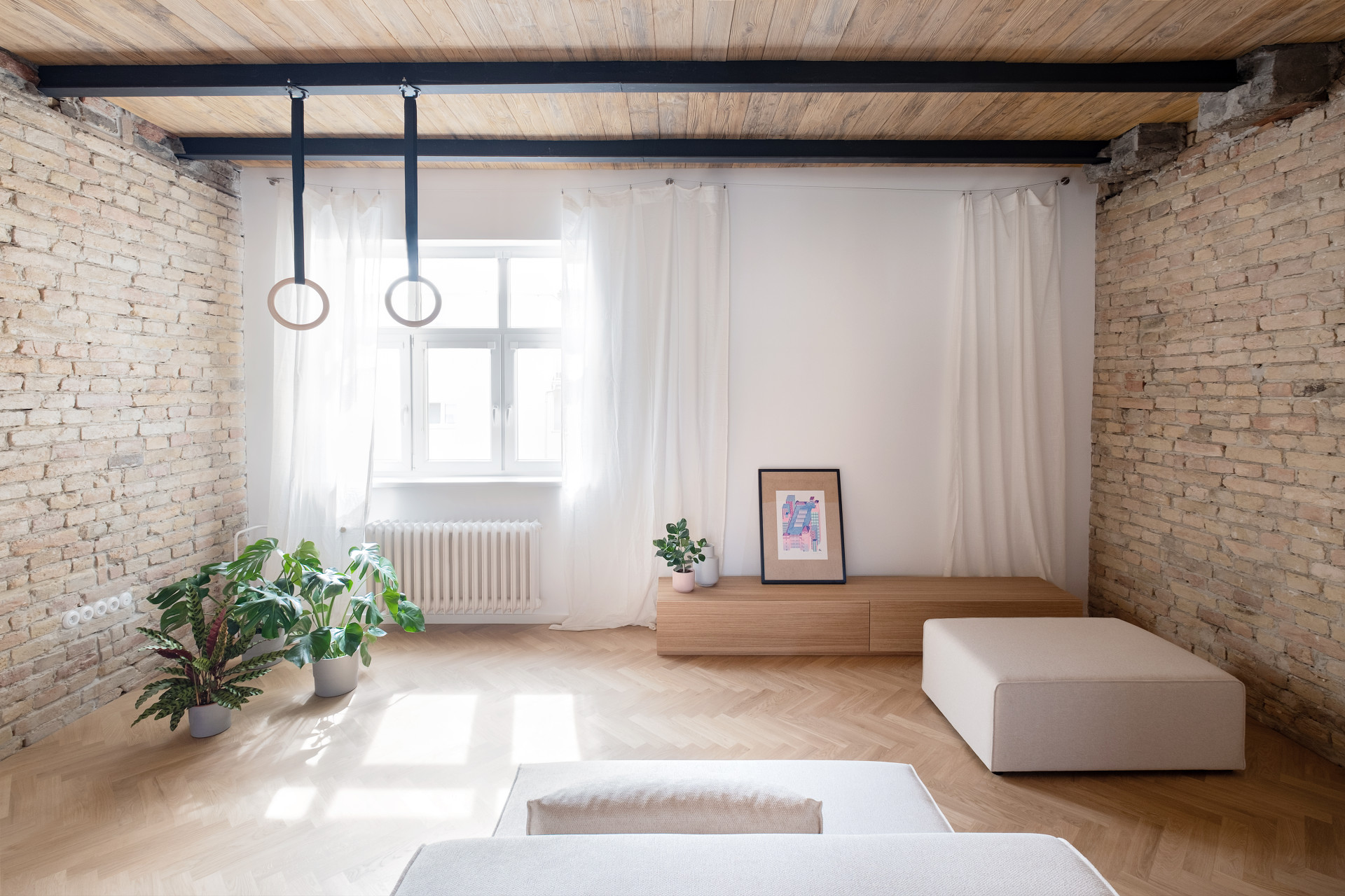 Jádrem architektonického konceptu byla práce s konstrukčním řešením bytu. Odhalilo se třeba cihlové zdivo nosné stěny, vidět je taky záklopový strop, který kromě trámů nesou ještě ocelové nosníky. „Ty pro nás byly překvapením, souvisejí s nástavbou, která byla v minulosti na bytovém domě realizována,“ popisuje Marek Abramovič.