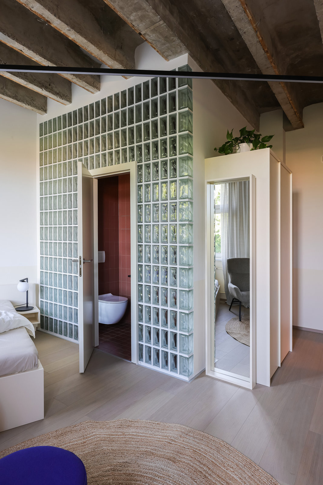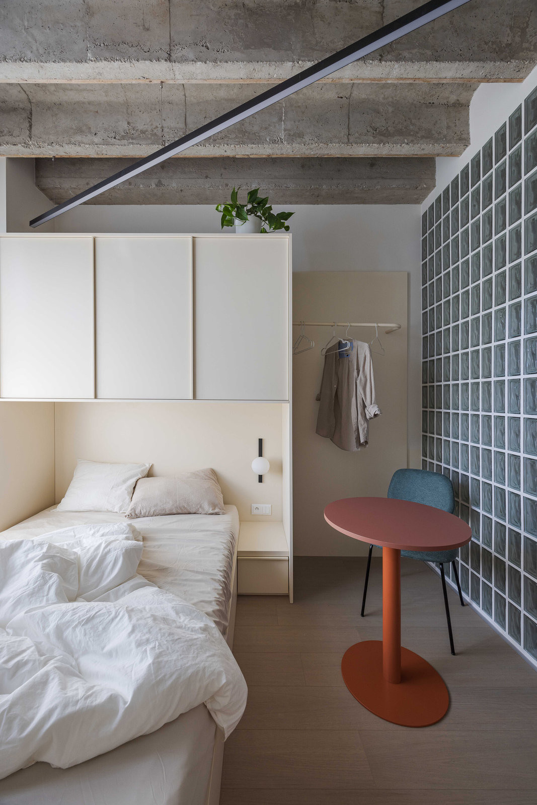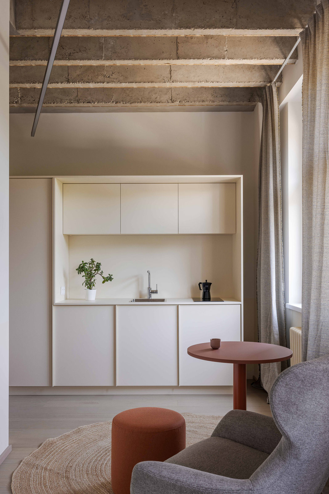 Každý byt je vybaven kuchyňským koutem, prostorem pro spaní a koupelnou. Nové interiéry působí minimalisticky a funkčně, s využitím přírodních materiálů a decentních barev. Atmosféru bytů určuje paleta modré, šedé, krémové a terakoty. „Tyto barvy umožňují obyvatelům personalizovat si své apartmány podle vlastních preferencí a dodat jim osobní styl, aniž by tím narušili architektonickou celistvost,“ vysvětlují architekti. Každý byt je vybaven kuchyňským koutem, prostorem pro spaní a koupelnou