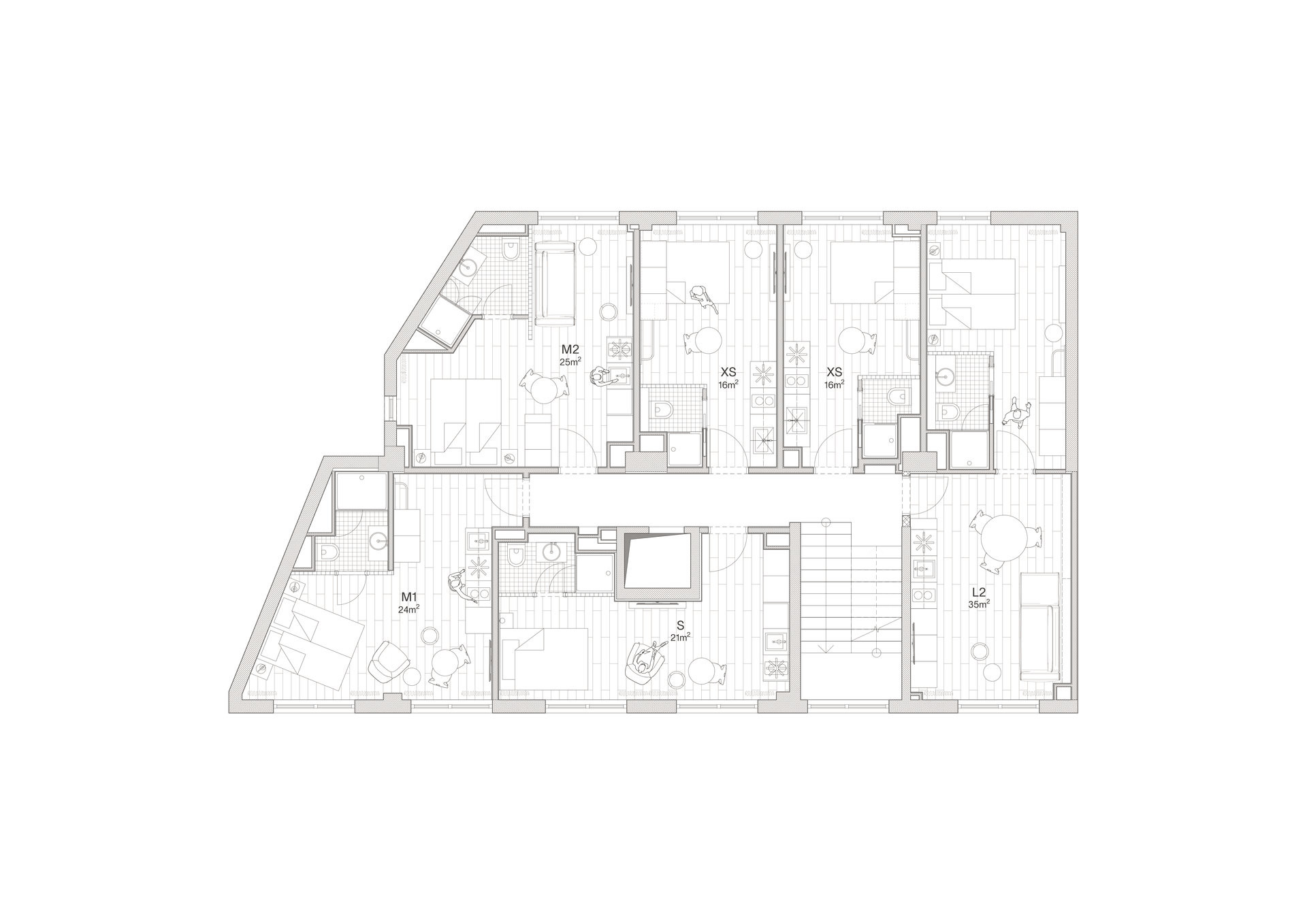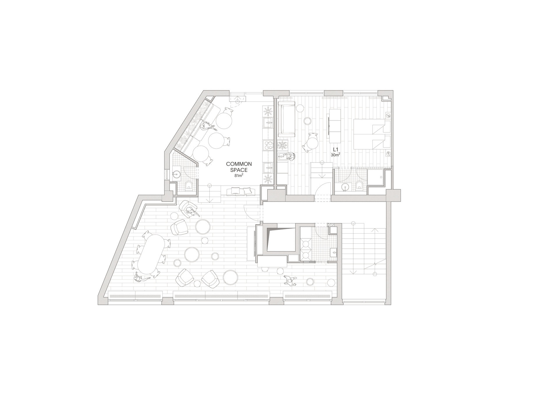 Protože jde o co-livingový projekt, budova nabízí také společné prostory určené ke sdílení. Patří sem prádelna, odpočinkové zóny a komunitní kuchyň, které podporují sousedské vztahy. „Koncept co-livingu podporuje komunitní život, posiluje sociální soudržnost a interakci mezi obyvateli. V neposlední řadě přináší i ekonomické benefity díky sdílení zdrojů a prostorů,“ říkají architekti.