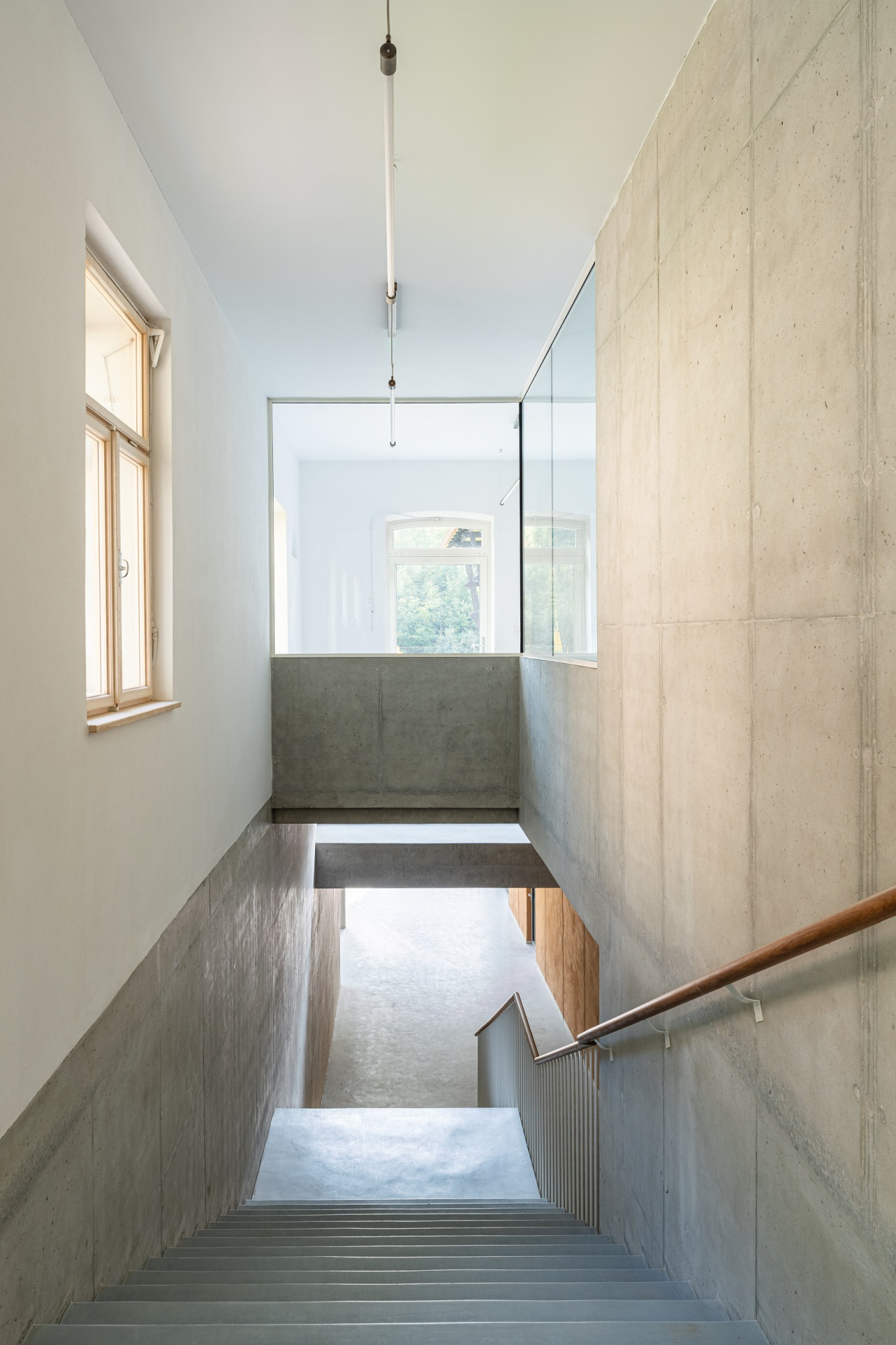 Dostalo se ovšem také na moderní intervence. Dva domy, které nyní fungují jako muzeum, architekt Petr Všetečka propojil betonovým průchodem částečně skrytým pod zem. Že jde o novou, současnou vrstvu architektury, autor nijak neskrývá. Stěny i strop jsou z pohledového betonu.