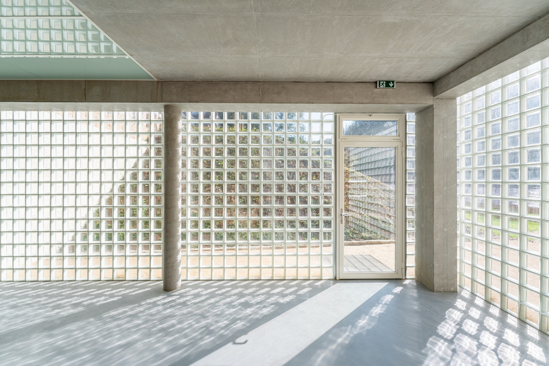 Uvnitř původní prádelny s kotelnou je dnes kavárna, malý obchod a také moderní recepce muzea. Právě z ní se vstupuje do nového betonového průchodu, kterým se dostanete do Jurkovičova Vodoléčebného ústavu. Při cestě průchodem kromě betonu minete také nové obvodové stěny z luxfer. Volba tohoto materiálu, který je mimochodem nyní dost trendy, byla sofistikovaná – Dušan Jurkovič totiž patřil k prvním architektům u nás, který s nimi pracoval. Luxfery, správně sklobeton, jsou vynálezem přelomu 19. a 20. století a poprvé představené na světové výstavě v Paříži v roce 1889, kterou Dušan Jurkovič osobně navštívil. Přímo v Luhačovicích pak luxfery použil na tzv. Jurkovičově domě. TRANSAT architekti je nyní přinesli také do Slunečních lázní.