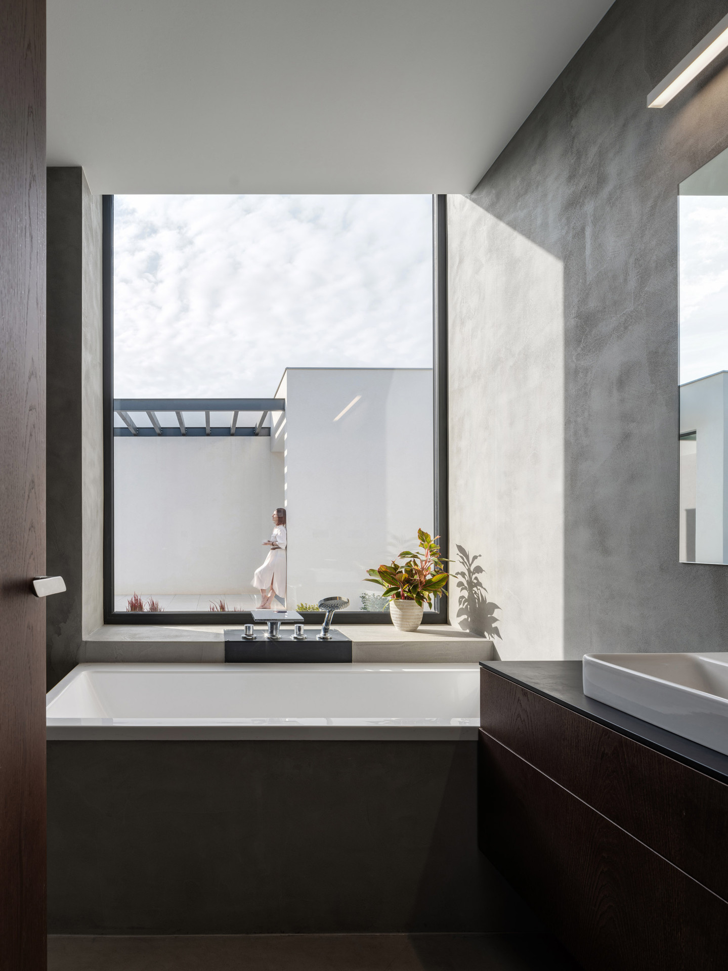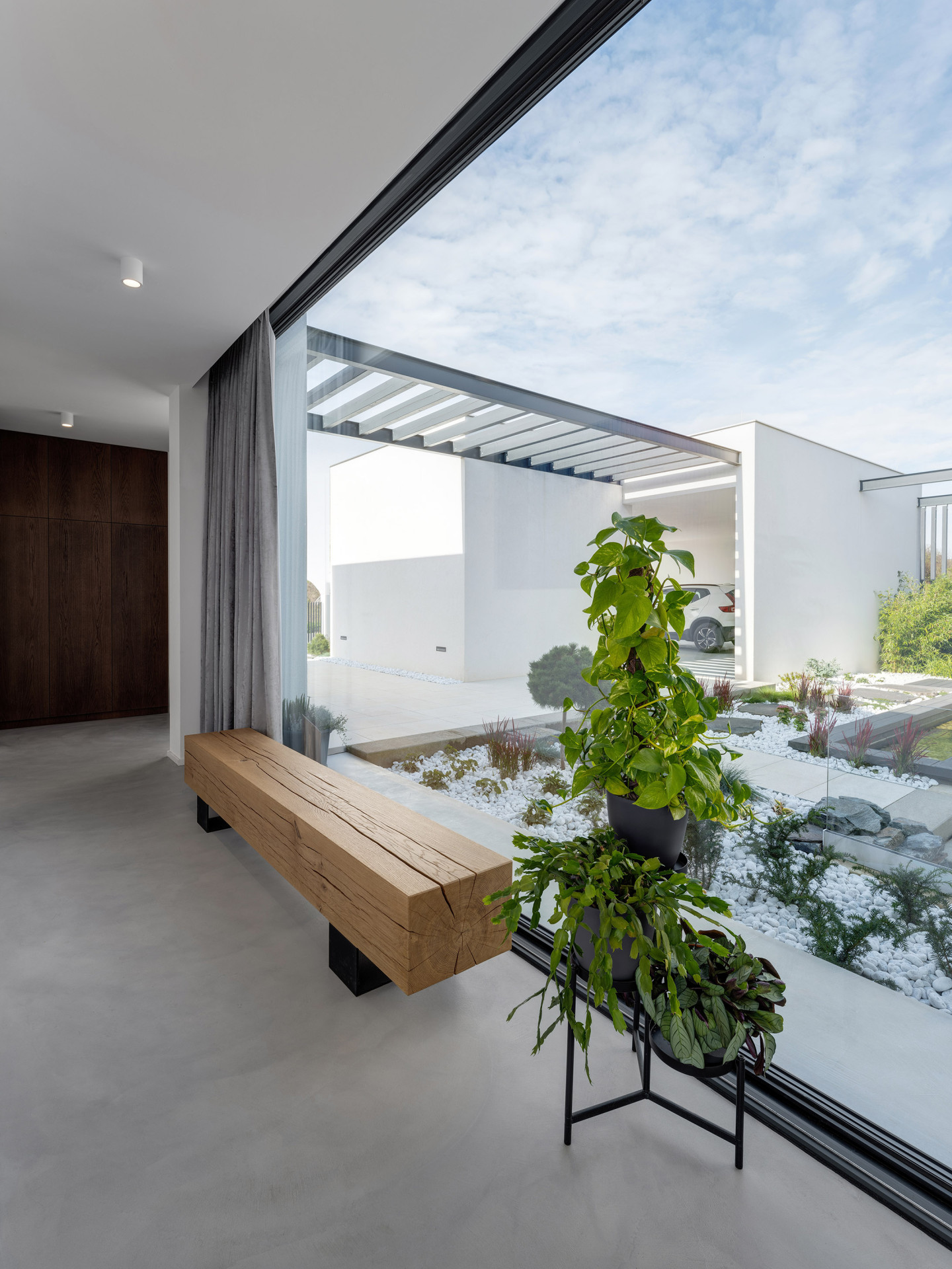Atrium funguje jako filtr mezi veřejným a soukromým. Vstupní část se od příjezdové cesty nejprve otevírá krytým průjezdem a parkováním, na které navazuje plná stěna a uzavřený venkovní sklad. Tyto hmoty obyvatelům umožňují žít obklopeni prosklenými stěnami i v intimnějších místnostech.
