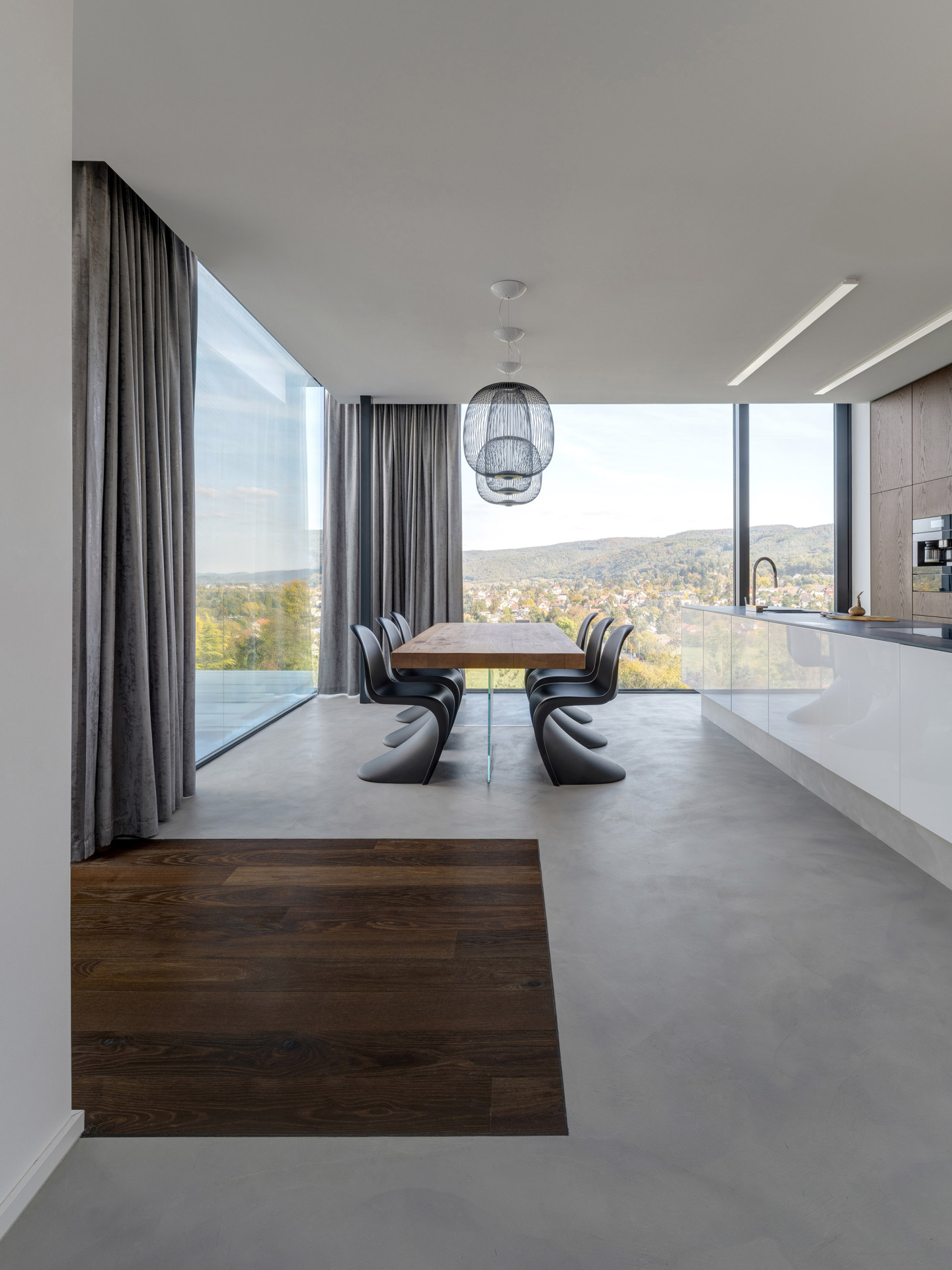 Centrální obytný prostor je propojený s krajinou. Vychází odtud můstek z vrstveného kaleného skla směřující do zahrady. Obytná zóna navazuje na kuchyň s ostrůvkem a jídelní část, které dominuje stůl s atypickým proskleným podnožím. Celek působí přirozeně, čistě a zároveň sexy v tom nejlepším slova smyslu – díky nenápadné eleganci, propojení s krajinou a promyšleným detailům.