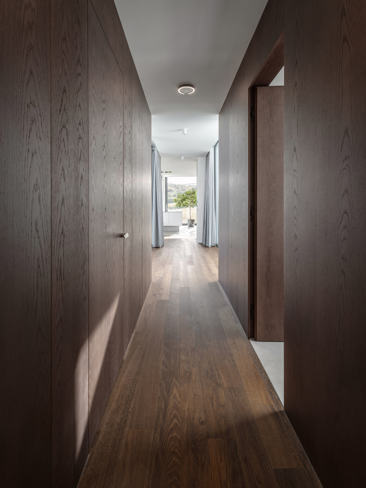 Interiér pracuje s kontrasty světlých stěrek a tmavého dřeva, přičemž materiálové řešení vždy odpovídá funkci prostoru – ve společenské části je podlaha světlá, směrem k soukromým zónám přechází do tmavého dřevodekoru, který se uplatňuje i na stěnách. „Záměrně jsme zde pracovali s gradací atmosféry – při přechodu z chodby do ložnic dochází ke změně vnímání prostor, protože obyvatelé vstupují z velmi tmavé chodby do otevřených a velkoryse prosvětlených místností,“ vysvětluje architektka Jana Stachová.