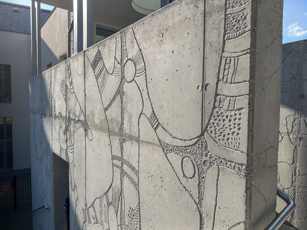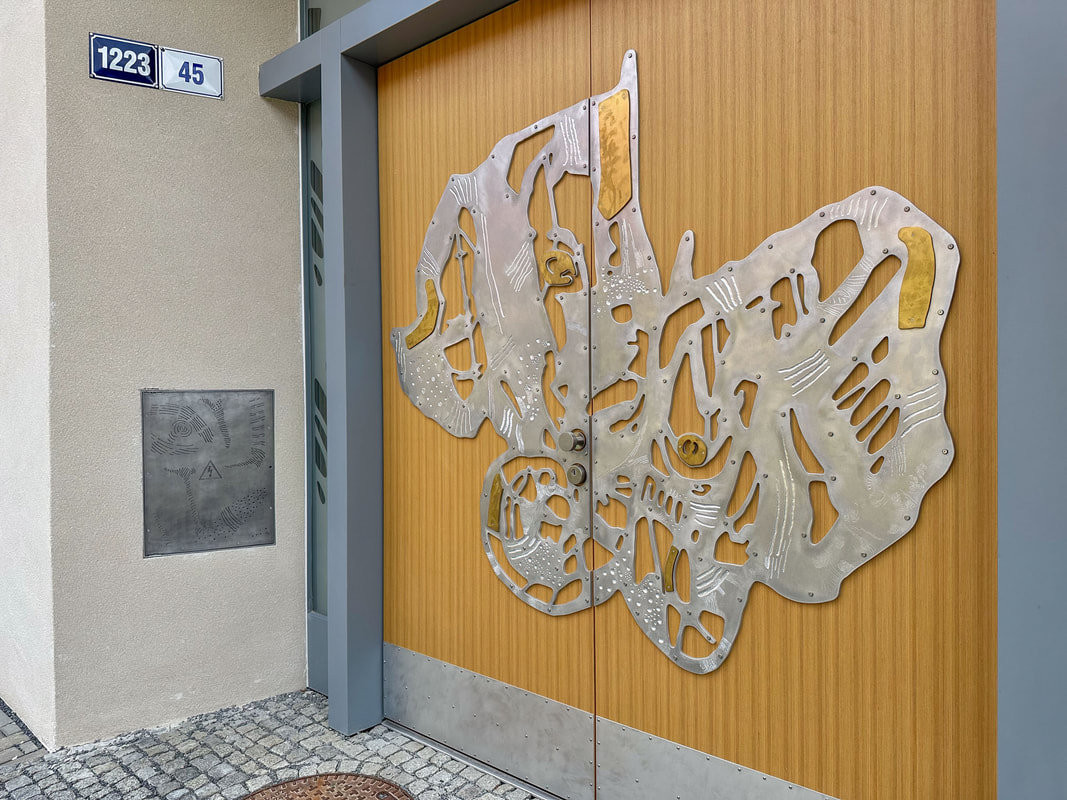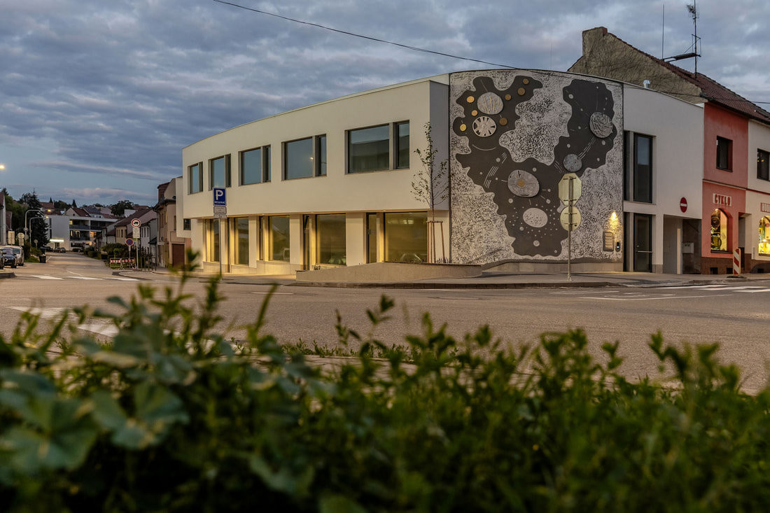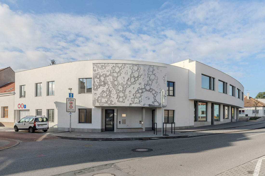 Konvenční omítka rohového domu je pokryta dvěma autorskými prvky, které zásadně mění celkový charakter budovy. První je autorská plastika Květ, který tvoří sgrafito kombinované s kovovými elementy z hliníku, mosazi, zlata a nerezu. Druhým, o něco vizuálně atraktivnějším, je čelní sgrafito vytvořené ručně proškrabávanou břízolitovou omítkou. 35m2 velký motiv je čistě abstraktní a odkazuje k přírodní morfologii. „Tento projekt je přímým dokladem možného oživení tradice, kdy omítka zásadním způsobem utvářela tvář veřejného prostoru,“ je přesvědčený řemeslný umělec.