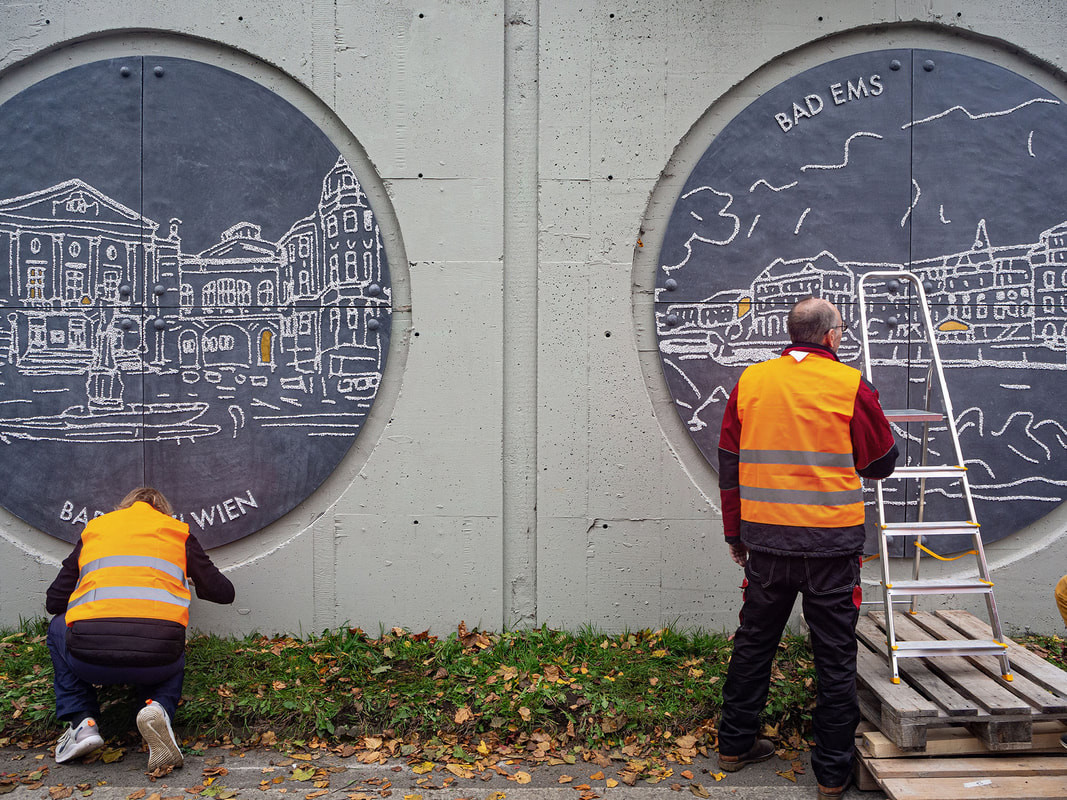 Právě práce s místními vizuálními odkazy a snaha volit materiál, který je vysoce odolný, a přitom dokáže být tvárný, se ukázaly jako ideální volba. Snad i proto jsou sloupy, vysoké 439 a 278 centimetrů s motivy místního hradu, kostela nebo madony, stále v identické podobě, v jaké byly instalovány. A to je v intenzivně využívaných prostorech typu nádraží skoro zázrak.