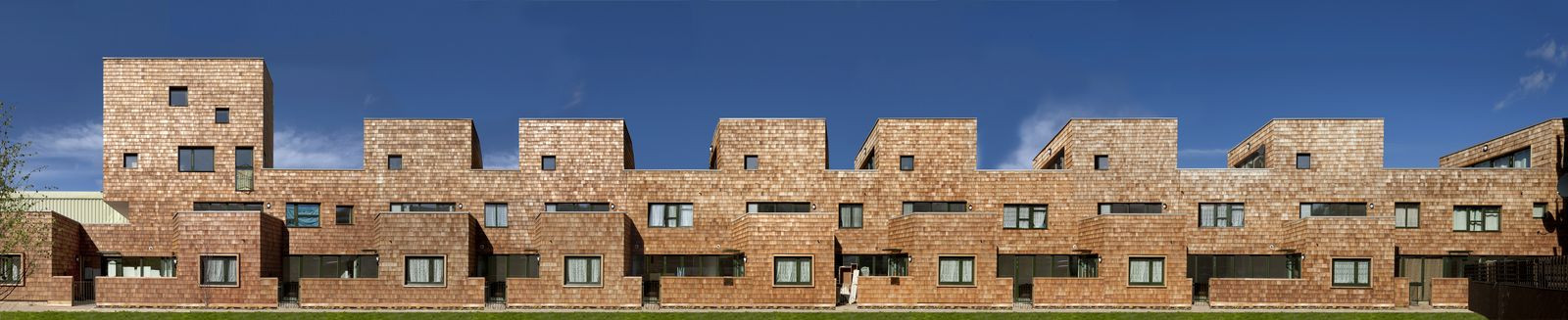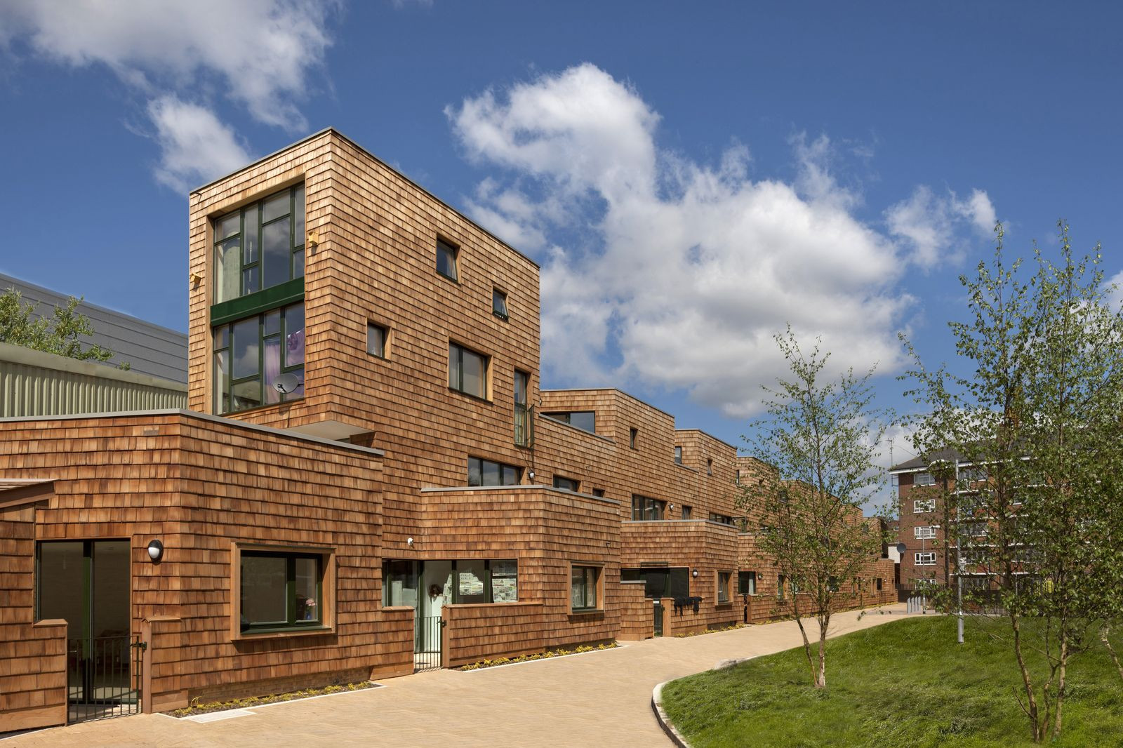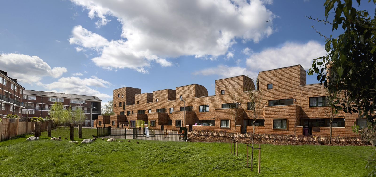 Nová řada domů je obložena dřevěnými šindeli, odkazujícími na historické stavitelství venkova. Komplexní profil budov je navržen tak, aby jejich obyvatelům poskytoval co největší míru oslunění. Ateliér Peter Barber Architects po celou dobu úzce spolupracoval se zadavatelem – londýnskou municipalitou –, aby design projektu úspěšně dostál svému společenskému záměru.