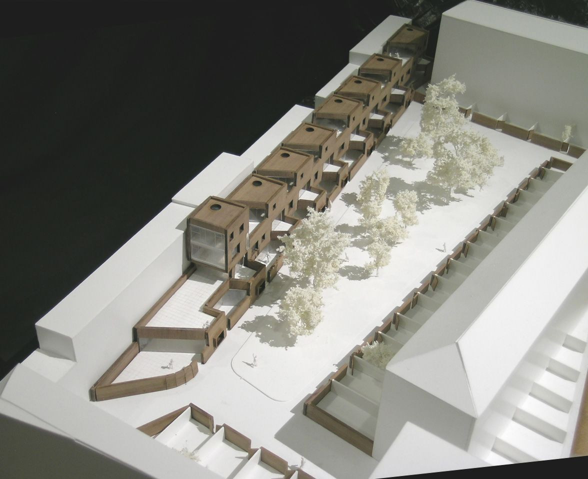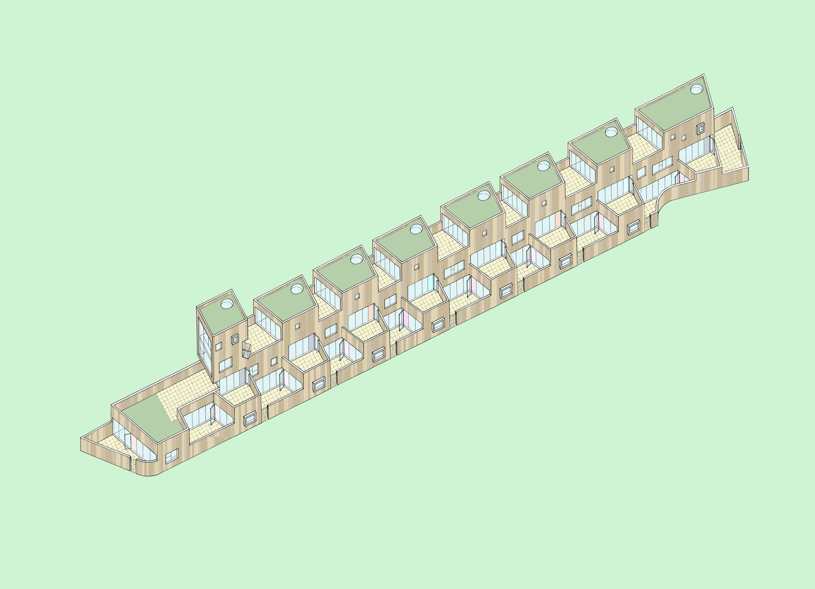 Komplex bydlení spojuje tenká ozubená terasa podél západní strany domů. Ta zároveň tvoří předěl mezi byty a komunitní zahradou s dětským hřištěm, které je ze všech zbylých stran obklopeno stávajícím sídlištěm.