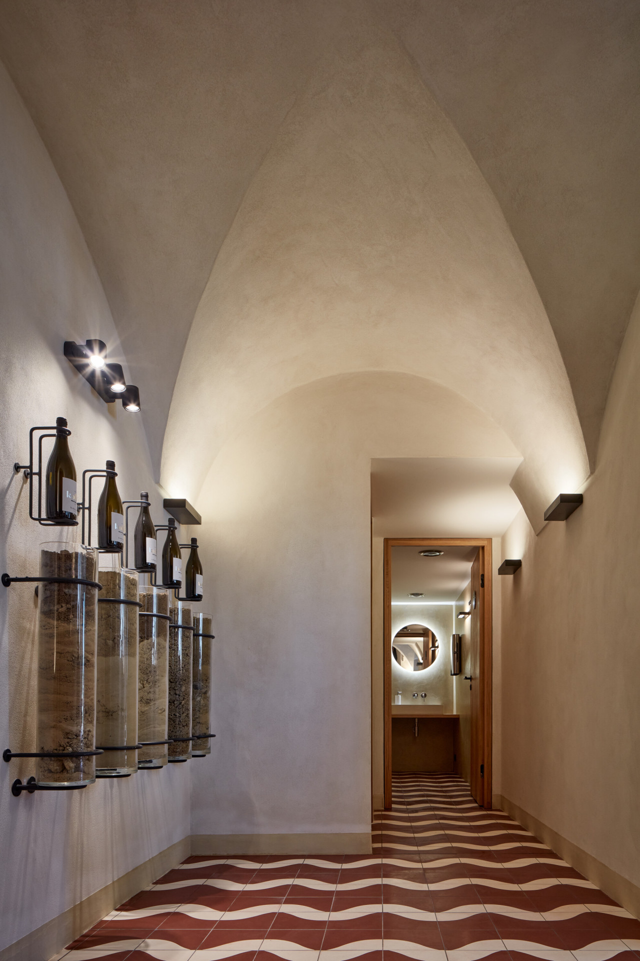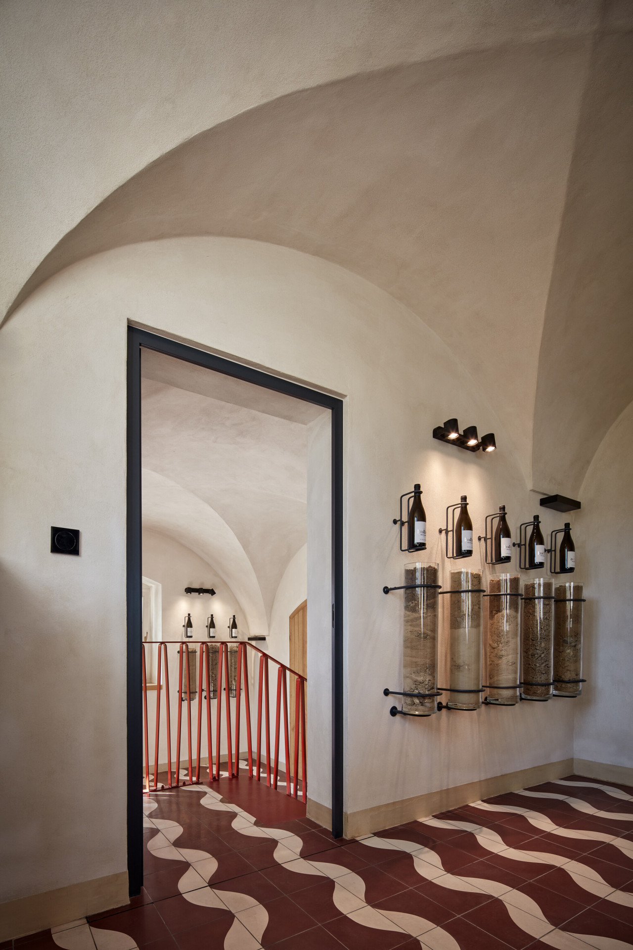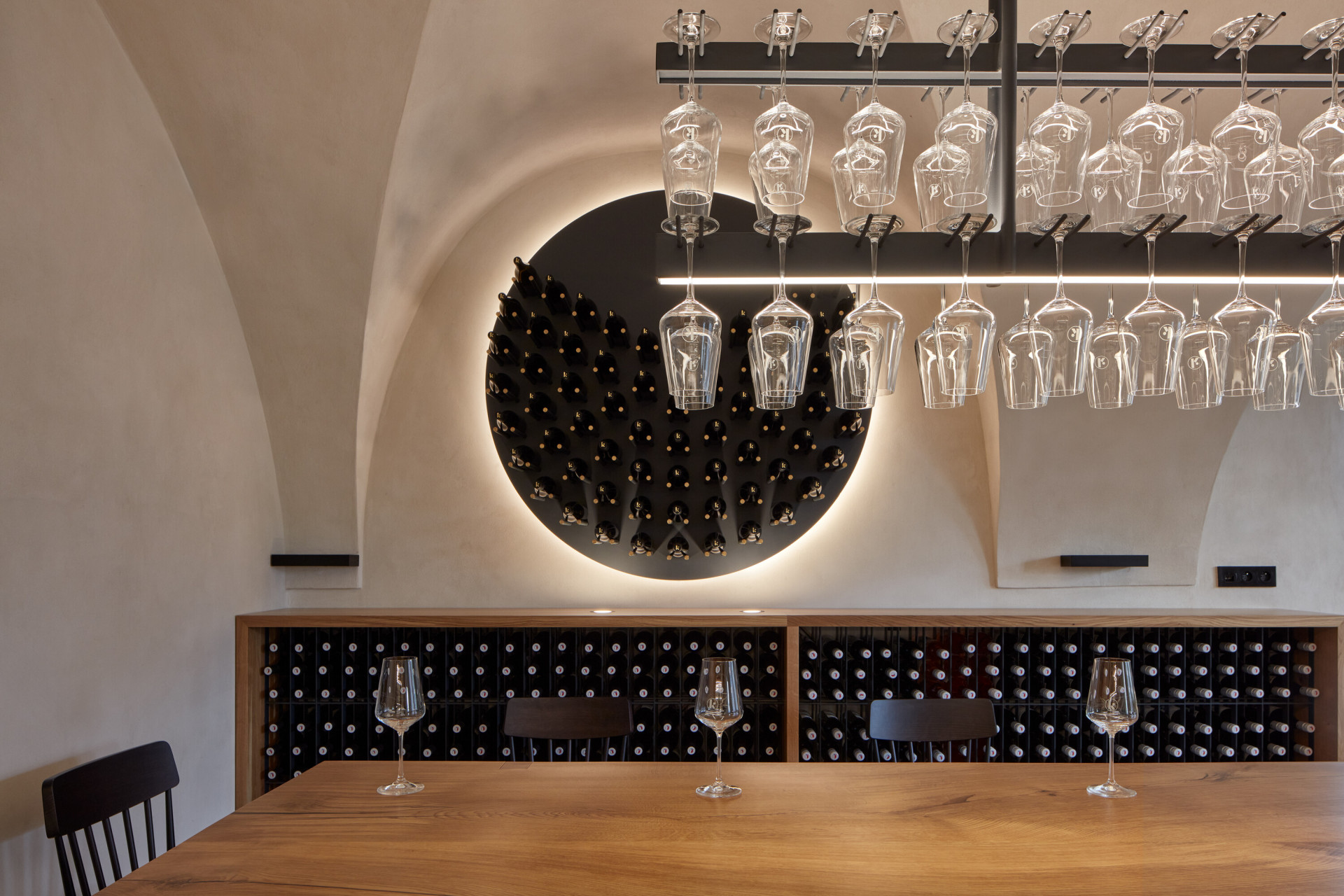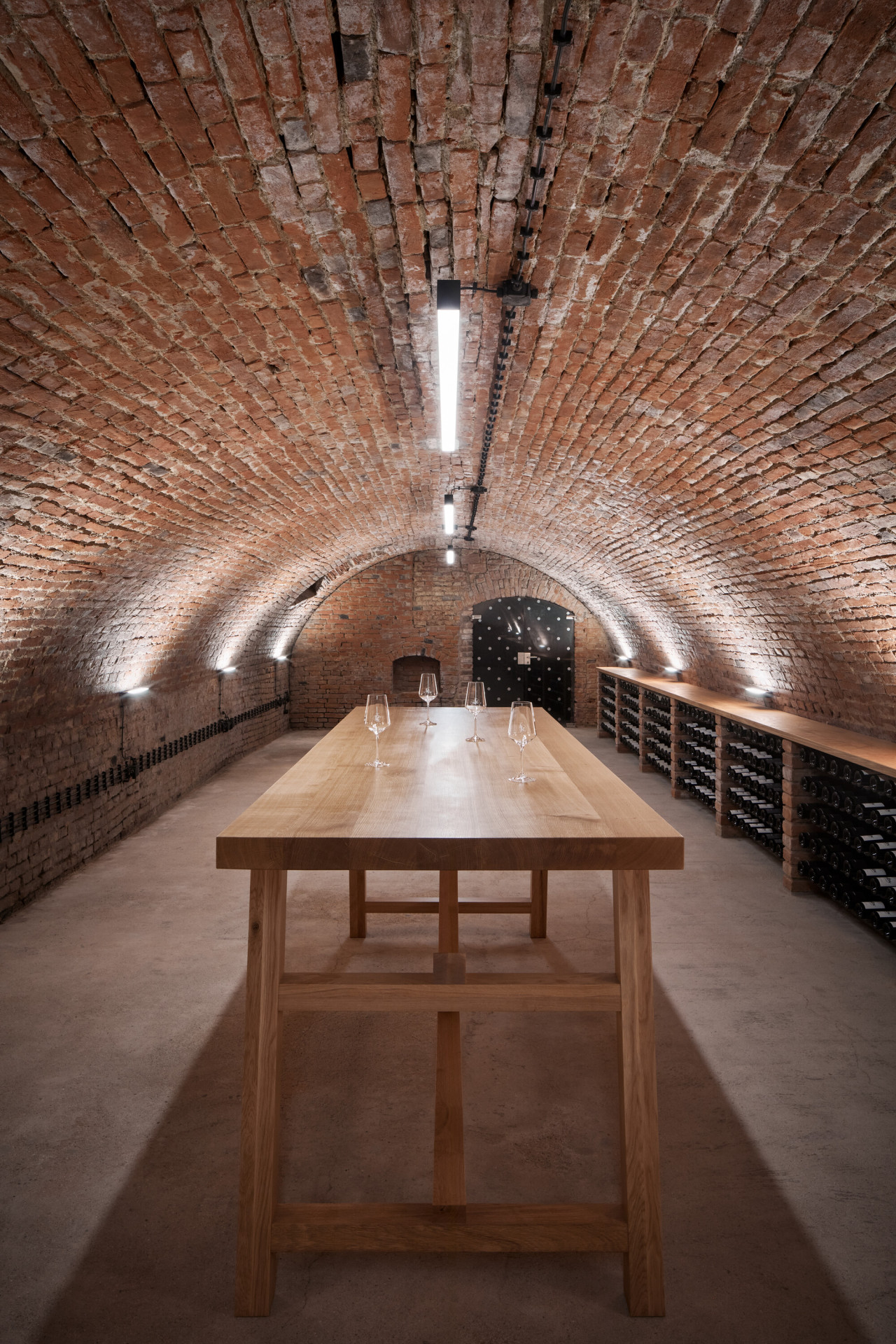 Předmětem jejich zásahu byla historická budova vinařství s rozlehlými sklepy a objekt z desátých let. Přidat měli suchý sklad a vybudovat wine bar, tedy posezení pro návštěvníky. Pro první navrhli novostavbu, druhé umístili pod klenby starého vinařství. Je tady masivní dubový stůl pro degustaci, vínem je inspirovaná také autorsky navržená podlaha – jsou na ní vlnky ve vínové barvě.
