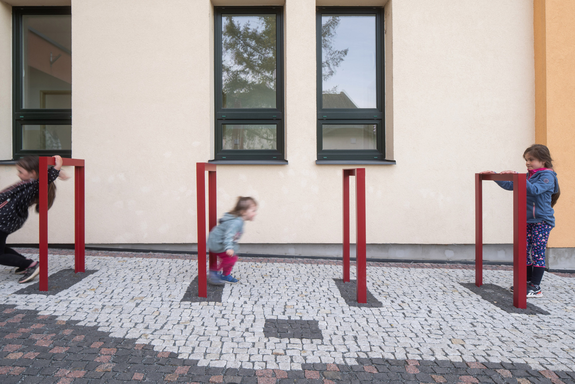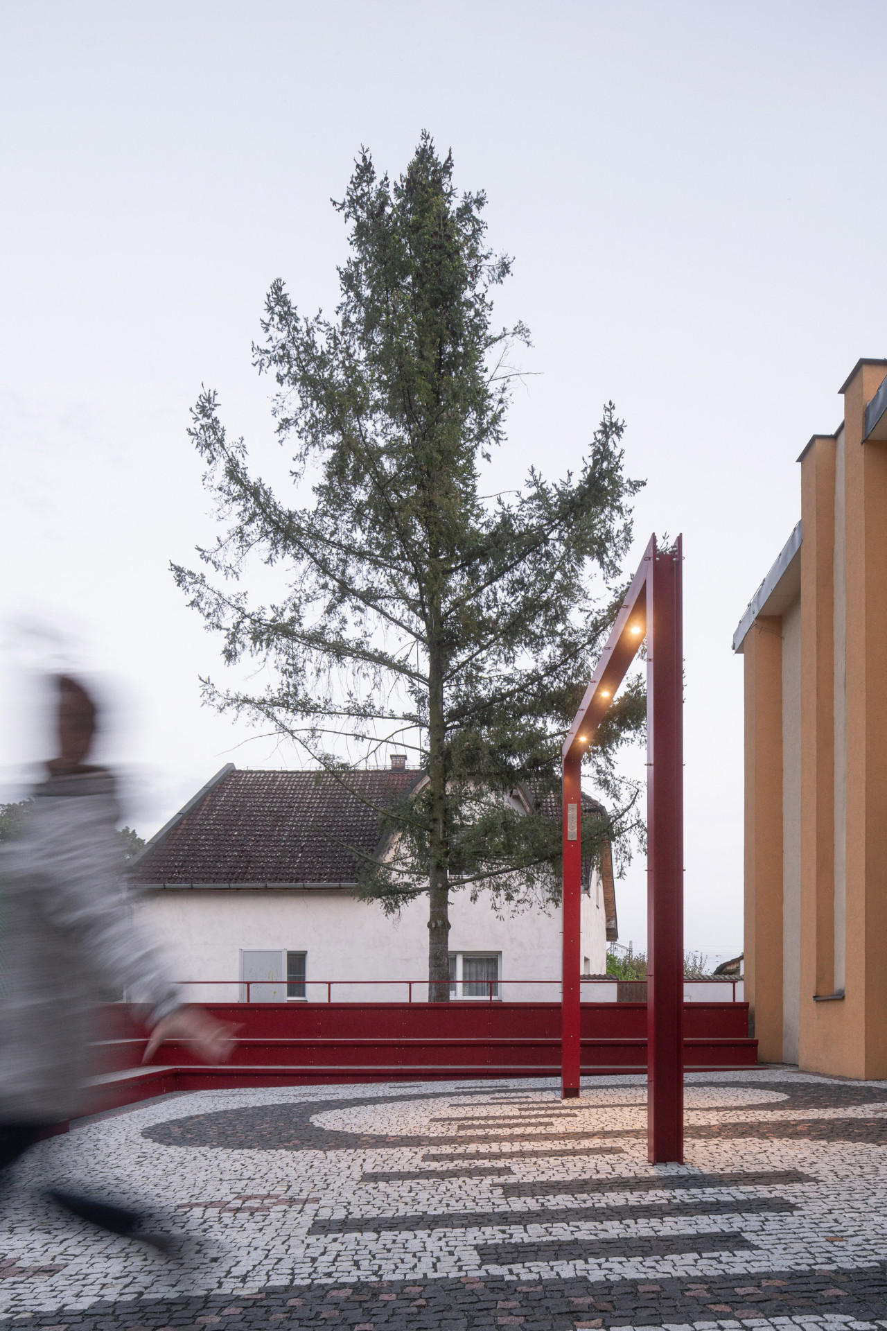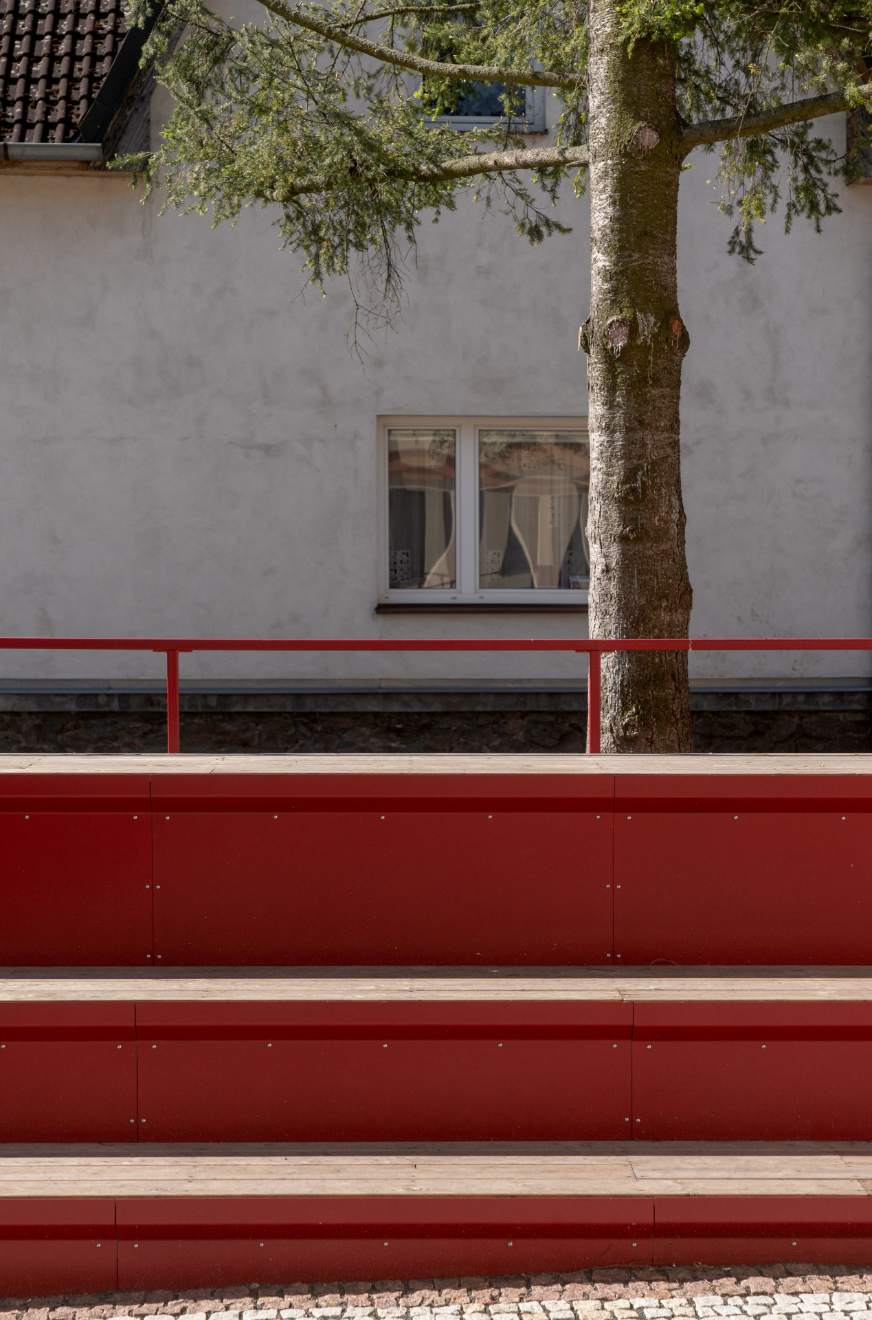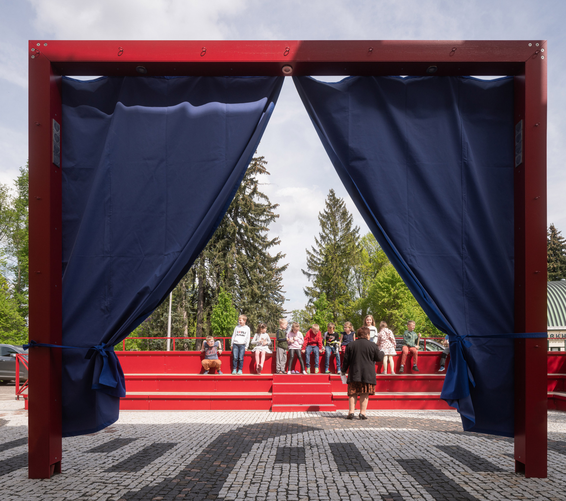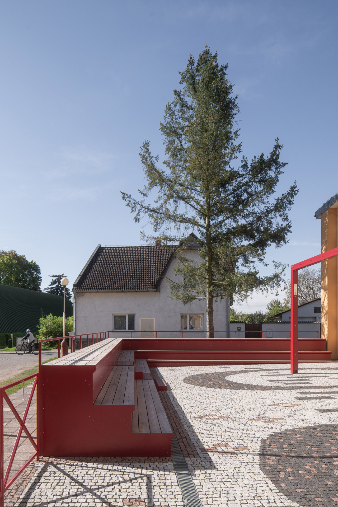 Mozaiku od chodníků odděluje rám – tribuna ve tvaru L, která je ostře červená. Stejnou barvu mají i odpadkové koše nebo stojany na kola. Uprostřed prostoru pak stojí velká brána−portál, kterým se dá probíhat a při speciálních příležitostech na něj pověsit opona nebo promítací plátno. A to je další účel prostoru, může fungovat jako jeviště, na kterém děti ze ZUŠ předvedou nacvičená představení.
