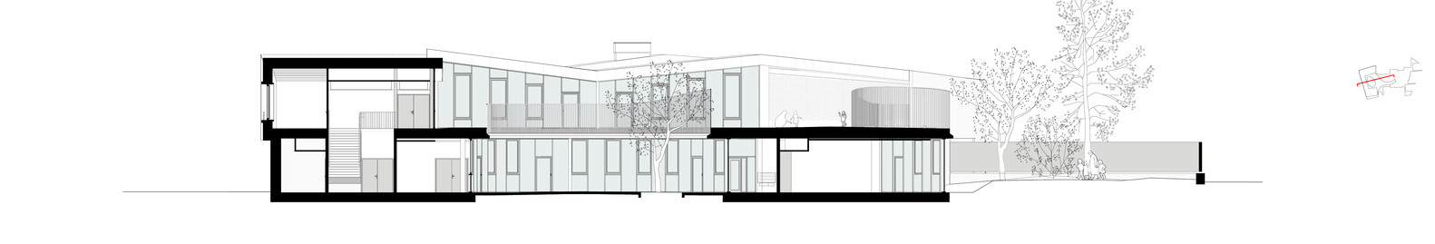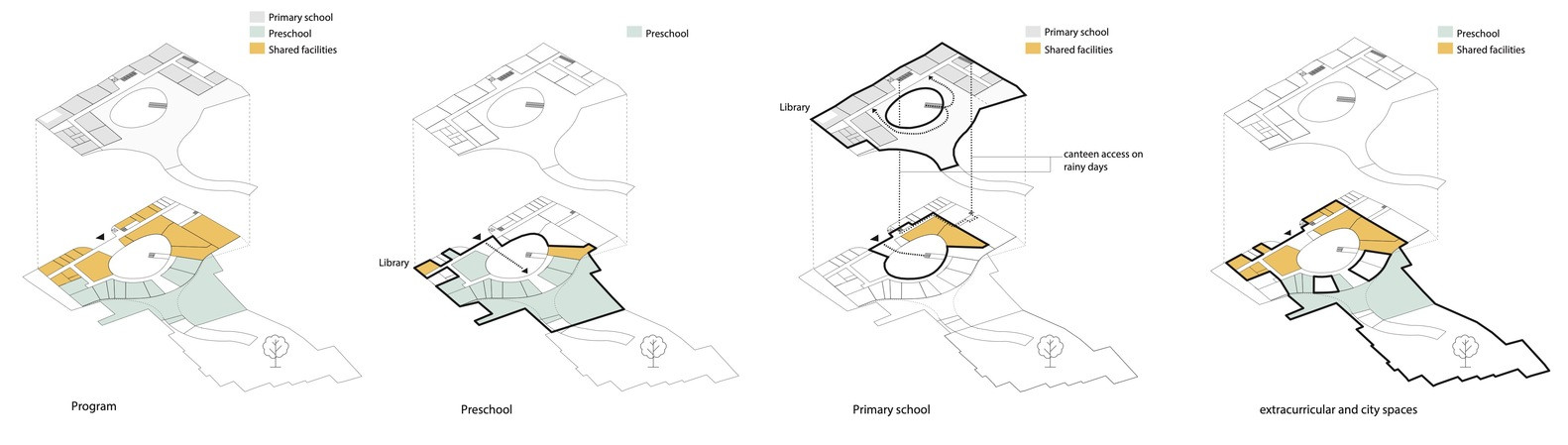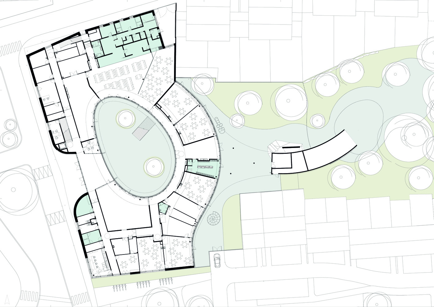Nejdůležitějším prostorem celého areálu je oválné nádvoří, do něhož se svými prosklenými stěnami otevírá většina učeben a dalších přízemních místností. Stává se tak hřištěm, centrálním náměstím, kde se potkávají všichni návštěvníci školy. Prostory umístěné v prvním patře jsou pak propojené s pochozí střechou, která podstatně navyšuje otevřený veřejný prostor.