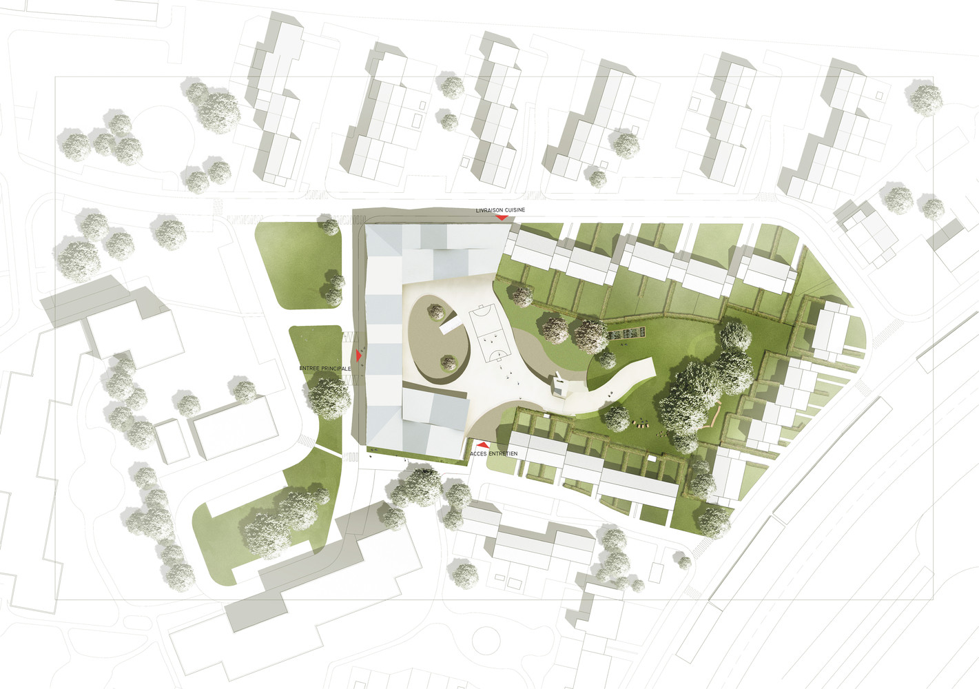 Architektura školy vychází přímo z místa, kde se nachází. Svým urbanistickým řešením hravým způsobem dotváří blok obytných domů. Autoři návrhu z pařížského studia SAM architecture se místním prostředím inspirovali i při výběru materiálů. Vzhledem ke specifické podobě domů v této čtvrti využili architekti pro fasády budovy směrem do ulice světlé cihly.