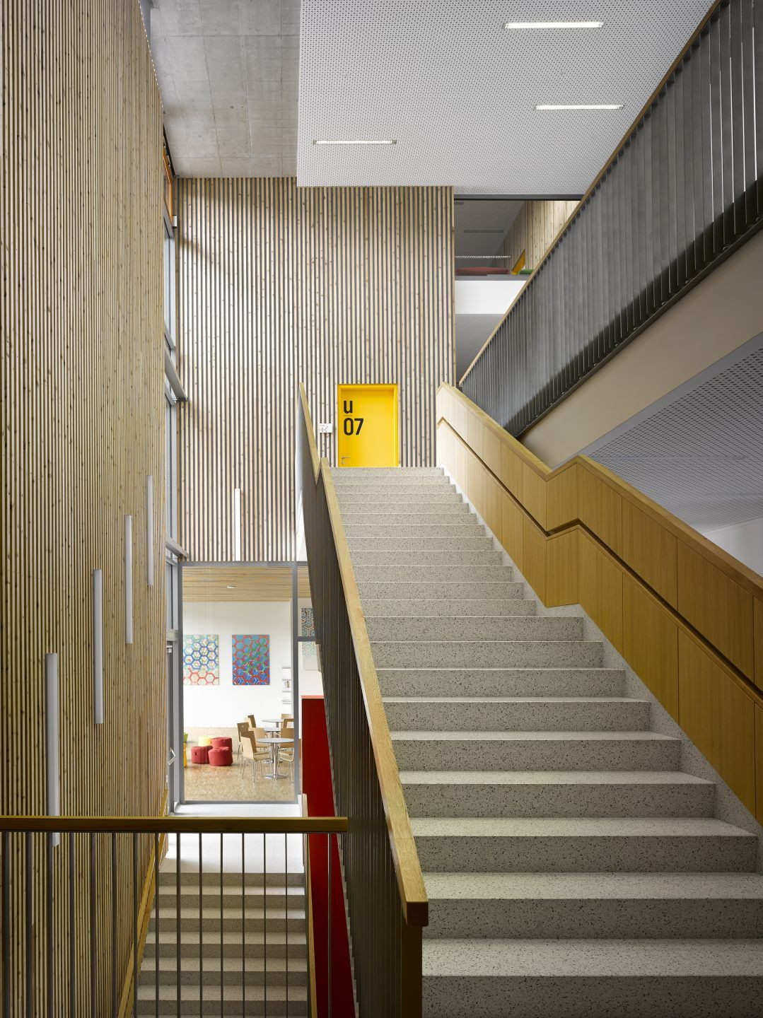 Druhá, dvoupodlažní část je tvořena souborem jednotlivých hmot učeben a kabinetů kolem široké středové chodby s odpočinkovými kouty. Obě části spojuje centrální středový prostor se schodištěm a polootevřeným prostorem multifunkční „knihovny“.