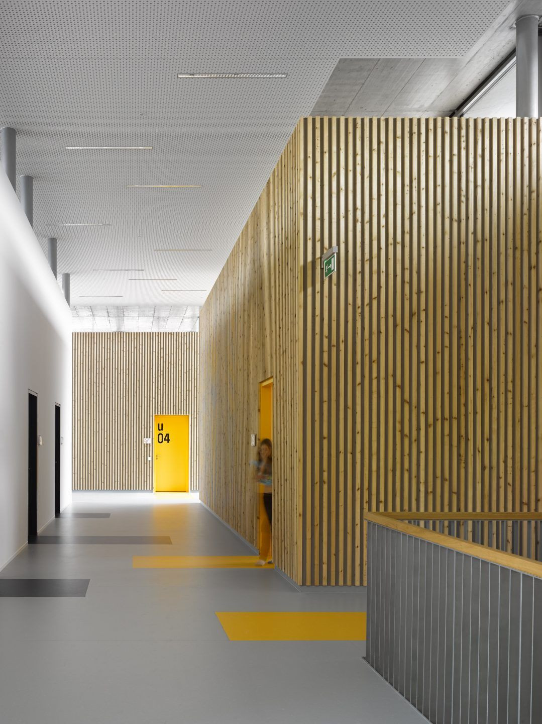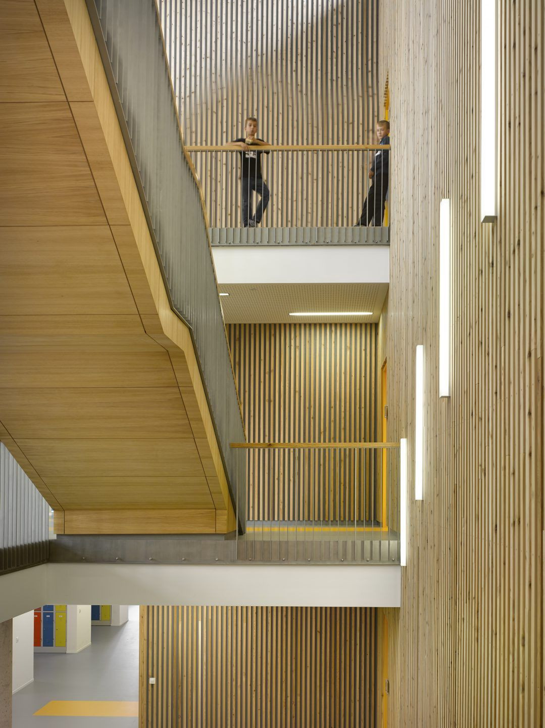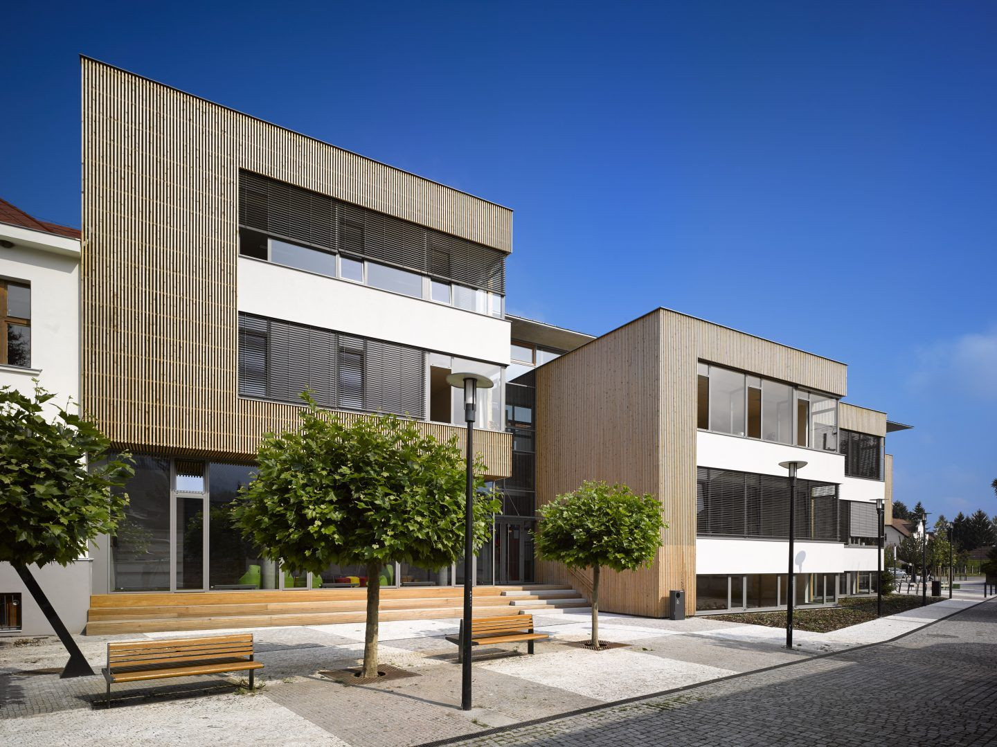Mezery mezi jednotlivými bloky přivádějí do vnitřních prostor školy denní světlo. Toto řešení přispívá k zmenšení měřítka a lépe kontextuálně navazuje na rozptýlenou zástavbu objektů na jihu a východě. Nová část budovy je se stávající budovou školy spojena v úrovni přízemí i patra. Navržené hmotové a provozní řešení je podpořeno volbou materiálů fasády. Jednotlivé bloky učeben jsou obloženy dřevěnými latěmi z červeného cedru. Technické řešení tohoto obkladu spolu s návrhem veřejné zeleně v parteru počítá s pokrytím části dřevěné fasády popínavou zelení.