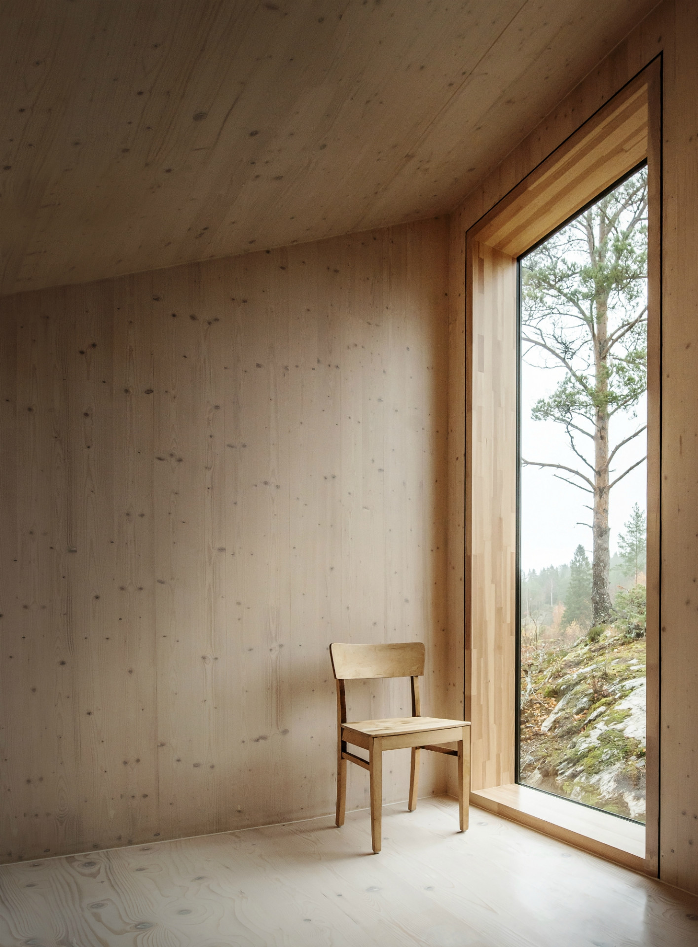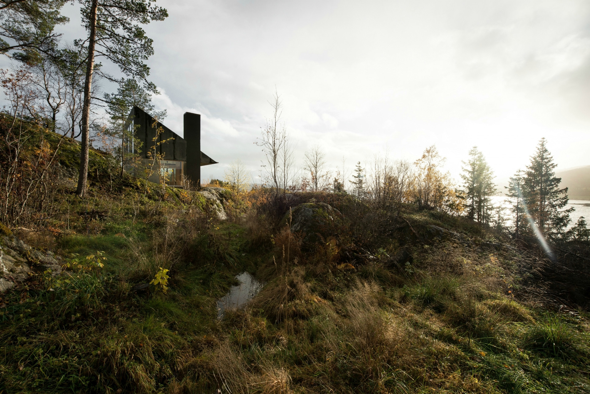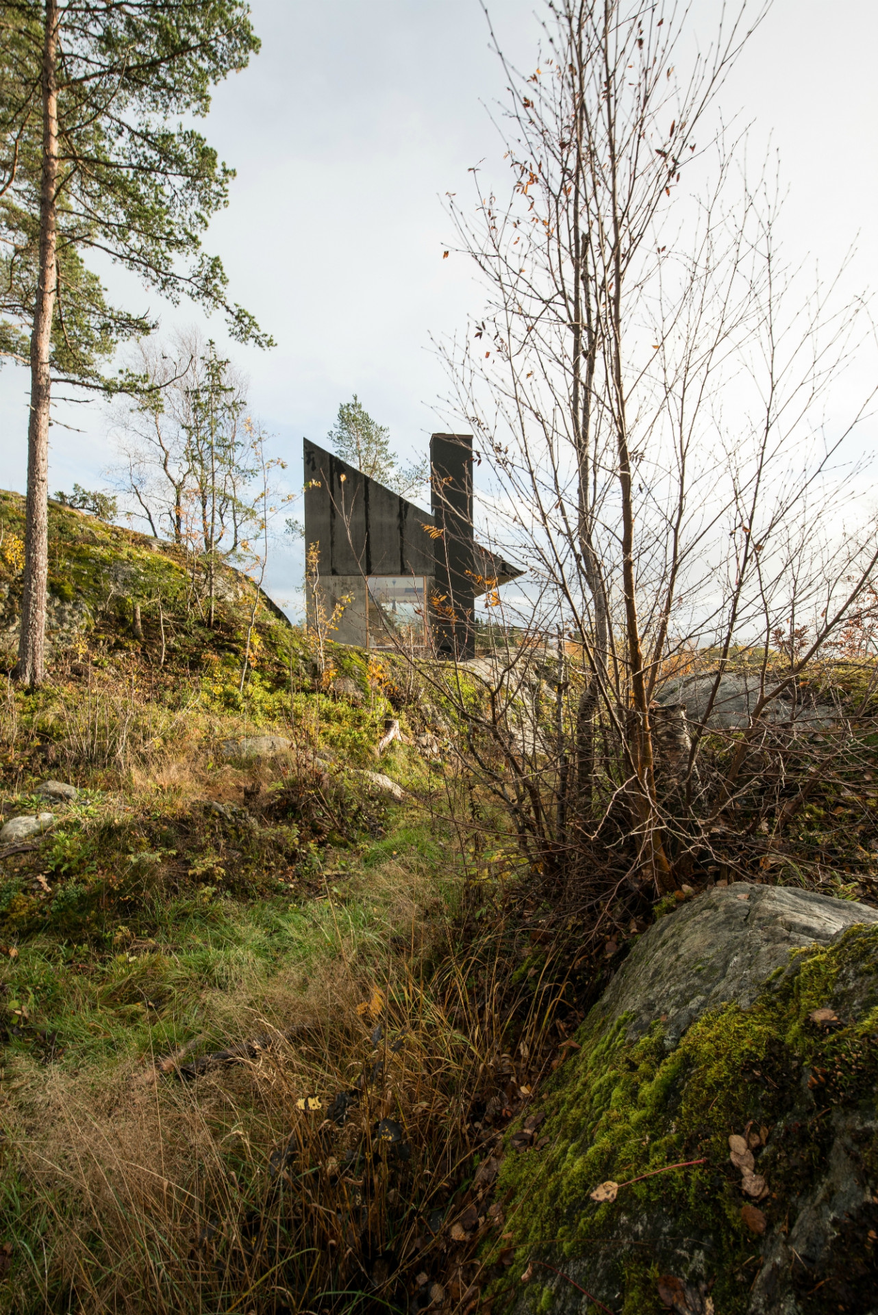 „Kabina je inspirována terénem pozemku a okolní přírodou. Skála nacházející se přímo na tomto pozemku se stala přirozenou zadní částí samotné budovy a poskytla jí jakýsi přírodní přístřešek,“ vysvětluje jeden z partnerů architektonického studia Sanden + Hodnekvam Architects John Sanden. „Norové mají obecně rádi turistiku a svůj volný čas hodně tráví venku. Když se pak při vycházce zastavíme, abychom si dopřáli chvíli odpočinku, je takové chráněné místo přesně tím, co hledáme. U chaty jsme usilovali o stejnou prostorovou kvalitu – přístřešek, který navozuje pocit ústraní.“