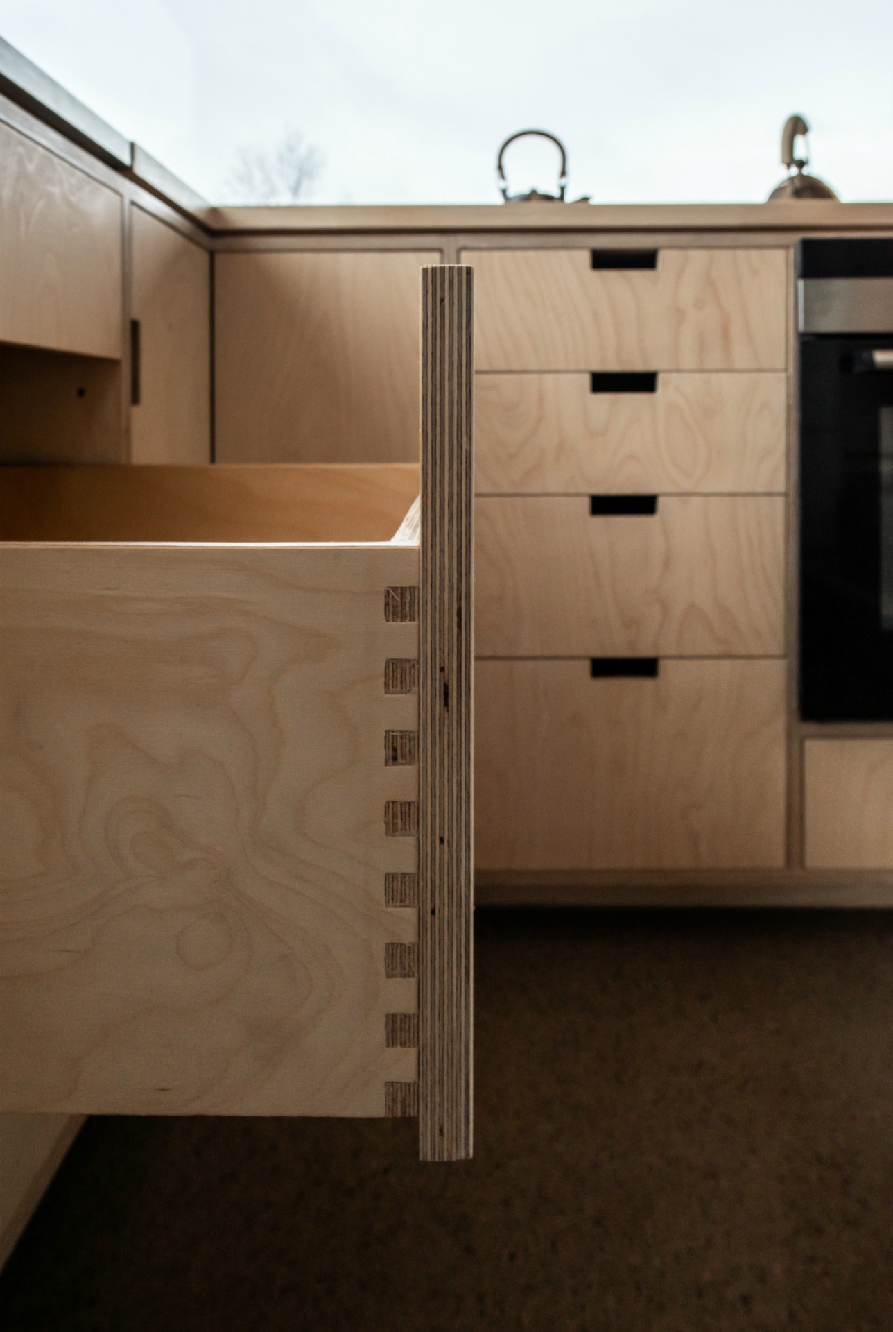V interiéru najdeme především povrchy ze světlého přírodního dřeva doplněné o odhalené betonové konstrukce stěn. Architekti navrhli také veškerý nábytek, který z březové překližky vyrobil místní tesař. Za povšimnutí stojí i některé venkovní detaily z mědi, která postupem času získá charakteristickou patinu. Průčelí chaty tvoří velká okna, která majitelům umožňuje kochat se dech beroucími výhledy i při pobytu uvnitř.