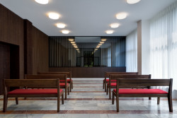 Obřadní síň dostala také neviditelné impulzy moderních technologií. O vytápění se starají infrazářiče umístěné ze spodní strany lavic a přívod elektřiny je veden v podlaze, to zamezilo rušení prostoru topnými tělesy. Dále je zde nová audio a vizuální technika, která zůstává velmi nenápadná.