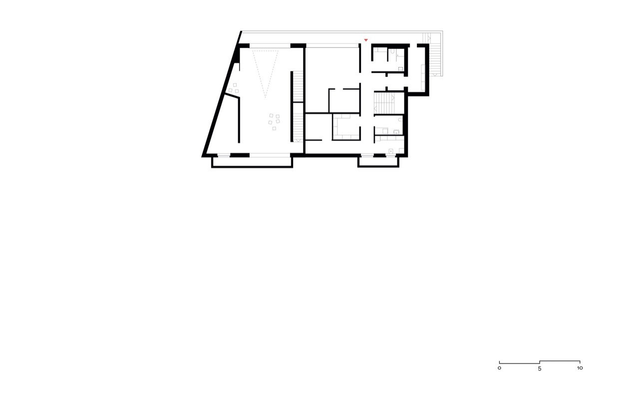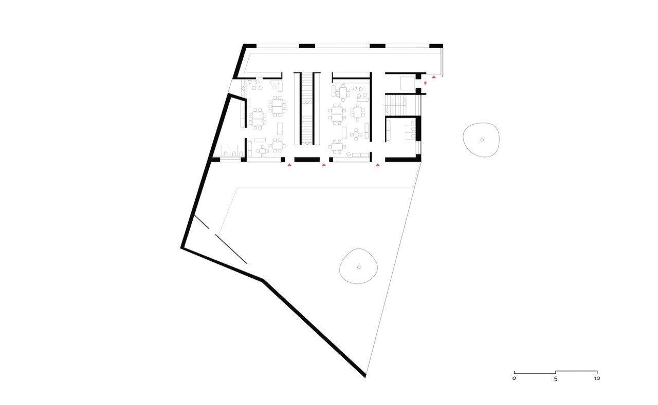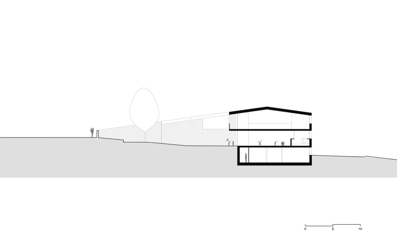 Italsko-švýcarské studio feld72 ale nesáhlo po konvenčním způsobu ohraničení pozemku. Zídka táhnoucí se po obvodu parcely se tady stává integrální součástí celkové hmoty objektu – kopíruje sklon přiléhající ulice, postupně se zvyšuje a plynule přechází v samotnou budovu. Architekti zároveň využili svažitého terénu k tomu, aby mohl vzniknout uzavřený prostor dvora, do kterého se budova školky otevírá.