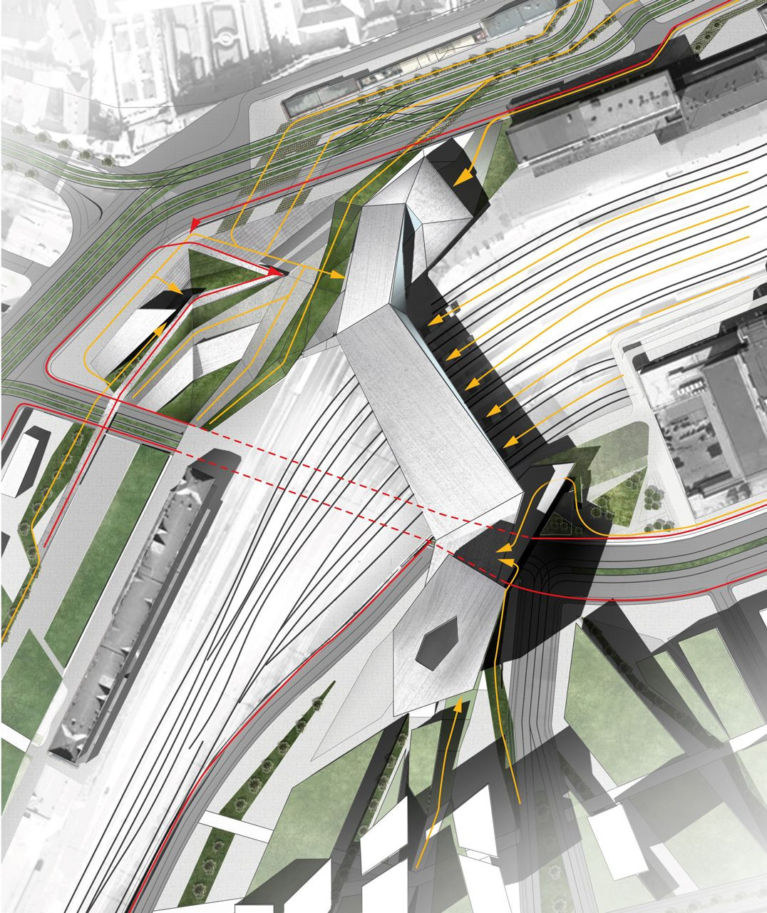Urbanistická struktura se ocitá mimo měřítko zástavby města Brna, jak dokládá například zaústění přemostění kolejiště do předprostoru nádraží. Tento propojovací prvek mezi severem a jihem zároveň slouží jako výpravní budova s horním nástupem do povrchového nádraží, v celoměstské kompozici však působí dojmem bariéry.