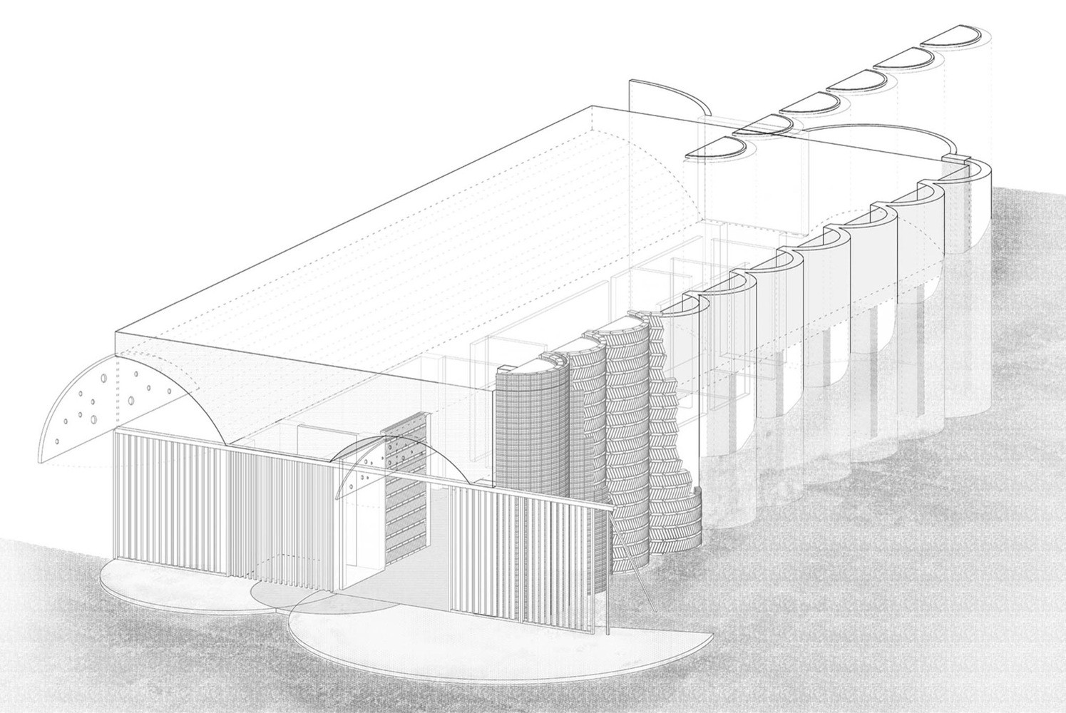 Klíčovou roli v interiéru hraje nepochybně světlo. Zděné půlválce podél budovy sice přivádějí denní světlo seshora, ale převážná část provozních prostorů je závislá na umělém osvětlení. Půlkruhový prvek se opakuje v podobě okna nad vstupními dveřmi nebo v podloubích nad jednotlivými segmenty stavby. Díky odhaleným betonovým konstrukcím se v interiéru zároveň rozehrává hra textur a světla.