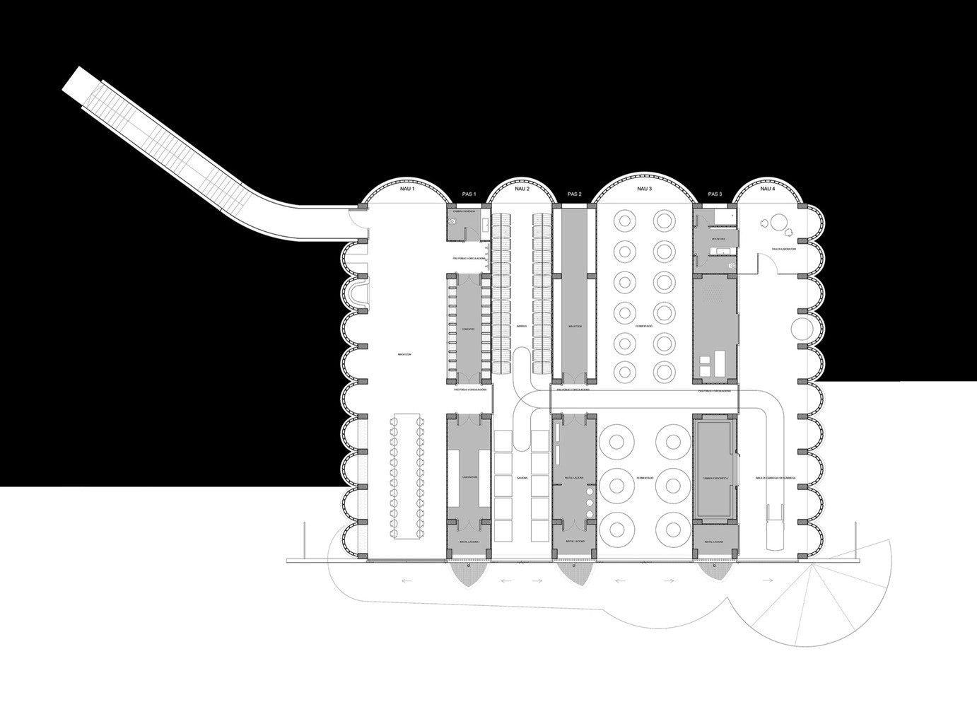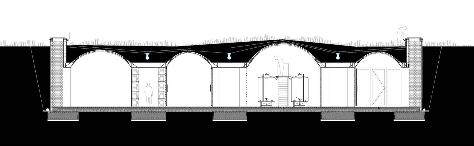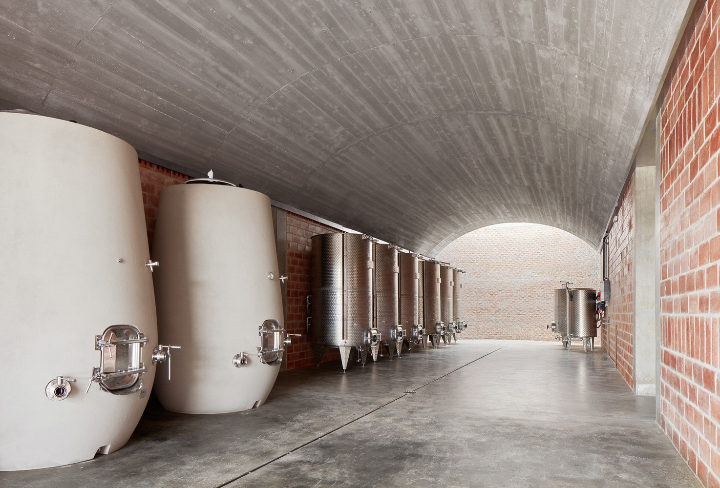 Vinařství je skvělým příkladem vyváženého vztahu s krajinou. Prostory, kde probíhá proces kvašení a zrání hroznů, jsou v přítmí a ideální teplotě díky půdě, do které je tato část budovy zapuštěná, oproti tomu otevřenost opačného konce vinařství nabízí pohled do krajiny.