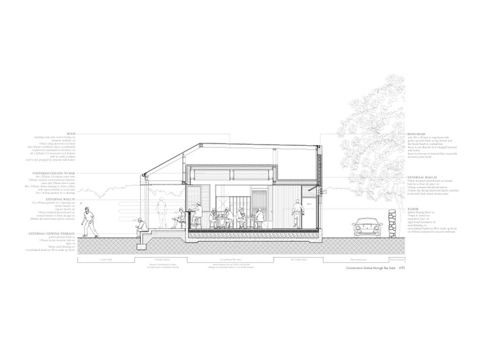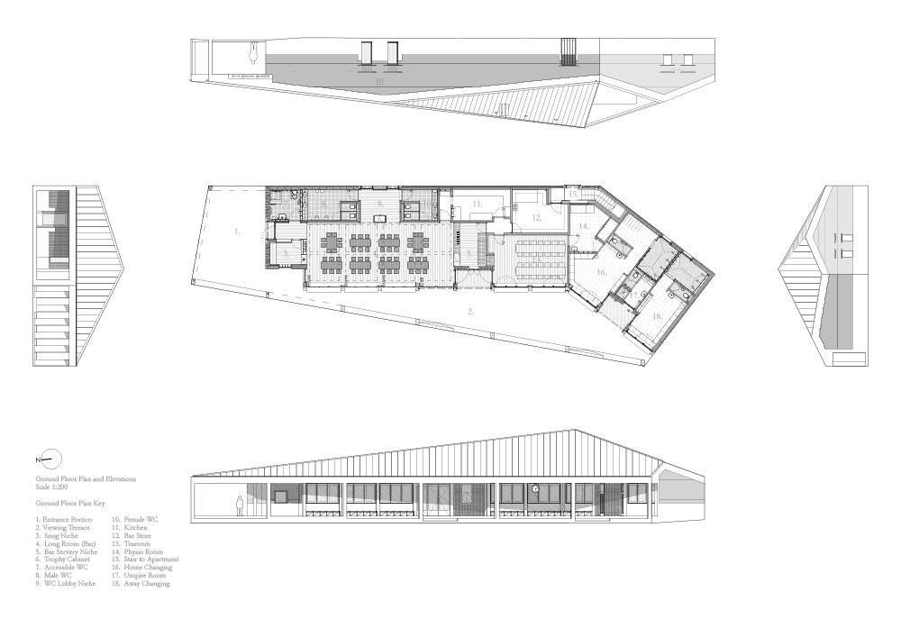 Široce se klenoucí střecha pod sebou kryje množství venkovních prostor, například uvítací portikus (rámující „náměstíčko“ na přístupové cestě) nebo vyhlídkovou terasu s proměnlivou hloubkou. Vnitřní prostory nekopírují objem střechy, jejich stropy naopak dodávají každé jedné místnosti odlišnou atmosféru. Centrální prostor baru, „hlavní místnost“, má výhledy orientovány směrem k hřišti a je obklopen 3 menšími výklenky s různými funkcemi.