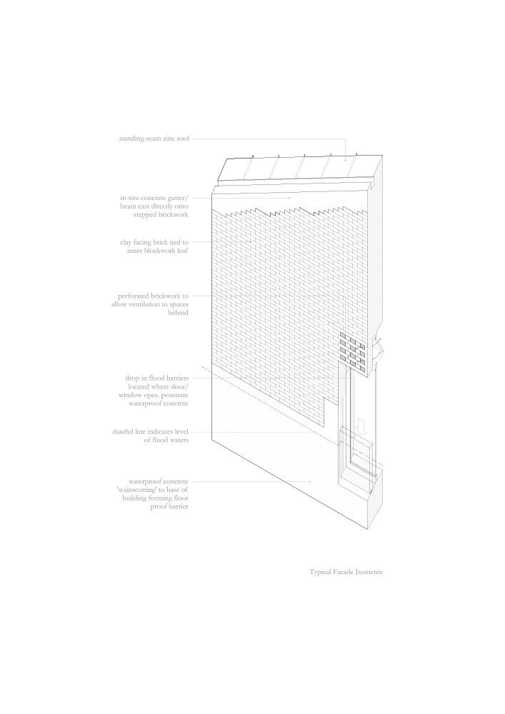 V reakci na povodňové nebezpečí byla budova vyvýšena několika schody a má vodovzdorné betonové táflování až po úroveň okenních parapetů. Ve dveřích mohou být vztyčeny mobilní protipovodňové zábrany. Nad touto úrovní je fasáda buď zděná, anebo s okenními otvory. Cihlové zdi slouží jako svého druhu permanentní bednění pro prstenec betonových trámů, putujících obvodem celé stavby.