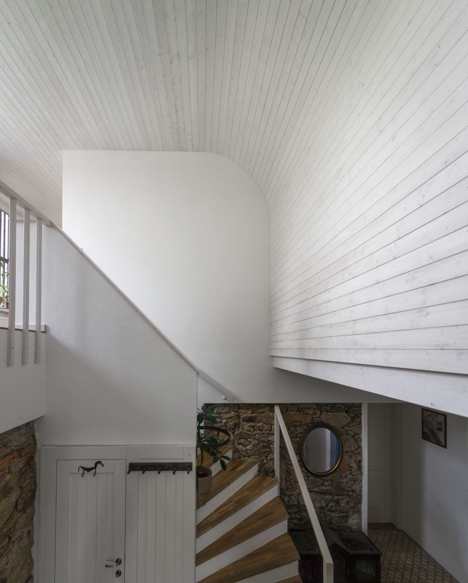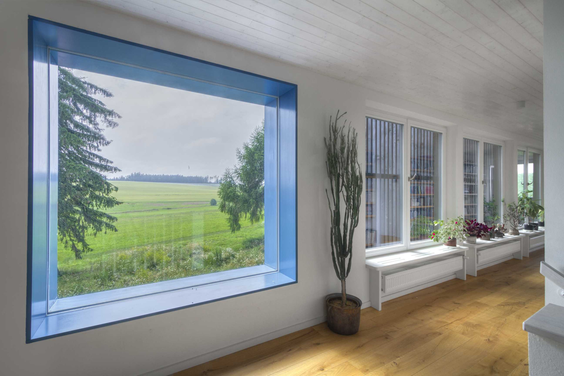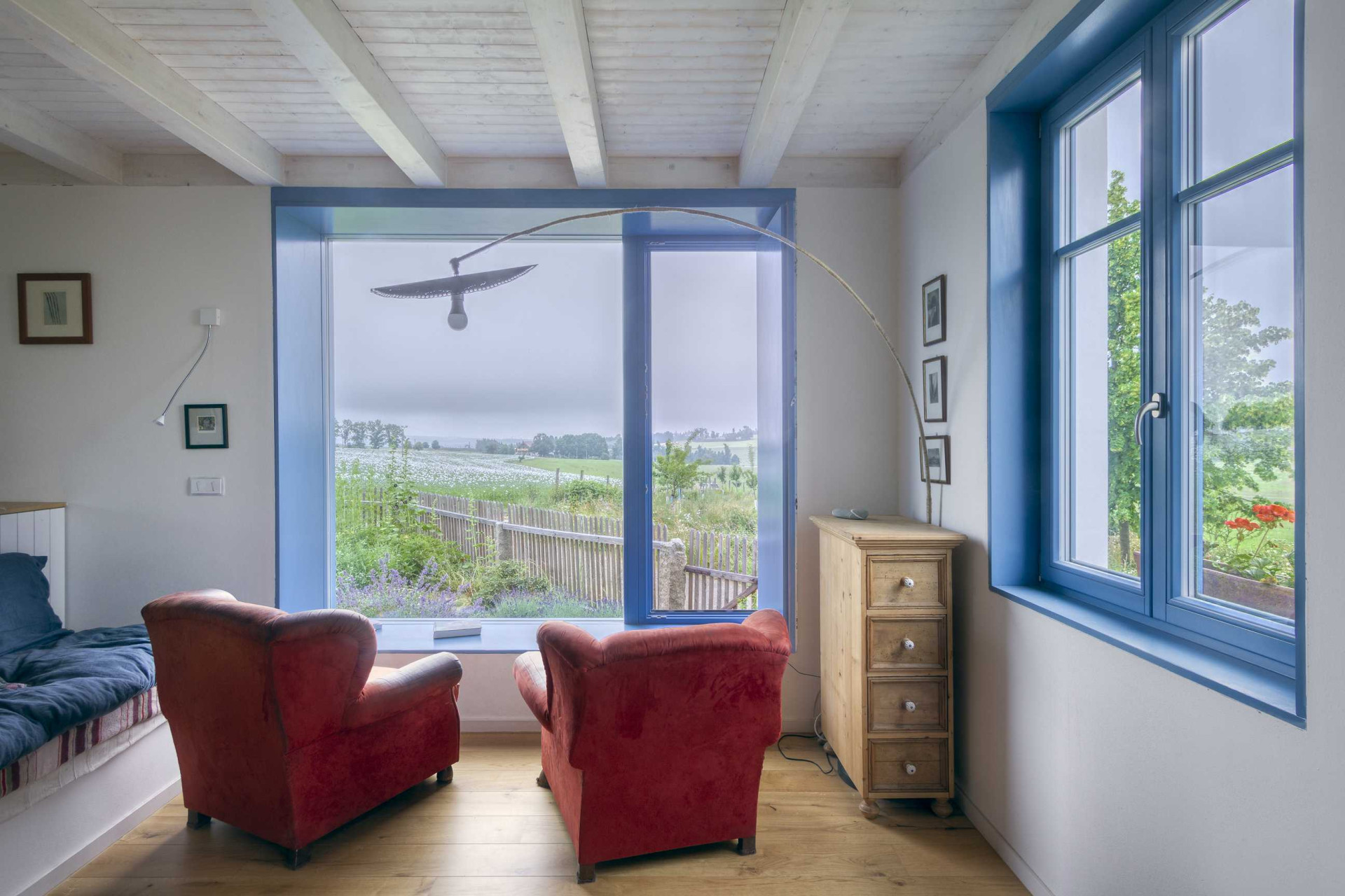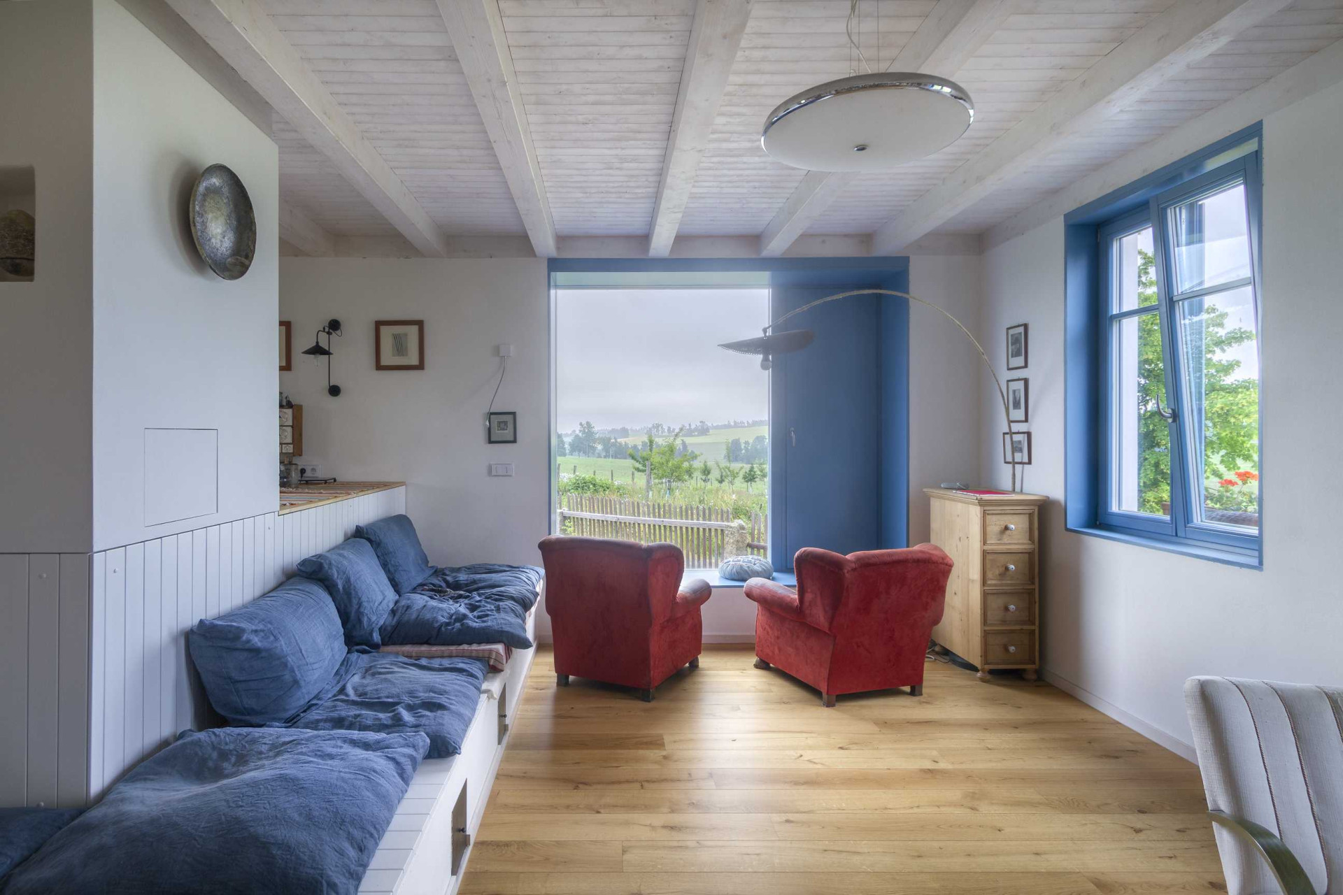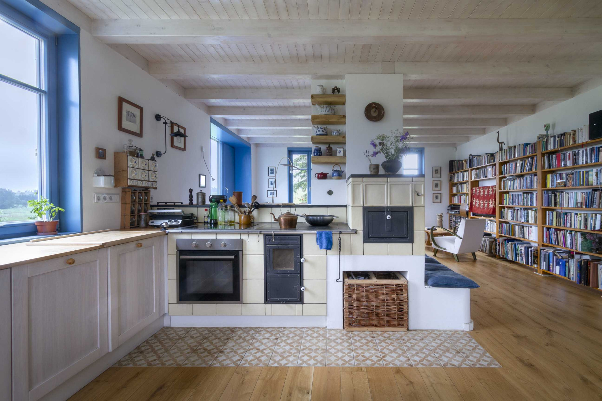 Nově vyzděna a izolována byla také část chalupy, aby mohl být obytný dům efektivně vytápěn tepelným čerpadlem. Chalupa je samozřejmým středobodem života rodiny. Velkou světnici rozdělují na kuchyň s jídelnou a odpočinkový kout s velkým oknem krásná kachlová kamna s vyhřívanou lavicí. V patře nad světnicí je situována hlavní ložnice, tři menší ložnice s velkou koupelnou se nachází v prostředním křídle.
