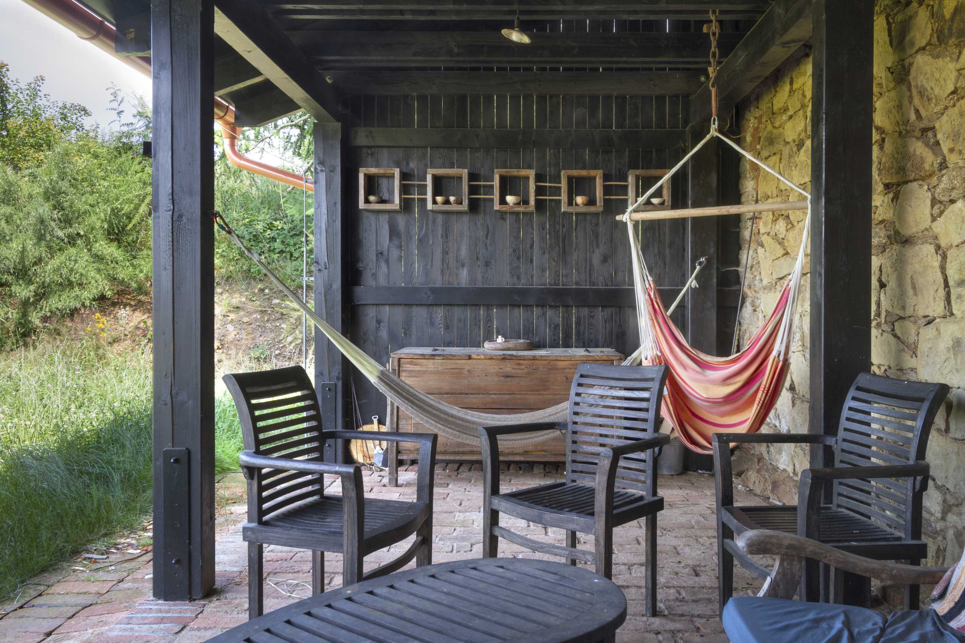 Aby mohla rodina trávit pohodlně čas také venku, navrhli architekti za domem zázemí letní kuchyně pod dřevěnou konstrukcí. Před chalupou našla své místo také bylinková zahrádka oplocená plaňkami, která je přístupná otevíravým křídlem ve velkém okně světnice. Stavení působí ve vysočinské krajině nenuceně přirozeným dojmem také díky zahradě, která je z větší části neoplocená a přechází tak volně v okolní louky.