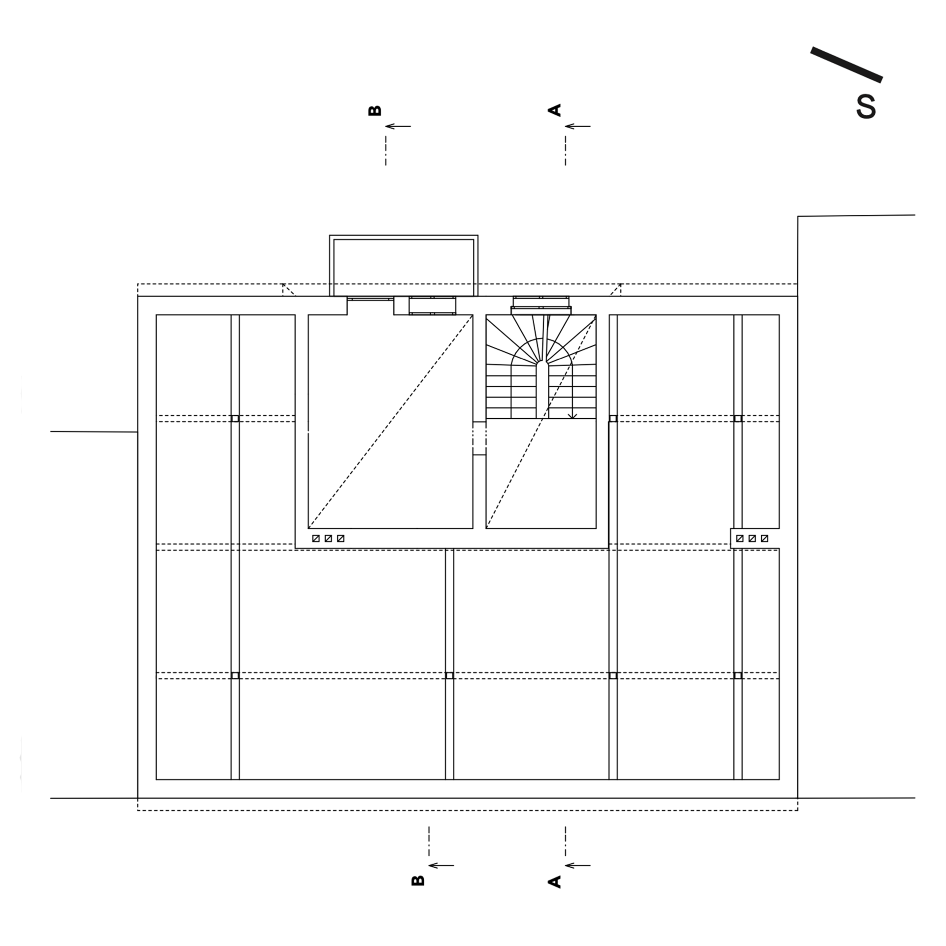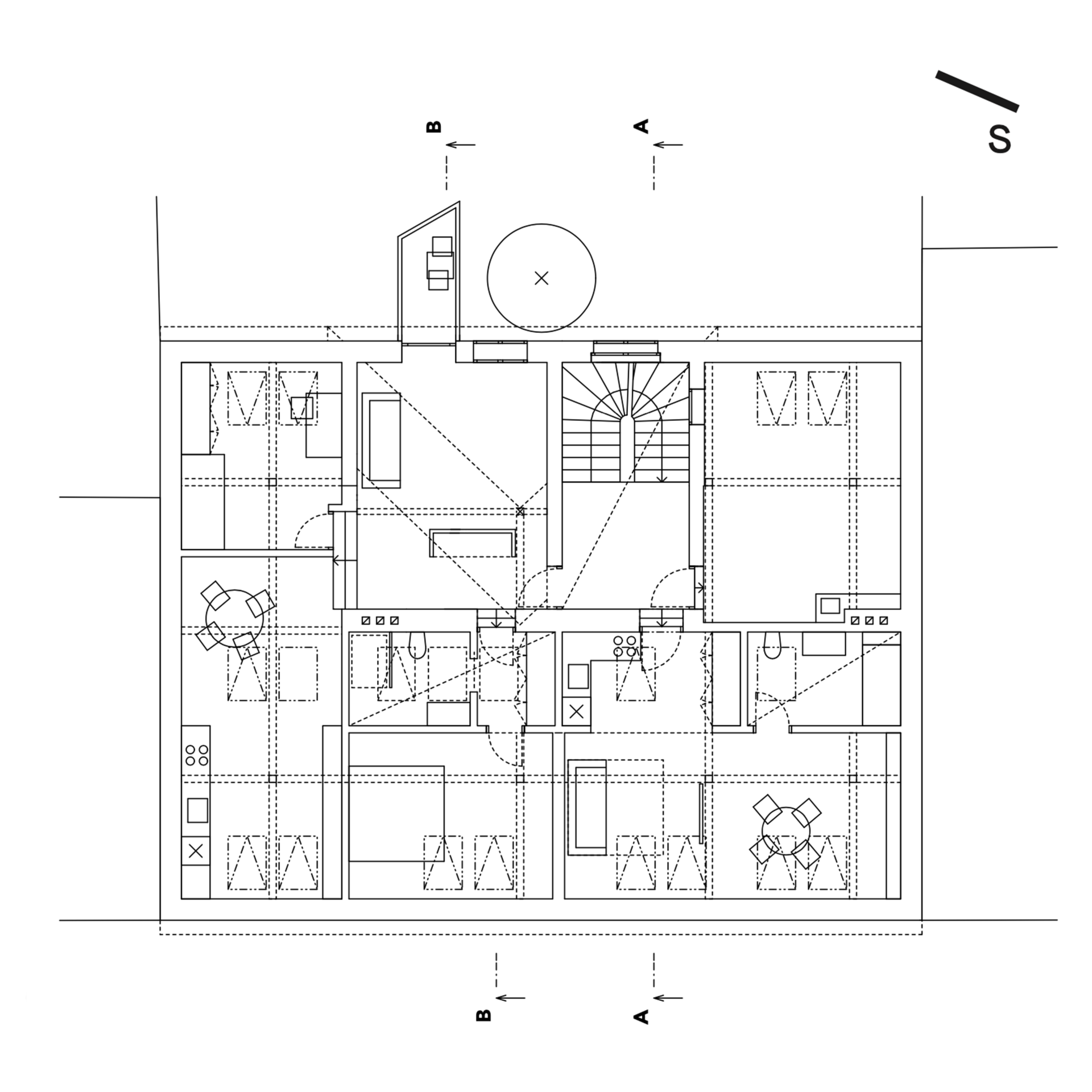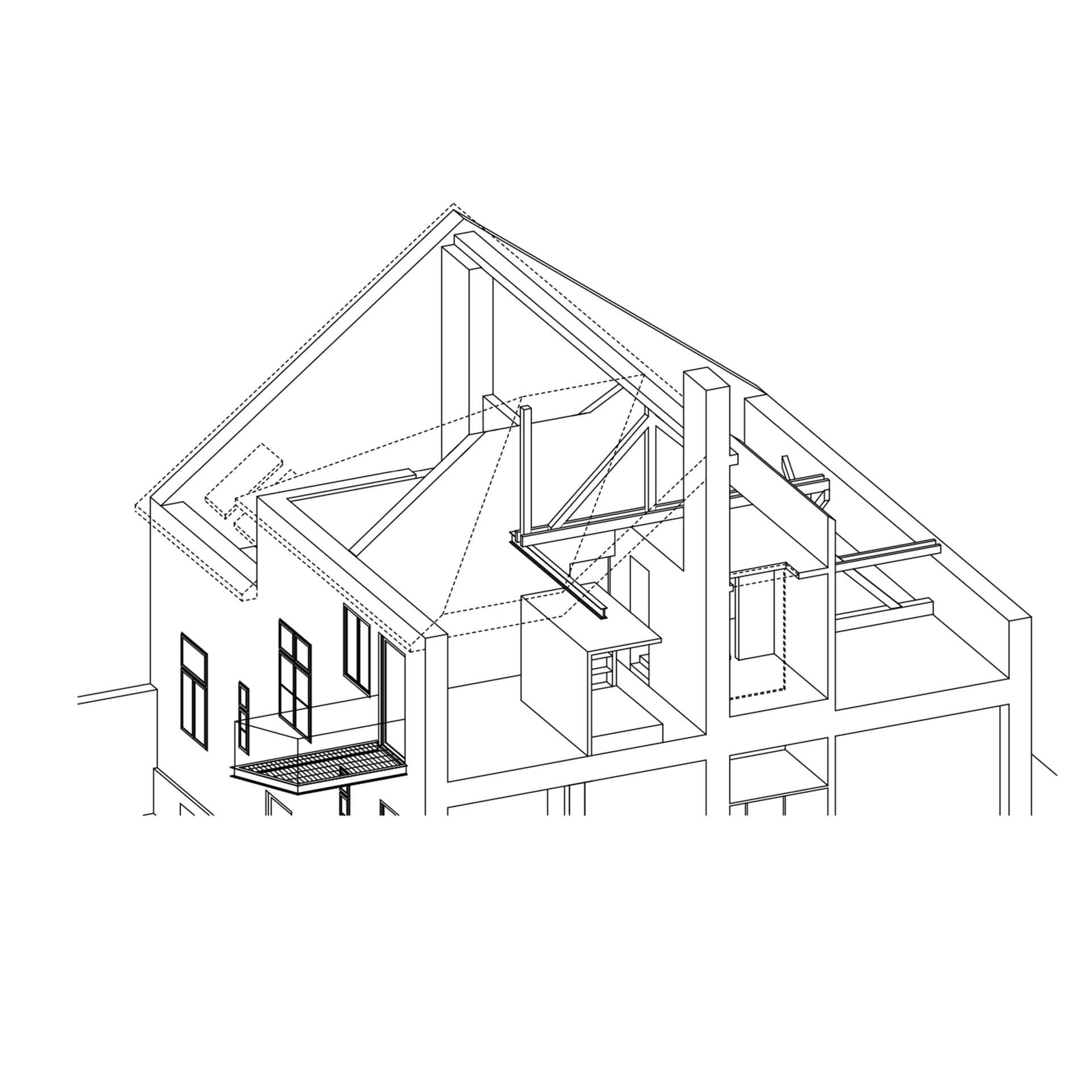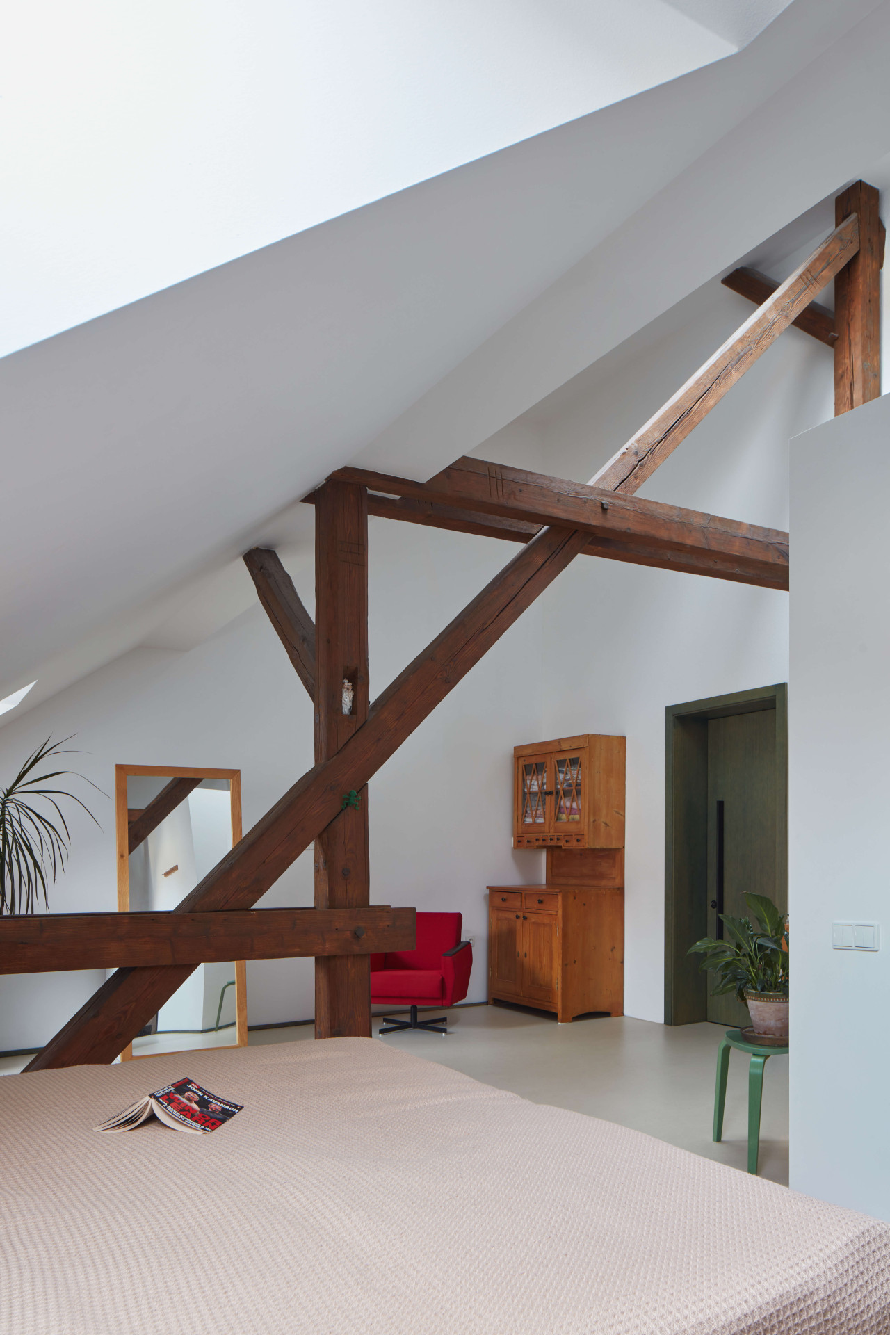 Dům lékárníka má dvě podlaží, druhé se nachází už v podkroví. Byty, se tady tak otevírají do krovu. Jeho trámy zůstaly přiznané, úrovně podlahy členité. Koupelny a šatny mají stejně jako v přízemním bytě formu vložených objemů. Dopadá do nich světlo seshora, oba podkrovní byty ostatně osvětlují hlavně střešní okna.