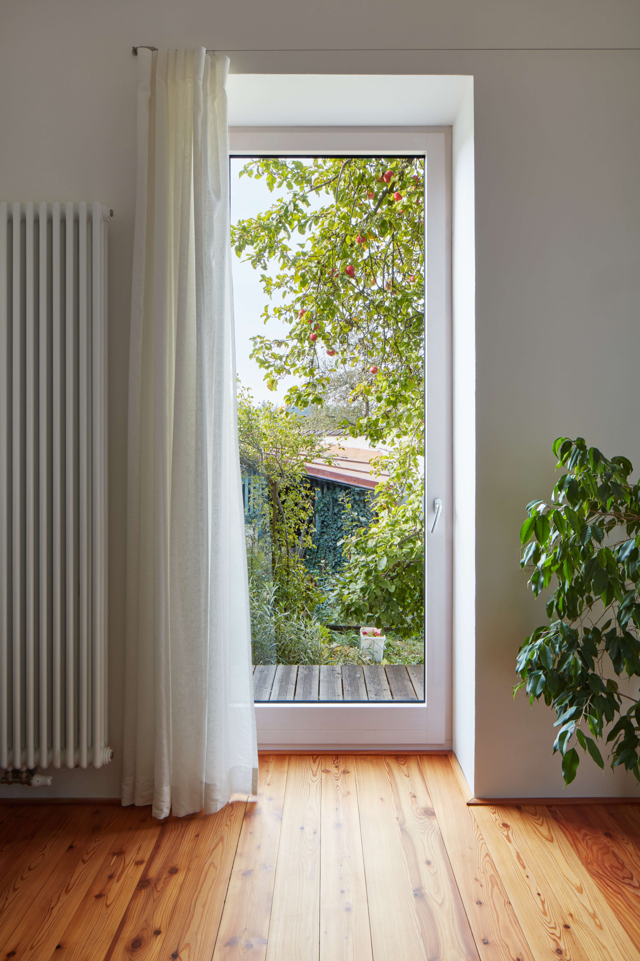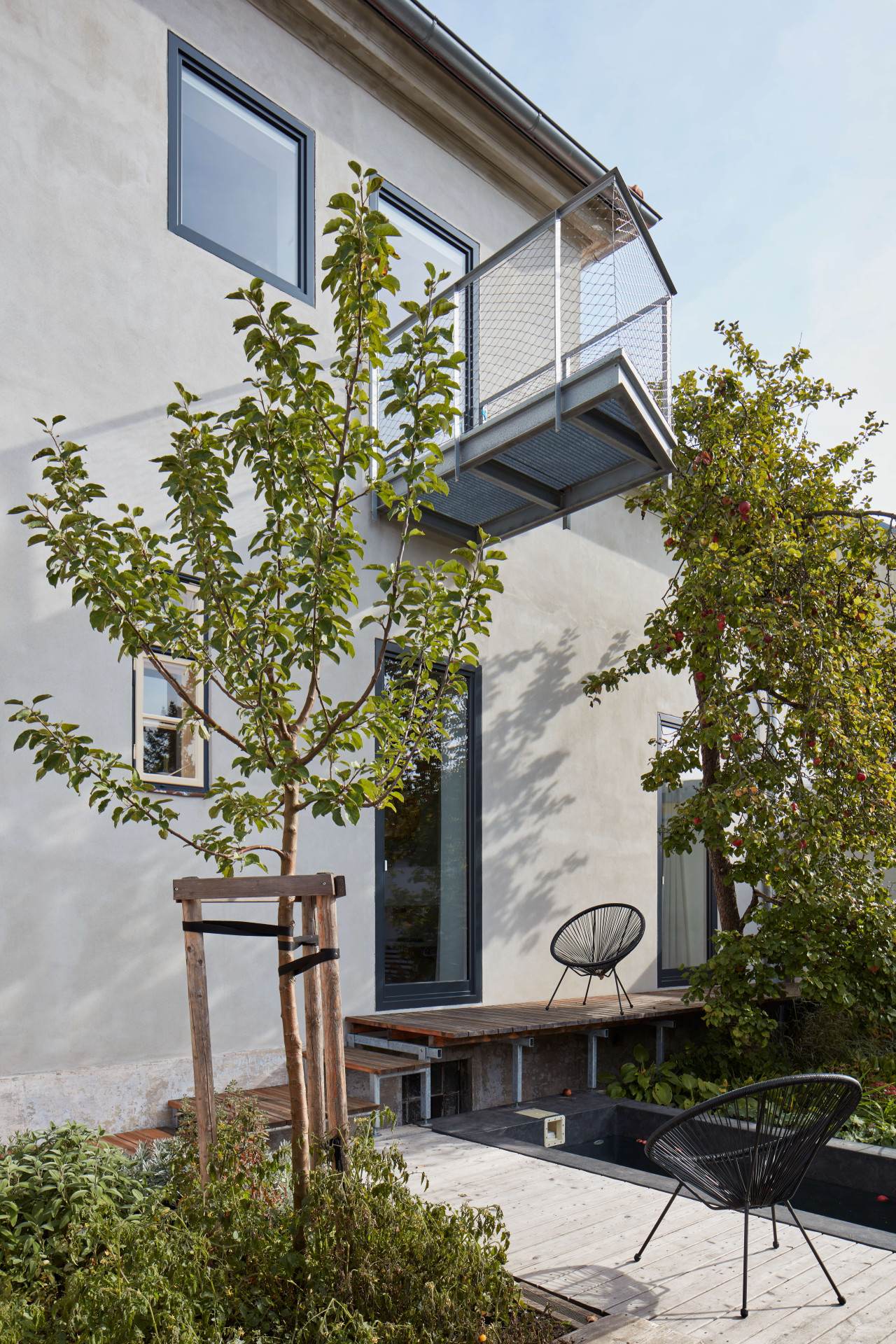 Komunikace starého s novým je pro projekt charakteristická. Někdy je postavena na kontrastu, jindy na jemnějších vztazích, vzájemná odlišitelnost je ale klíčová. To se propsalo i na zahradní fasádu, kde jsou vedle sebe umístěná okna v nových ocelových rámech a stará špaletová. Stejně jako bylo nutné proměnit dispozice, i okenní otvory byly místy potřeba větší či nové.