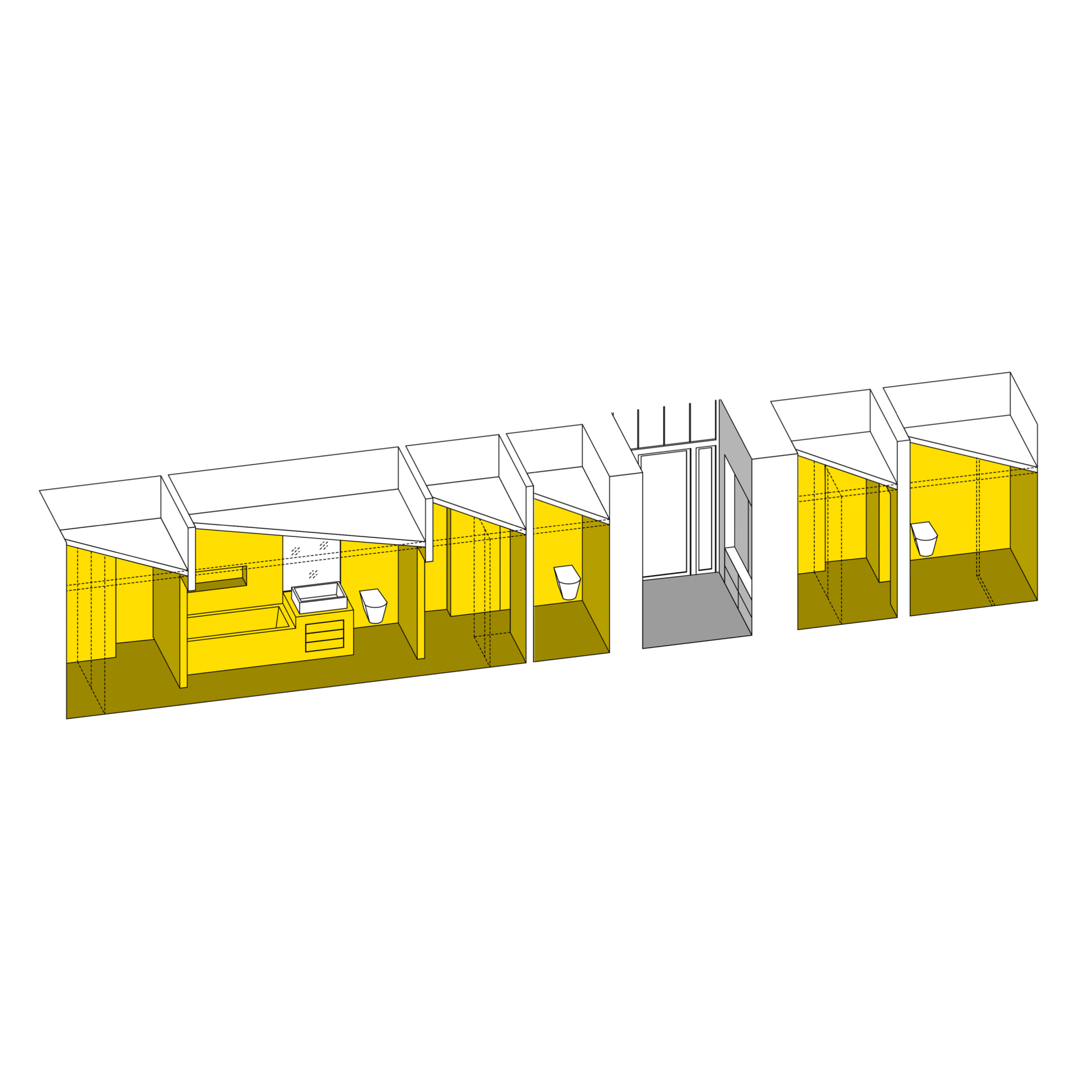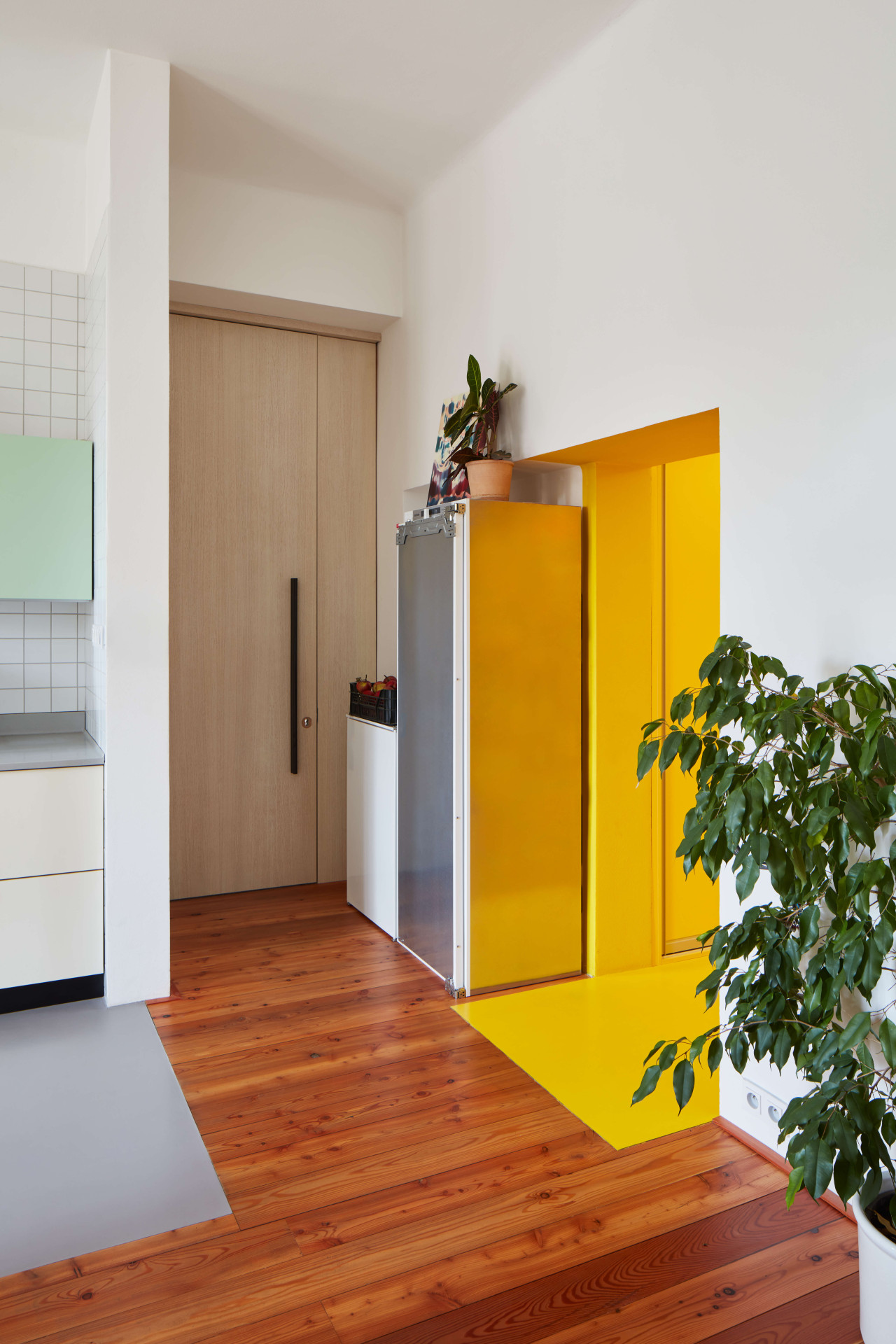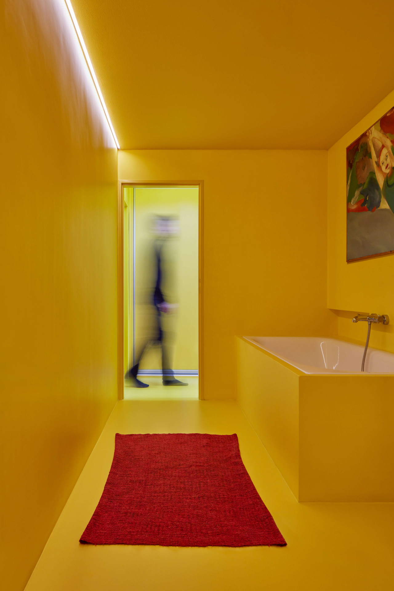Do jednotek bylo potřeba vložit nové funkce, hlavně koupelny. Ty architekti pojali jako moderní a jasně rozpoznatelné intervence. V největším bytě, který je v přízemí, má nově vložené jádro, které obsahuje kromě koupelny i šatnu, žlutou barvu. Vedou ním také dva průchody, úzké brány, kterými se vchází do pokojů za nimi.