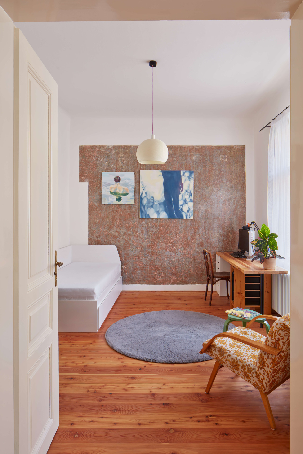 Prostorný obývací pokoj se nachází na straně druhé. Úzké průchody pocit z jeho velkorysosti ještě umocňují. Dřevěná podlaha se na jejich rozhraní setkává se žlutou barvou. Výrazných prvků je ostatně plný celý byt i dům. Mnohdy na sebe však nestrhávají pozornost prvky nové, ale ty původní. V přízemní bytě to jsou kachlová kamna, u nichž se dá hřát, když se člověk posadí na sedačku, která obíhá kolem dokola tlustého nosného pilíře.
